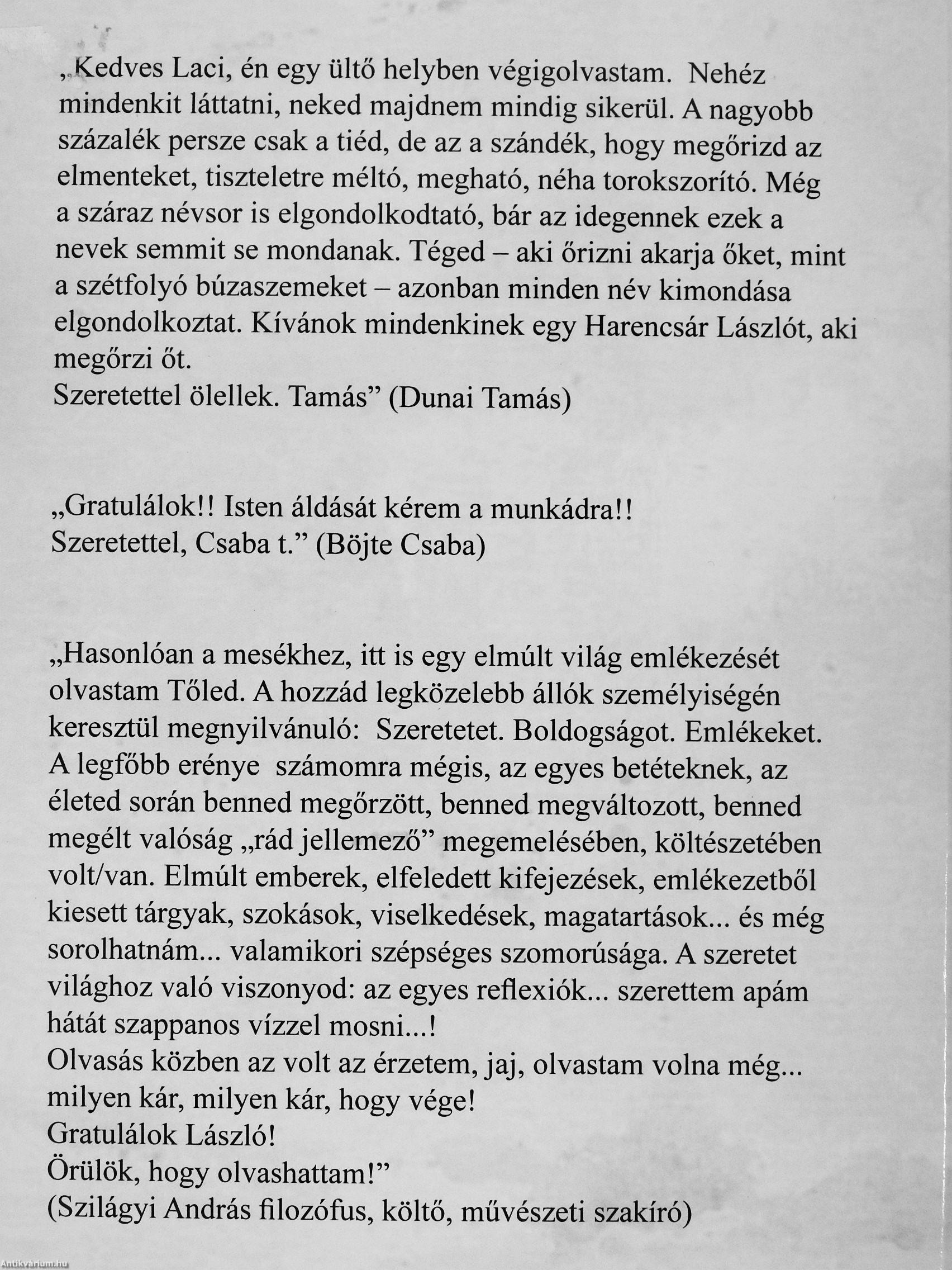 ,.Kedves Laci, én egy ültő helyben végigolvastam. Nehéz mindenkit láttatni, neked majdnem mindig sikerül. A nagyobb százalék persze csak a tiéd, de az a szándék, hogy megőrizd az elmenteket, tiszteletre méltó, megható, néha torokszorító. Még a száraz névsor is elgondolkodtató, bár az idegennek ezek a nevek semmit se mondanak. Téged - aki őrizni akarja őket, mint a szétfolyó búzaszemeket - azonban minden név kimondása elgondolkoztat. Kívánok mindenkinek egy Harencsár Lászlót, aki megőrzi őt.