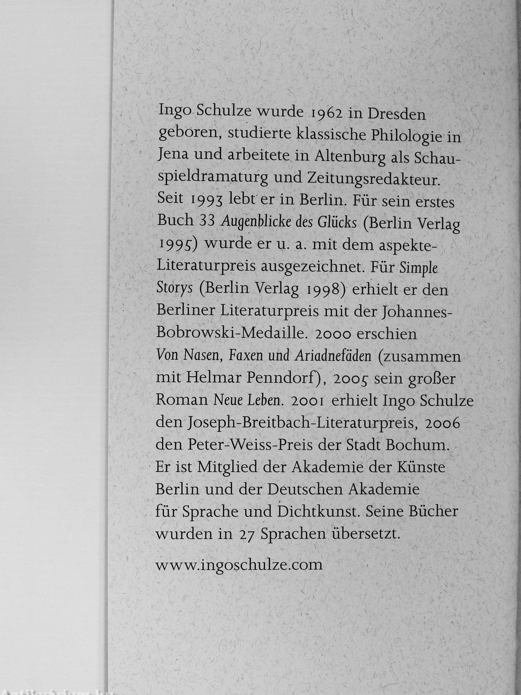 Ingo Schulze wurde 1962 in Dresden geboren, studierte klassische Philologie in Jena und arbeitete in Altenburg als Schauspieldramaturg und Zeitungsredakteur. Seit 1993 lebt er in Berlin. Für sein erstes Buch 33 Augenblicke des Glücks (Berlin Verlag 199s) wurde er u. a. mit dem aspekte-Literaturpreis ausgezeichnet. Für Simple Storys (Berlin Verlag 1998) erhielt er den Berliner Literaturpreis mit der Johannes-Bobrowski-Medaille. 2000 erschien Von Nasen, Faxen und Ariadnefaden (zusammen mit Helmar Penndorf), 2005- sein großer Roman Neue Leben. 2001 erhielt Ingo Schulze den Joseph-Breitbach-Literaturpreis, 2006 den Peter-Weiss-Preis der Stadt Bochum. Er ist Mitglied der Akademie der Künste Berlin und der Deutschen Akademie für Sprache und Dichtkunst. Seine Bücher wurden in 27 Sprachen übersetzt.