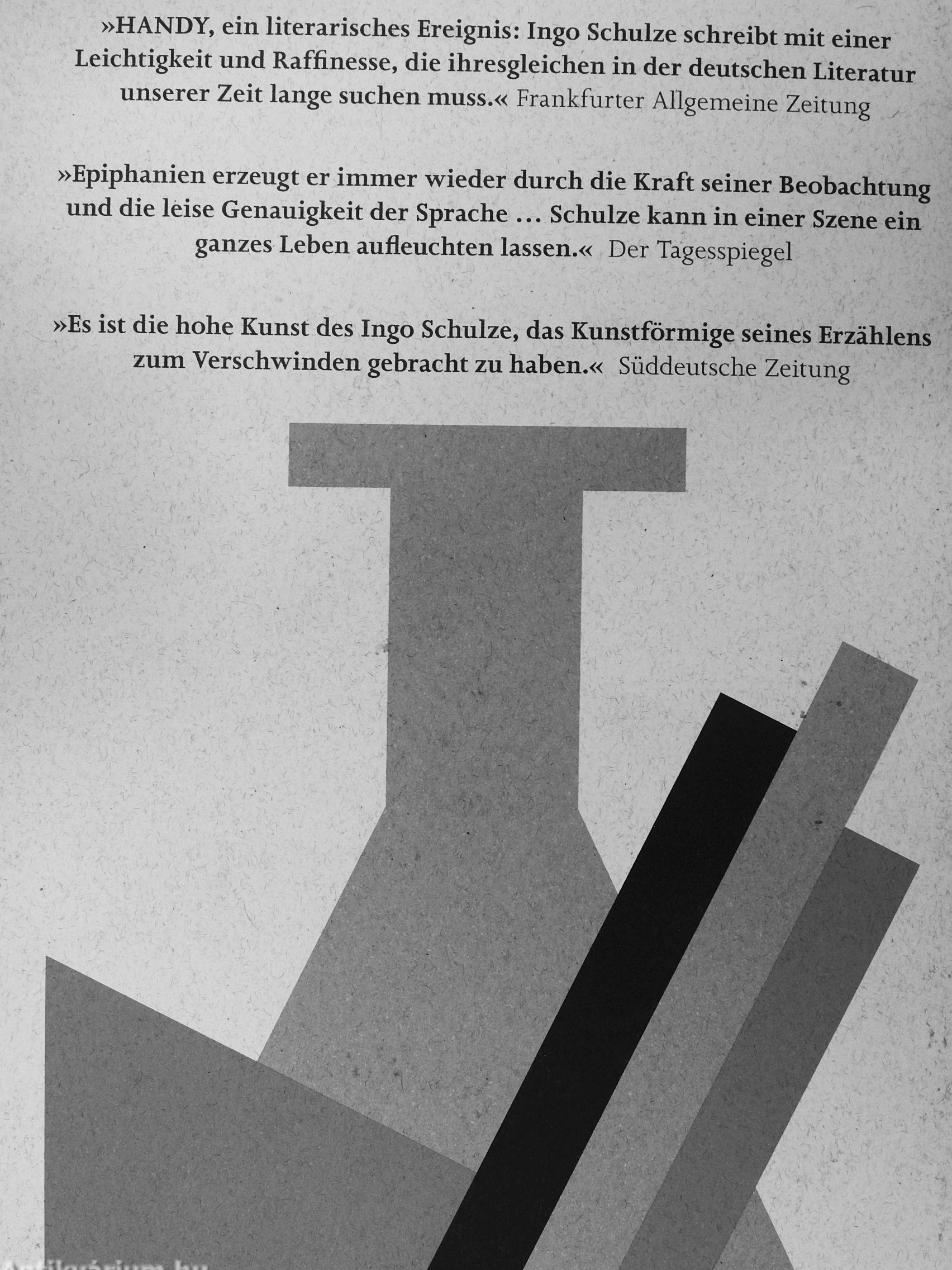 »HANDY, ein literarisches Ereignis: Ingo Schulze schreibt mit einer Leichtigkeit und Raffinesse, die ihresgleichen in der deutschen Literatur unserer Zeit lange suchen muss.« Frankfurter Allgemeine Zeitung
