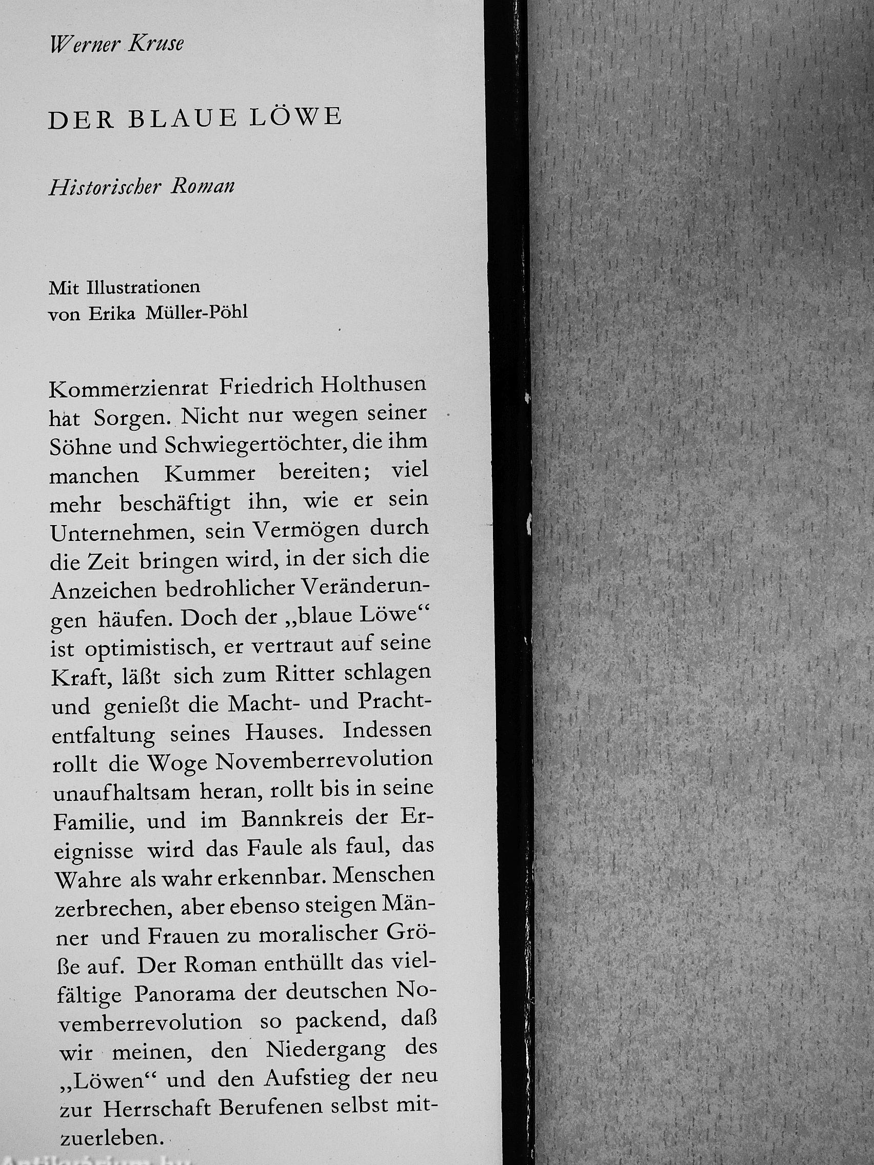Kommerzienrat Friedrich Holthusen hat Sorgen. Nicht nur wegen seiner Söhne und Schwiegertöchter, die ihm manchen Kummer bereiten; viel mehr beschäftigt ihn, wie er sein Unternehmen, sein Vermögen durch die Zeit bringen wird, in der sich die Anzeichen bedrohlicher Veränderungen häufen. Doch der „blaue Löwe" ist optimistisch, er vertraut auf seine Kraft, läßt sich zum Ritter schlagen und genießt die Macht- und Prachtentfaltung seines Hauses. Indessen rollt die Woge Novemberrevolution unaufhaltsam heran, rollt bis in seine Familie, und im Bannkreis der Ereignisse wird das Faule als faul, das Wahre als wahr erkennbar. Menschen zerbrechen, aber ebenso steigen Männer und Frauen zu moralischer Größe auf. Der Roman enthüllt das vielfähige Panorama der deutschen Novemberrevolution so packend, daß wir meinen, den Niedergang des „Löwen" und den Aufstieg der neu zur Herrschaft Berufenen selbst mitzuerleben.