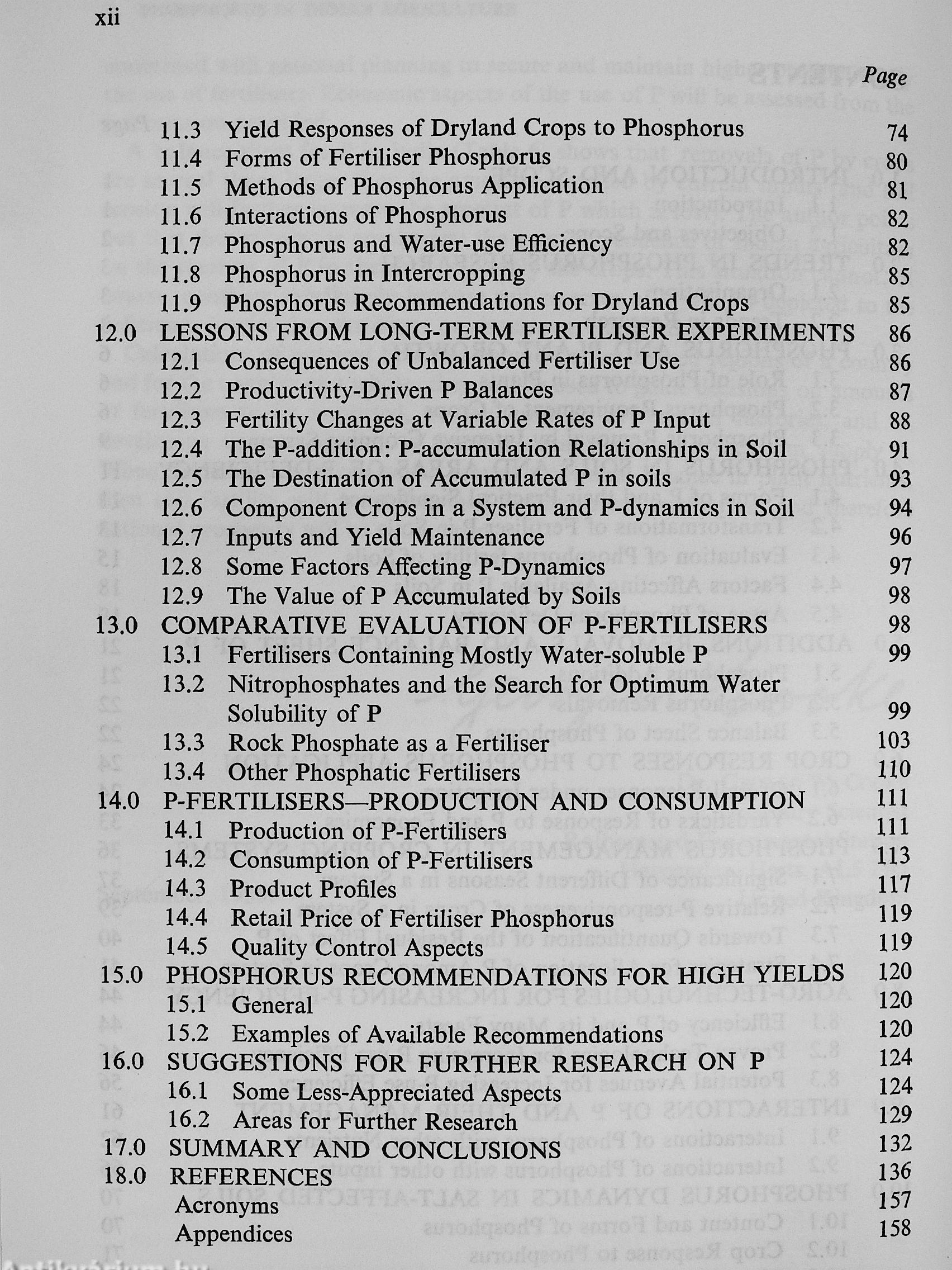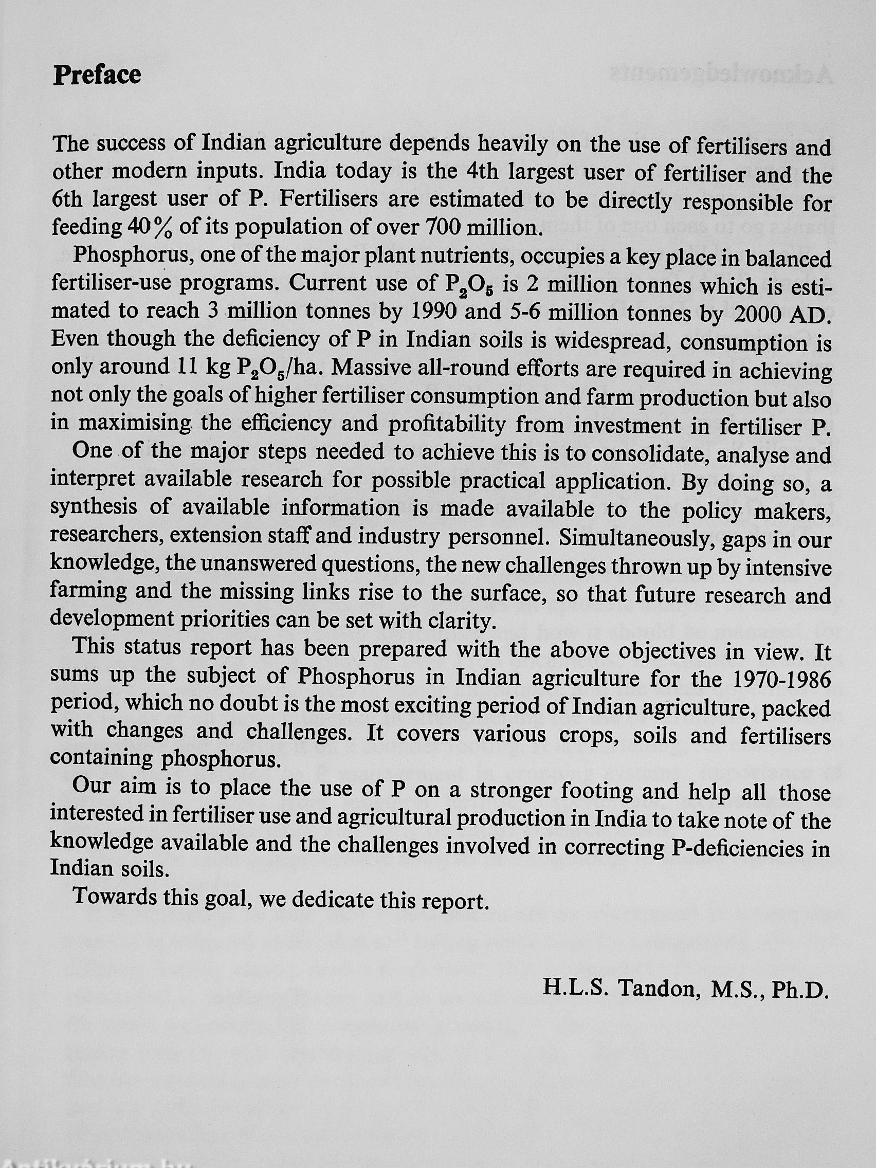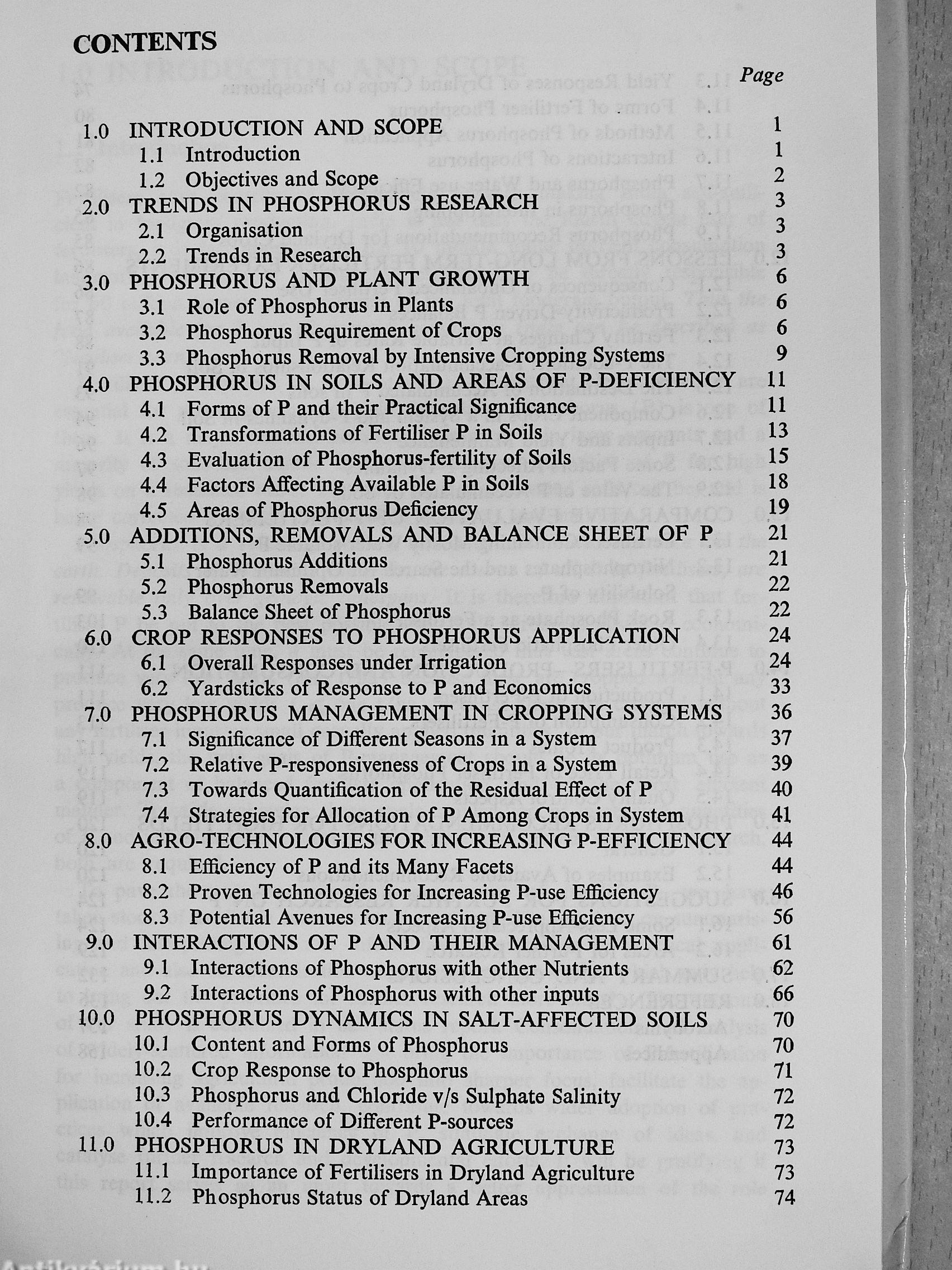 This report is an uptodate account of the many facets of P and the role which P-fertilisers can play in Indian agriculture. It consolidates, and analyses the scattered results of research available during the 1970-86 period into an easily-readable account for the everyday use of students, teachers, researchers, administrators, field staiF of the fertiliser industry, extension workers, soil and fertiliser testing laboratories, fertiliser trading and international organisations.