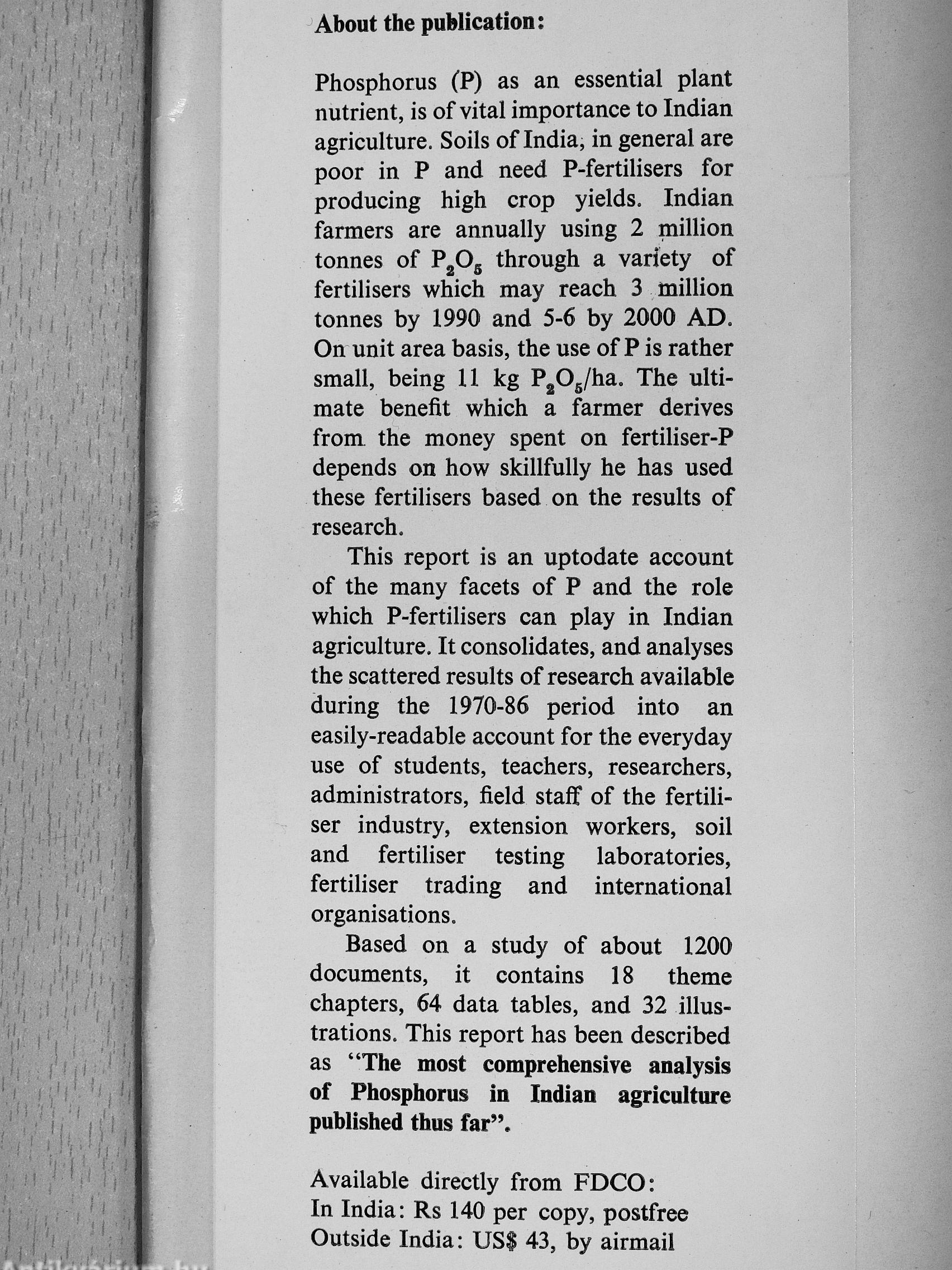 Based on a study of about 1200 documents, it contains 18 theme chapters, 64 data tables, and 32 illustrations. This report has been described as "The most comprehensive analysis of Phosphorus in Indian agriculture published thus far".