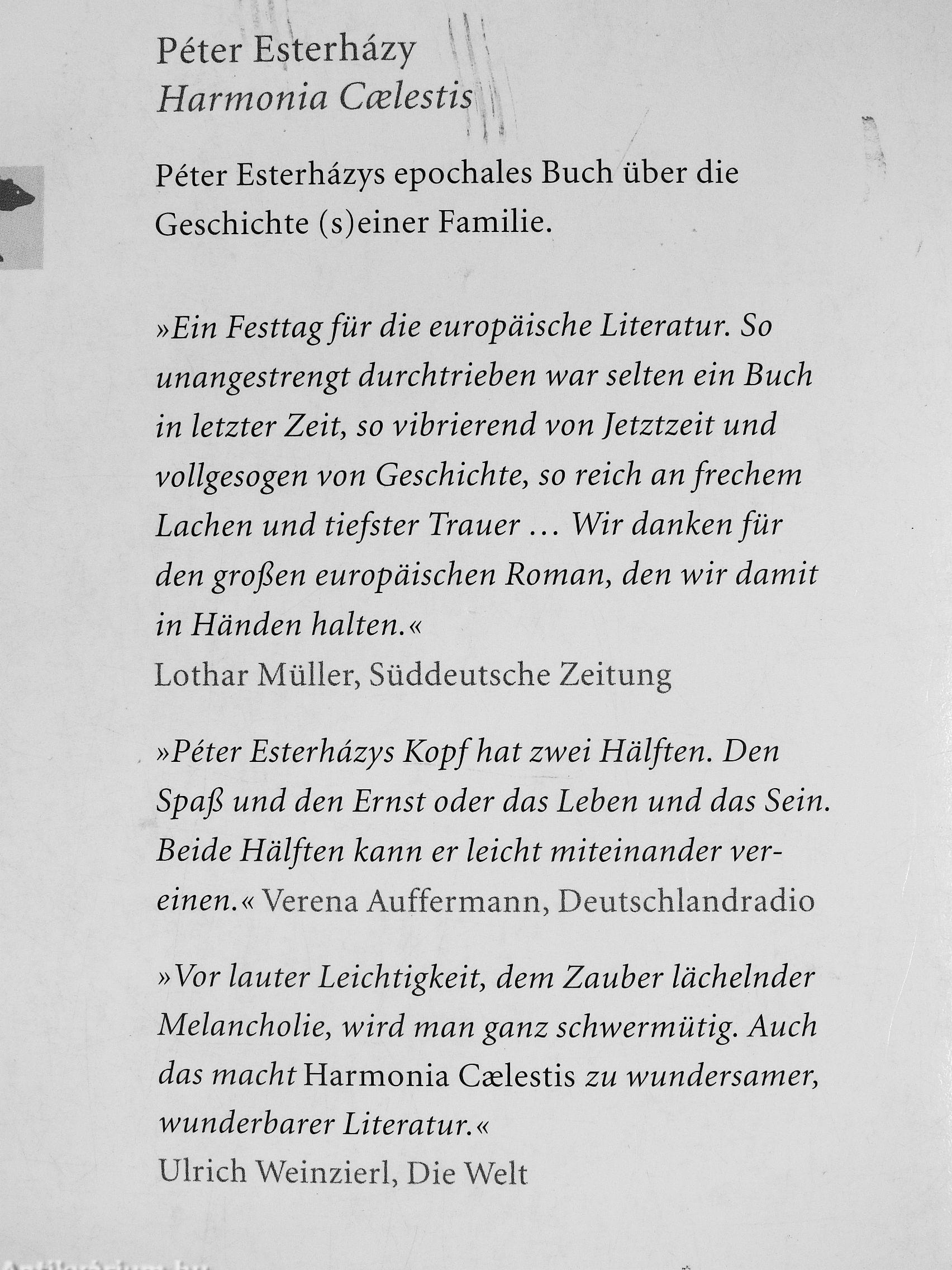 »Péter Esterházys Kopf hat zwei Hälften. Den Spaß und den Ernst oder das Lehen und das Sein. Beide Hälften kann er leicht miteinander vereinen.« Verena Auffermann, Deutschlandradio