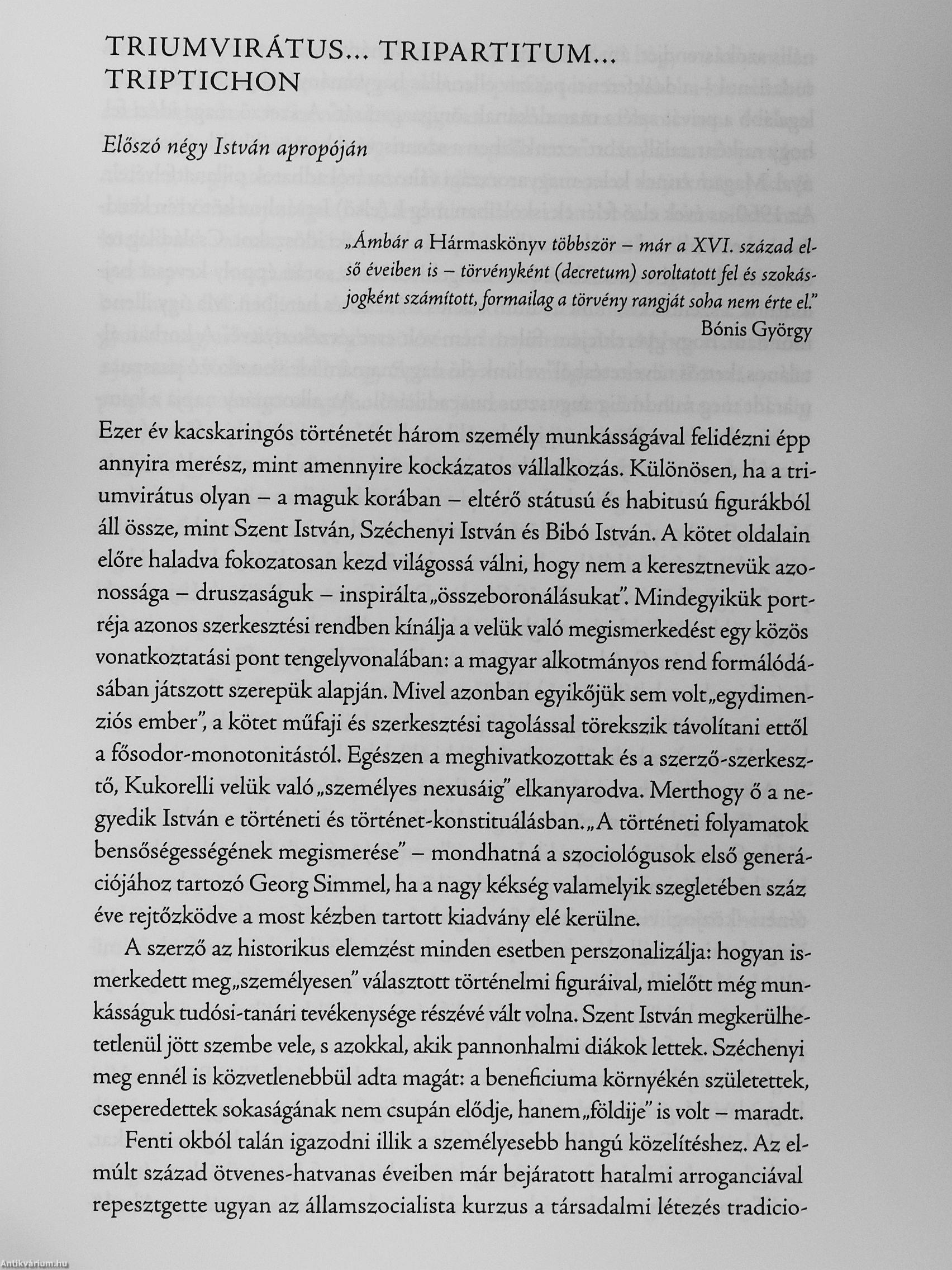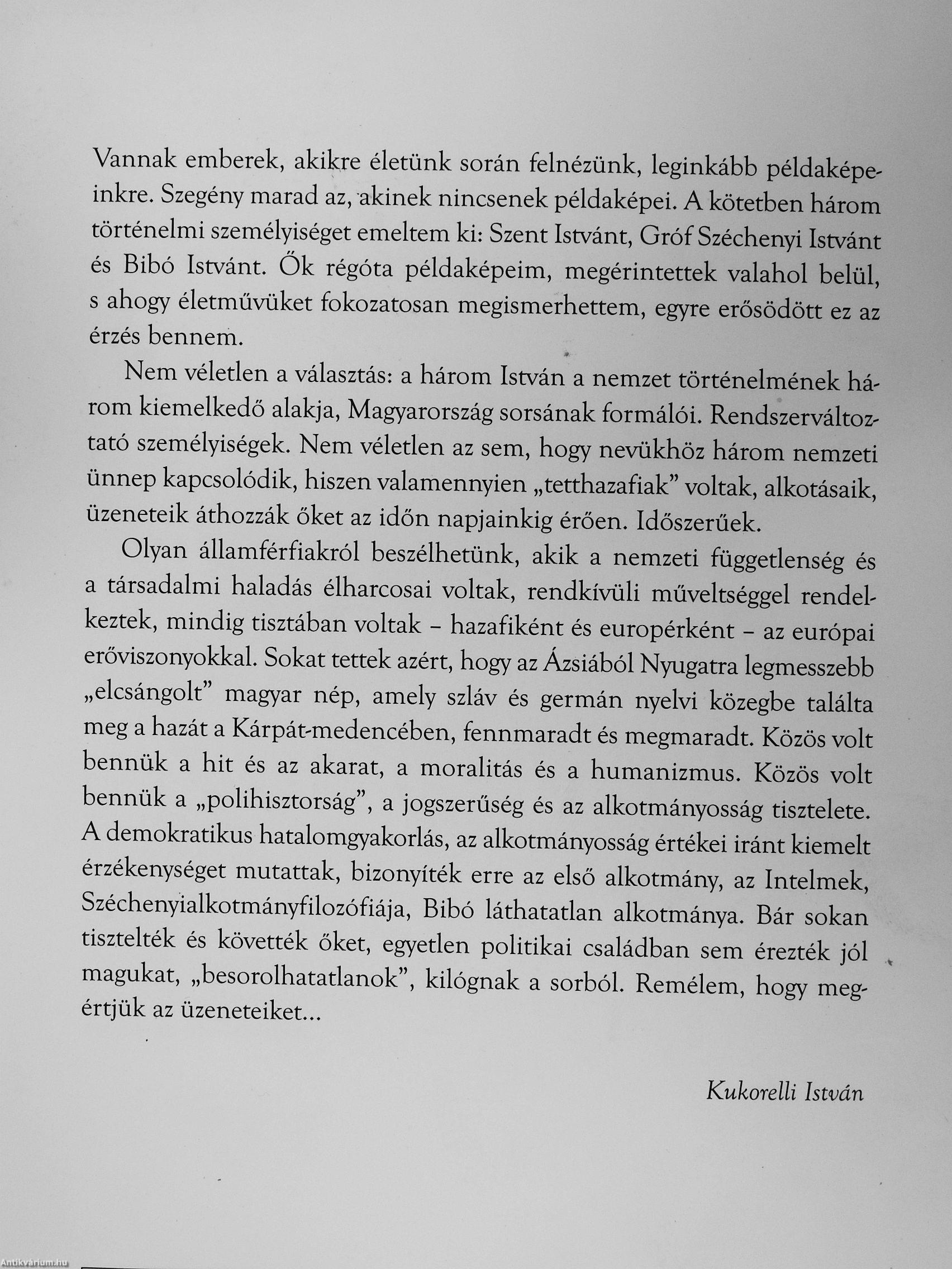 Vannak emberek, akikre életünk során felnézünk, leginkább példaképeinkre. Szegény marad az, akinek nincsenek példaképei. A kötetben három történelmi személyiséget emeltem ki: Szent Istvánt, Gróf Széchenyi Istvánt és Bibó Istvánt. Ok régóta példaképeim, megérintettek valahol belül, s ahogy életművüket fokozatosan megismerhettem, egyre erősödött ez az érzés bennem.