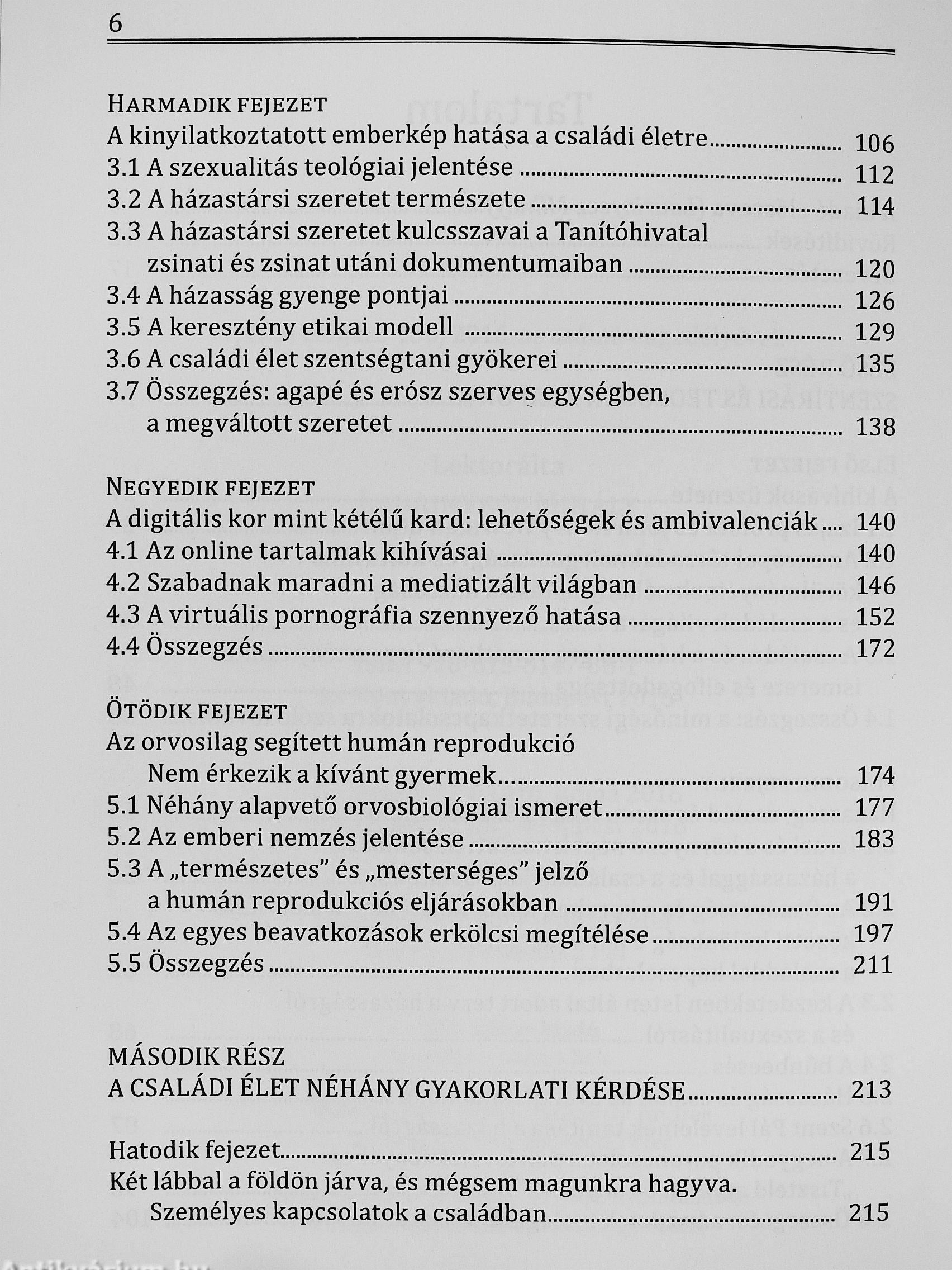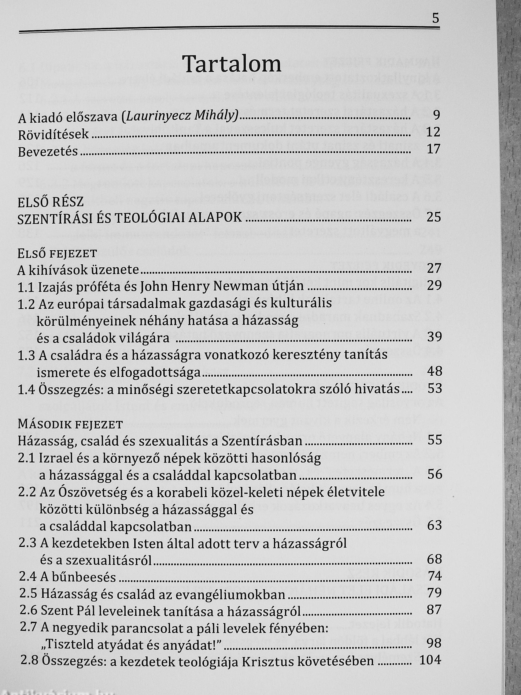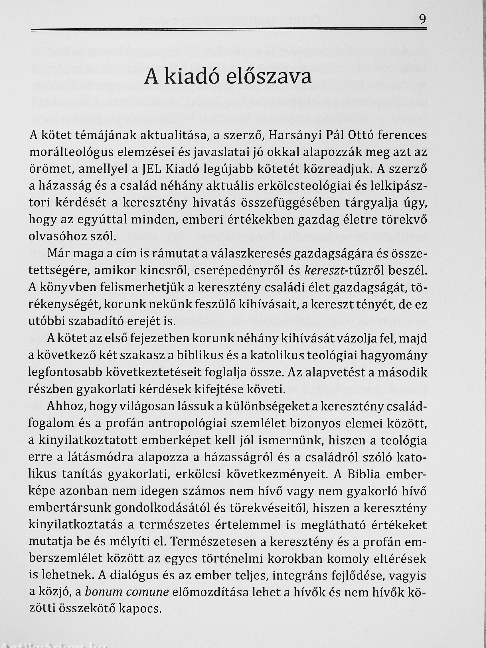 A szerző a házasság és a család néhány aktuális erkölcsteológiai és lelkipásztori kérdését a keresztény hivatás összefüggésében tárgyalja úgy, hogy az V egyúttal minden emberi értékekben gazdag életre törekvő olvasóhoz szól. A könyvben felismerhetjük a keresztény családi élet gazdagságát, törékenységét, korunk nekünk feszülő kihívásait, a kereszt tényét, de ez utóbbi szabadító erejét is. Ajánljuk a könyvet mindazoknak az igényes házaspároknak, családközösségeknek, akik a keresztény családi élethez a praktikus szempontokat a kinyilatkoztatáson alapuló teológiai hagyomány és az egyházi tanítás mentén keresik azért, hogy ne csak a hogyant, hanem a miérteket is lássák. Jó szívvel ajánljuk a kötetet házas csoportoknak beszélgetésekhez, feldolgozásra, de teológiai hallgatók is haszonnal forgathatják a témakör bőséges idegen nyelvű irodalmi m,egalápozottsága és tartalmi mélysége miatt.