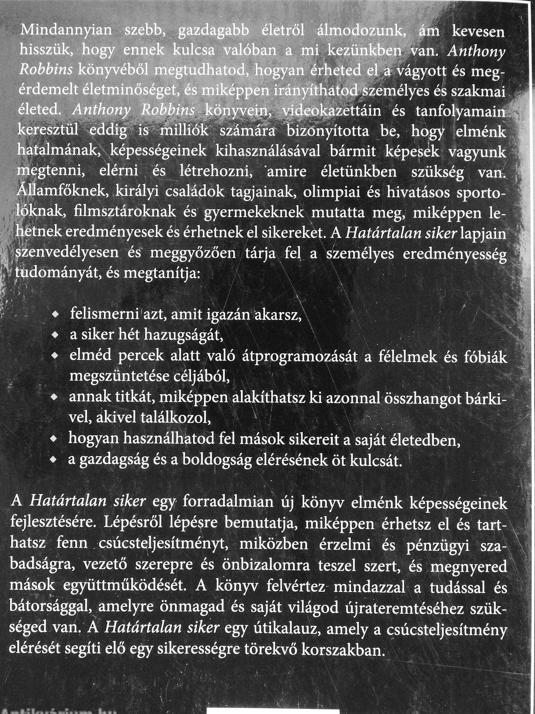 keresztül eddig is milliók számára bizonyította be, hogy elménk hatalmának, képességeinek kihasználásával bármit képelek vagyunk megtenni, elérni és létrehozni, amire életünkben szükség van. Államfőknek, királyi családok tagjainak, olimpiai és hivatásos sportolóknak, filmsztároknak és gyermekeknek mutatta meg, miképpen lehetnek eredményesek és érhetnek el sikereket. A Határtalan siTcer lapjain szenvedélyesen és meggyőzően tárja fel a Személyes eredményesség tudományát, és megtanítja: j