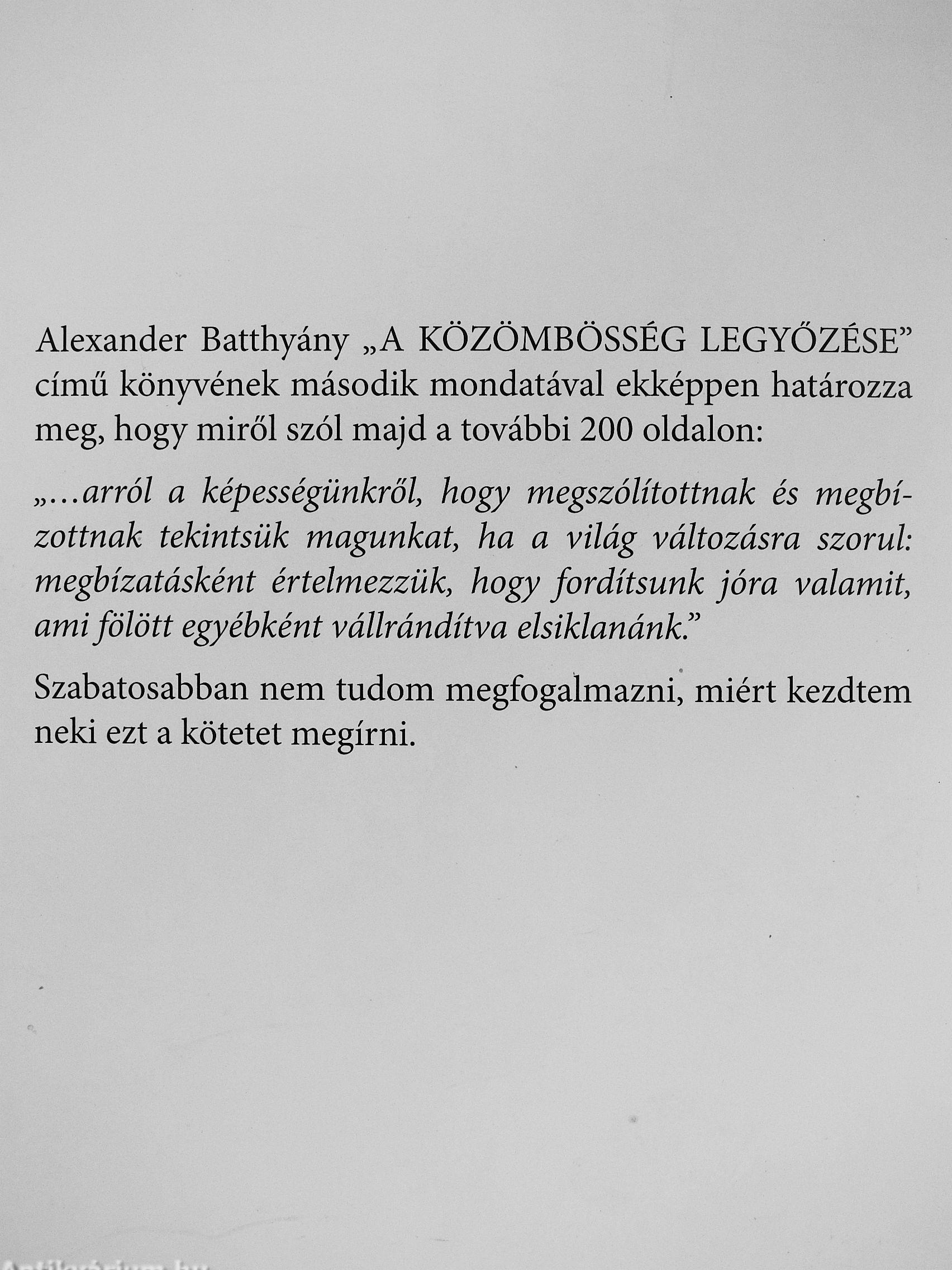 Alexander Batthyány „A KÖZÖMBÖSSÉG LEGYŐZÉSE" című könyvének második mondatával ekképpen határozza meg, hogy miről szól majd a további 200 oldalon: