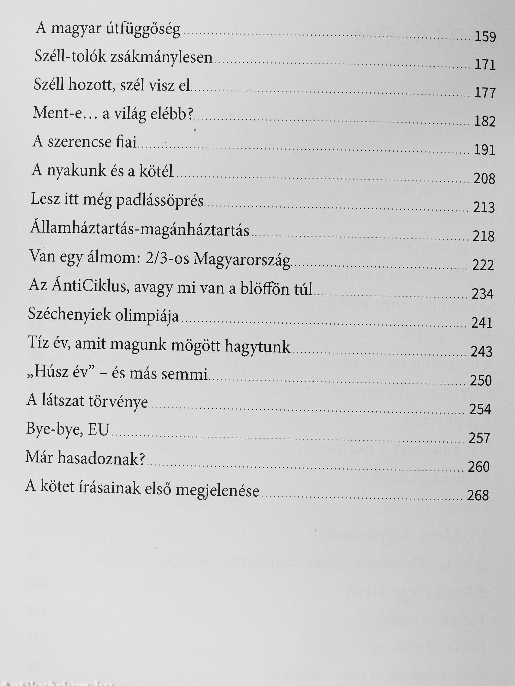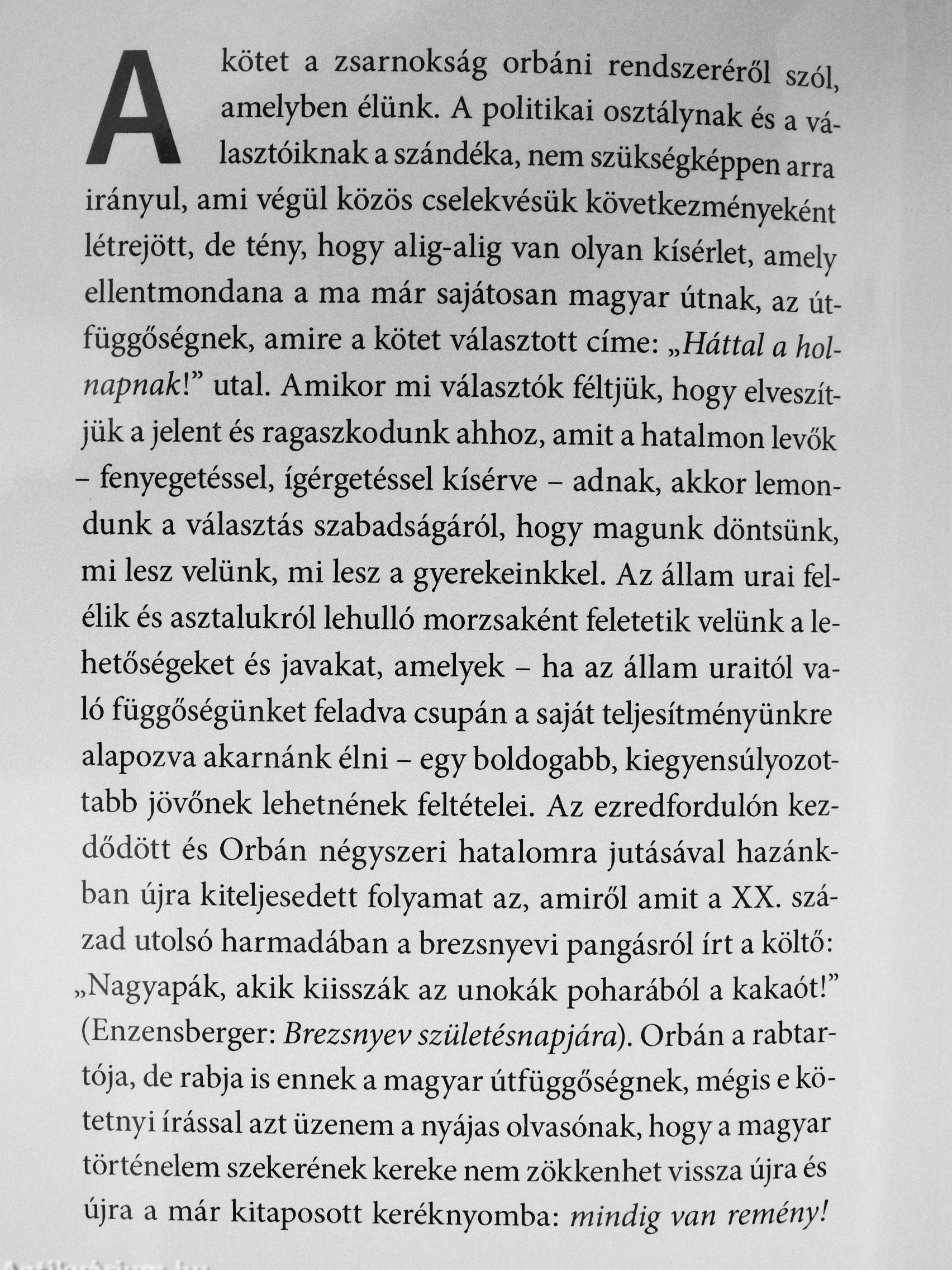A kötet a zsarnokság orbáni rendszeréről szól, amelyben élünk. A politikai osztálynak és a választóiknak a szándéka, nem szükségképpen arra irányul, ami végül közös cselekvésük következményeként létrejött, de tény, hogy alig-alig van olyan kísérlet, amely ellentmondana a ma már sajátosan magyar útnak, az út-függőségnek, amire a kötet választott címe: „Háttal a hol-napnakl" utal. Amikor mi választók féltjük, hogy elveszítjük a jelent és ragaszkodunk ahhoz, amit a hatalmon levők - fenyegetéssel, ígérgetéssel kísérve - adnak, akkor lemondunk a választás szabadságáról, hogy magunk döntsünk, mi lesz velünk, mi lesz a gyerekeinkkel. Az állam urai felélik és asztalukról lehulló morzsaként feletetik velünk a lehetőségeket és javakat, amelyek - ha az állam uraitól való függőségünket feladva csupán a saját teljesítményünkre alapozva akarnánk élni - egy boldogabb, kiegyensúlyozottabb jövőnek lehetnének feltételei. Az ezredfordulón kezdődött és Orbán négyszeri hatalomra jutásával hazánkban újra kiteljesedett folyamat az, amiről amit a XX. század utolsó harmadában a brezsnyevi pangásról írt a költő: „Nagyapák, akik kiisszák az unokák poharából a kakaót!" (Enzensberger: Brezsnyev születésnapjára). Orbán a rabtartója, de rabja is ennek a magyar útfüggőségnek, mégis e kötetnyi írással azt üzenem a nyájas olvasónak, hogy a magyar történelem szekerének kereke nem zökkenhet vissza újra és újra a már kitaposott keréknyomba: mindig van reményi
