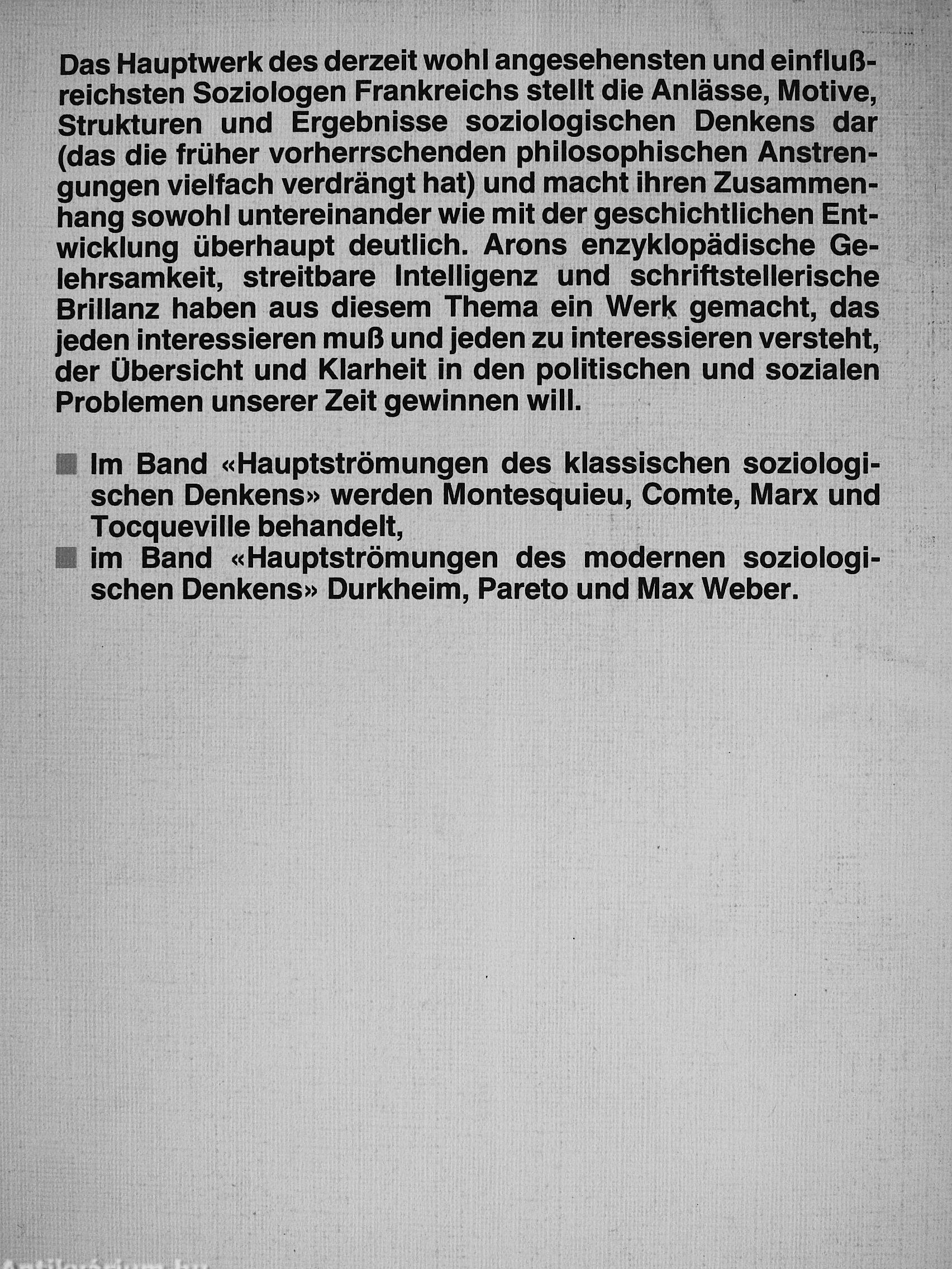 Das Hauptwerk des derzeit wohl angesehensten und einflußreichsten Soziologen Frankreichs stellt die Anlässe, Motive, Strukturen und Ergebnisse soziologischen Denkens dar (das die früher vorherrschenden philosophischen Anstrengungen vielfach verdrängt hat) und macht ihren Zusammenhang sowohl untereinander wie mit der geschichtlichen Entwicklung überhaupt deutlich. Arons enzyklopädische Gelehrsamkeit, streitbare Intelligenz und schriftstellerische Brillanz haben aus diesem Thema ein Werk gemacht, das jeden interessieren muß und jeden zu interessieren versteht, der Übersicht und Klarheit in den politischen und sozialen Problemen unserer Zeit gewinnen will.