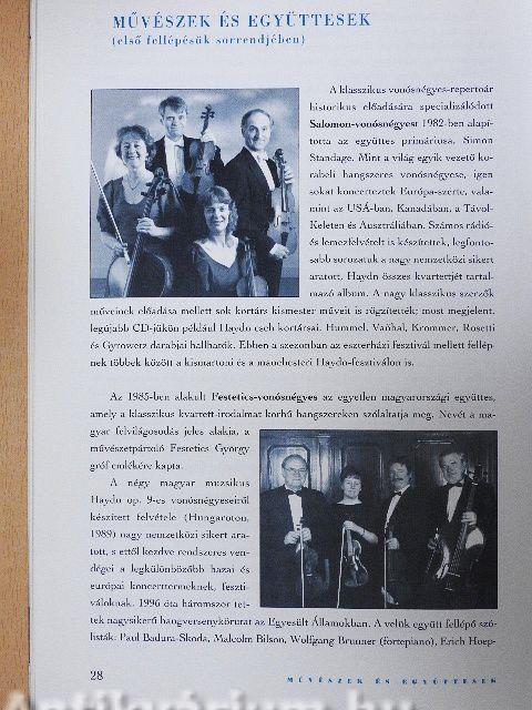 Fesztiválunk elérkezett első, egyelőre igen szerény jubileumához: idén ötödik alkalommal kíséreljük meg Eszterháza elveszett paradicsomának, Haydn és Esterházy "Fényes" Miklós hercegi zenei birodalmának felidézését. Ennek megvalósítását a szimfónia és a vonósnégyes műfajában kezdettől fogva olyan kiváló hazai együttesekre alapozhatjuk, mint Vashegyi György Orfeo-zenekara és a Festetics-vonósnégyes. A külföldi élvonalat a vonósnégyes területén ezúttal másodszor képviseli a Salomon-kvartett, a zenekarok közül viszont első ízben látogat el hozzánk mértékadó, világszerte ünnepelt együttes: az Academy of Ancient Music. A patinás angol historikus zenekar többek között arról nevezetes, hogy a Haydn-szimfóniákat a legújabb kutatás által hitelesített létszámban és hangszerösszeállításban (billentyűs continuo-hangszer nélkül) adja elő, a koncertmester, tehát az első hegedűjátékos irányításával - így azután ideális vendégművészei fesztiválunknak, amely kezdettől fogva a korszerű történeti tudás és a magas művészi színvonal szimbiózisára törekszik. Vissza