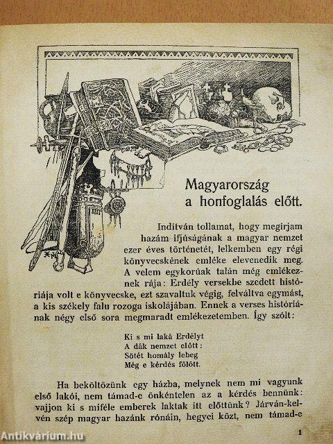 Indítván tollamat, hogy megírjam hazám ifjúságának a magyar nemzet ezer éves történetét, lelkemben egy régi könyvecskének emléke elevenedik meg. A velem egykorúak talán még emlékeznek rája: Erdély versekbe szedett históriája volt e könyvecske, ezt szavaltuk végig, felváltva egymást, a kis székely falu rozoga iskolájában. Ennek a verses históriának négy első sora megmaradt emlékezetemben. Így szólt: