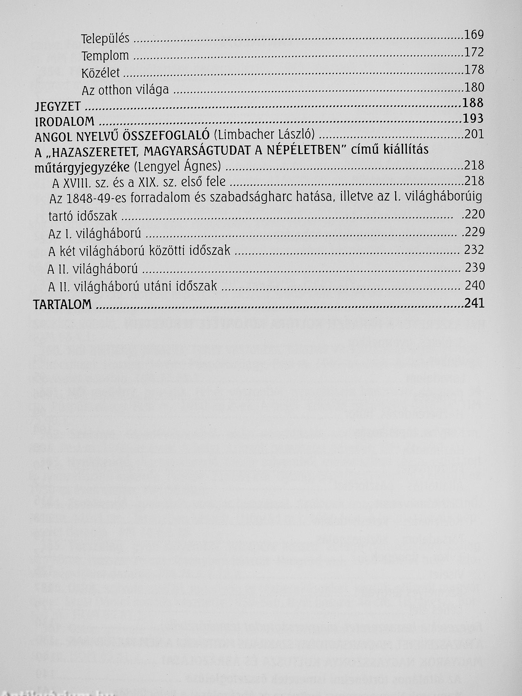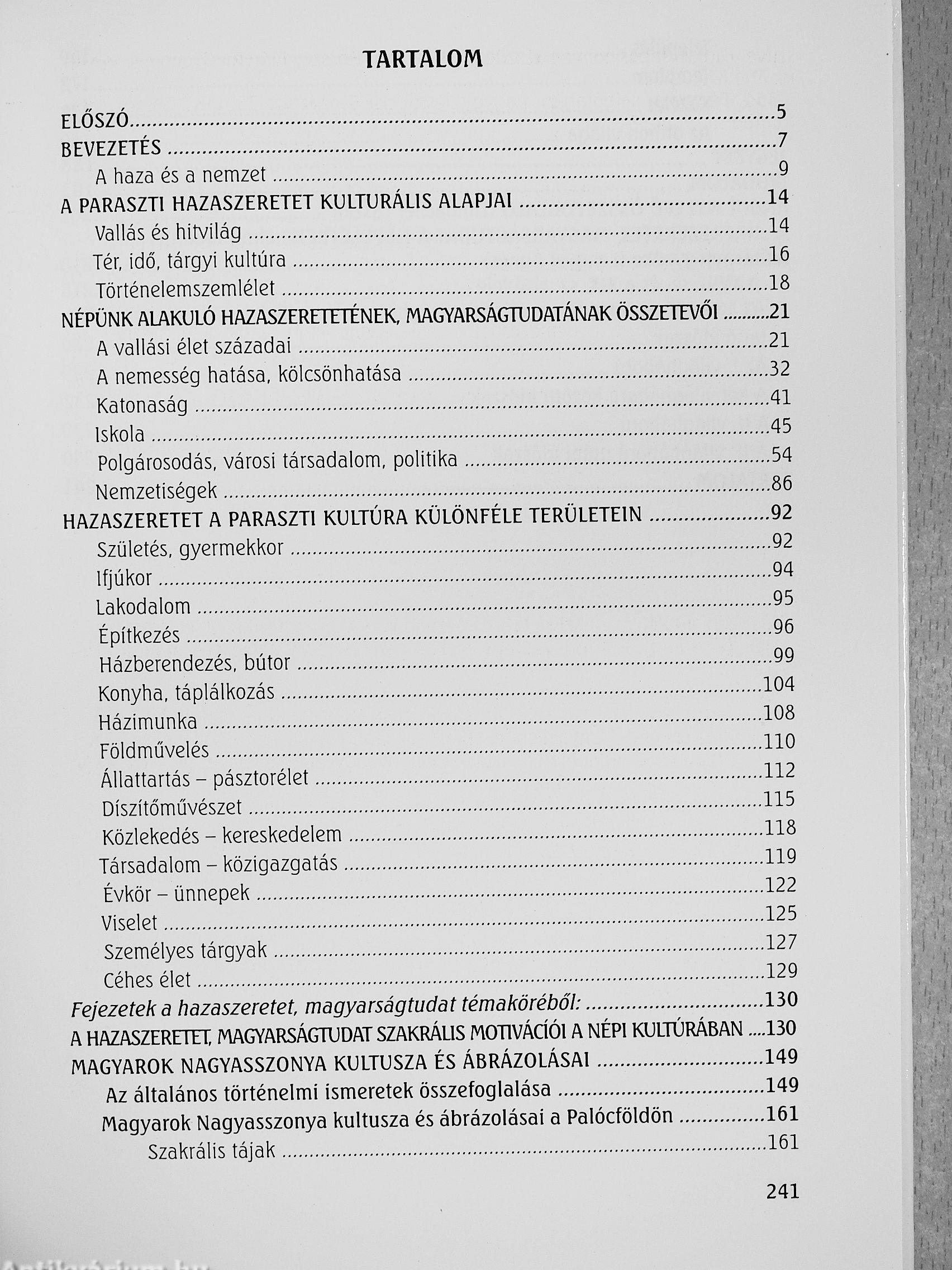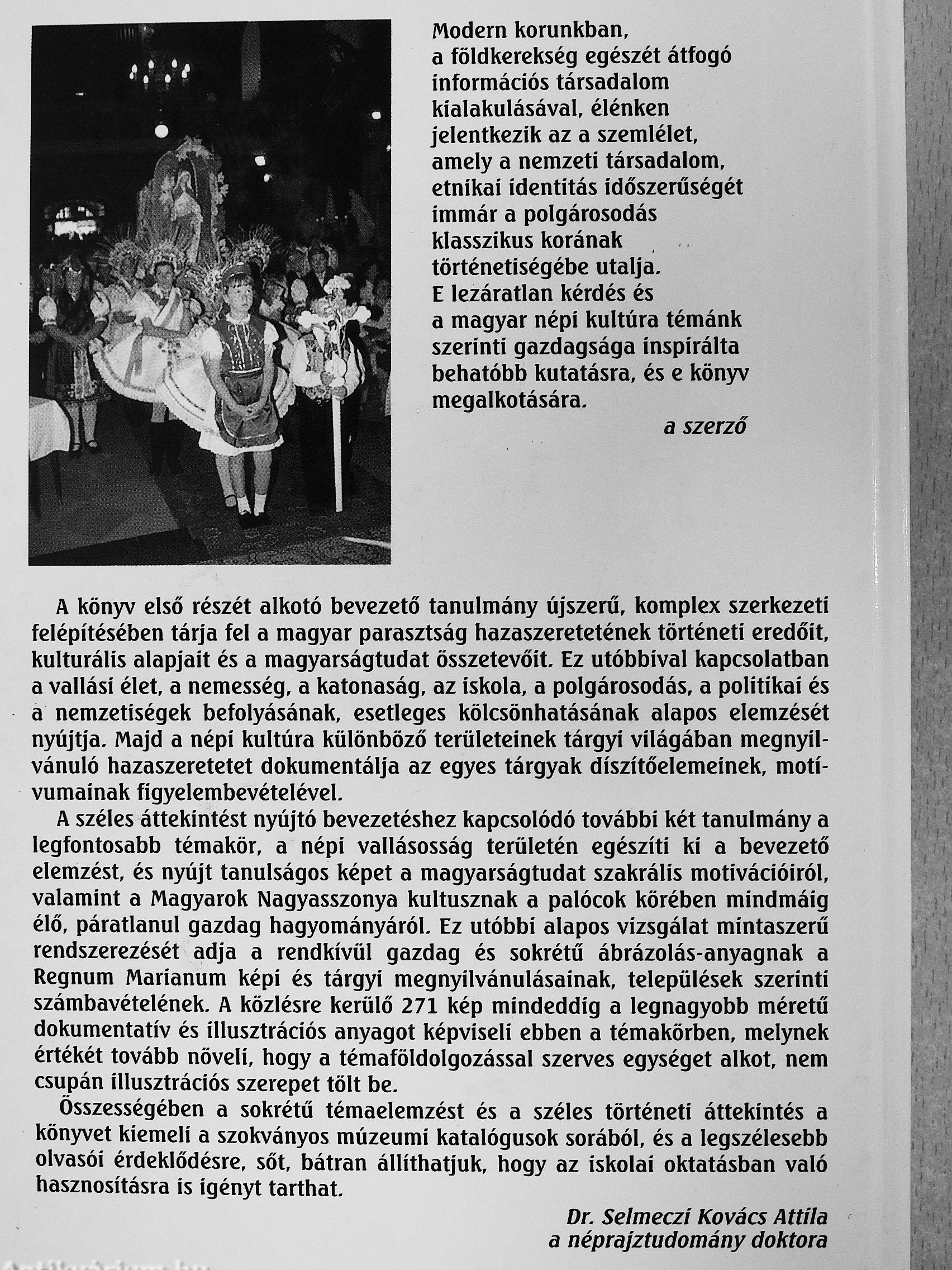 A könyv első részét alkotó bevezető tanulmány újszerű, komplex szerkezeti felépítésében tárja fel a magyar parasztság hazaszeretetének történeti eredőit, kulturális alapjait és a magyarságtudat összetevőit. Ez utóbbival kapcsolatban a vallási élet, a nemesség, a katonaság, az iskola, a polgárosodás, a politikai és a nemzetiségek befolyásának, esetleges kölcsönhatásának alapos elemzését nyújtja. Majd a népi kultúra különböző területeinek tárgyi világában megnyilvánuló hazaszeretetet dokumentálja az egyes tárgyak díszítőelemeinek, motívumainak figyelembevételével.