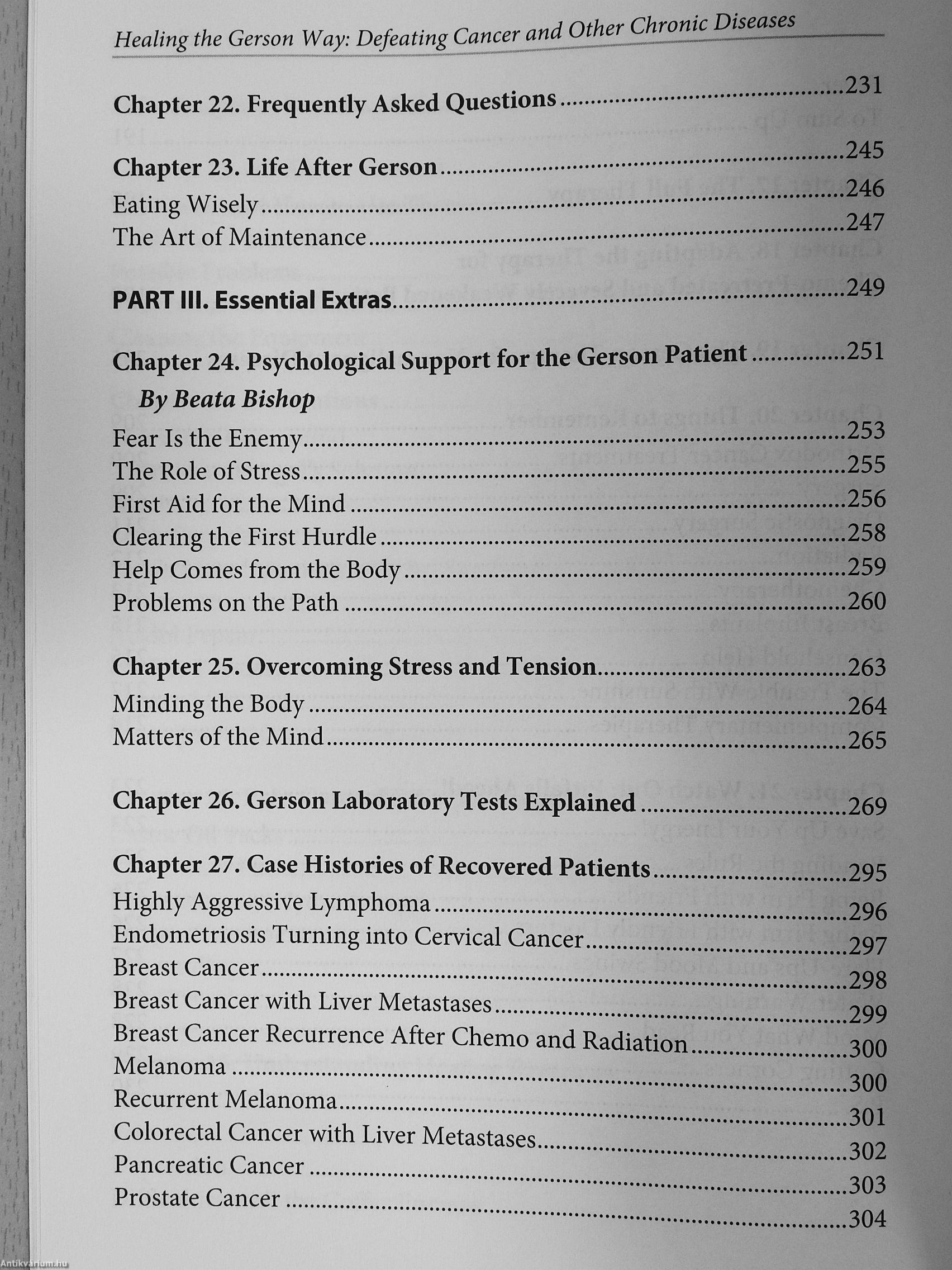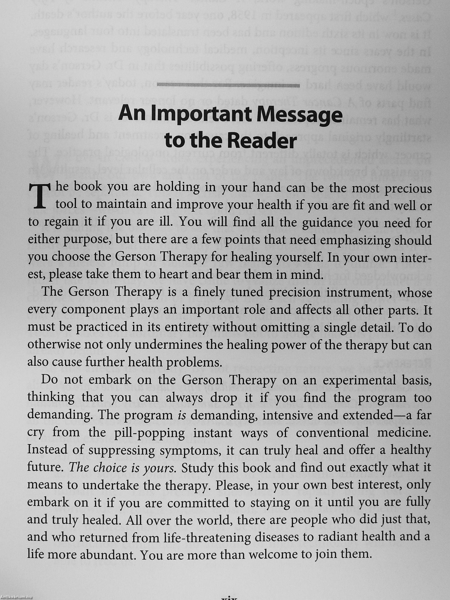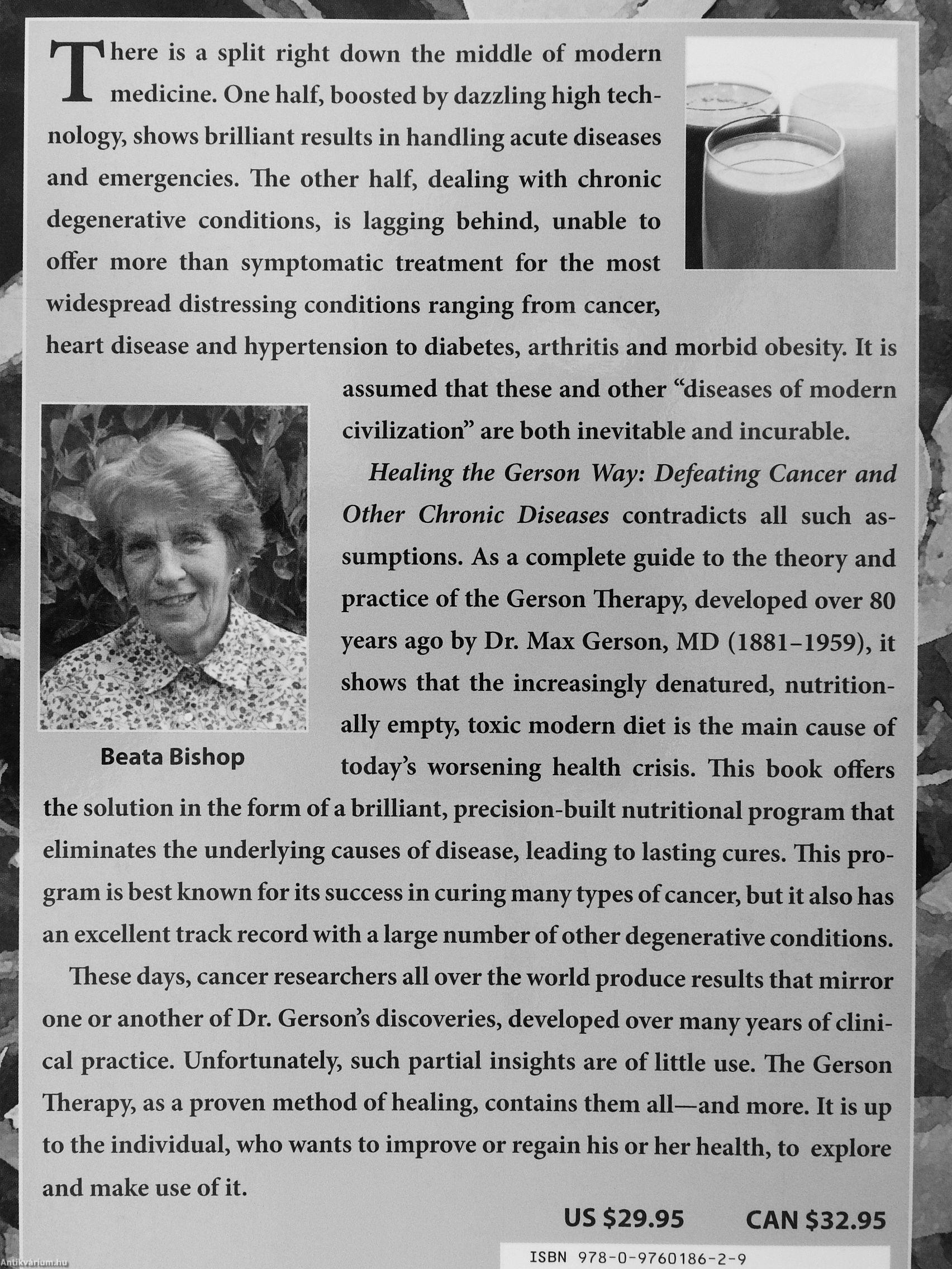 These days, cancer researchers all over the world produce results that mirror one or another of Dr. Gerson's discoveries, developed over many years of clinical practice. Unfortunately, such partial insights are of little use. The Gerson Therapy, as a proven method of healing, contains them all—and more. It is up to the individual, who wants to improve or regain his or her health, to explore and make use of it.