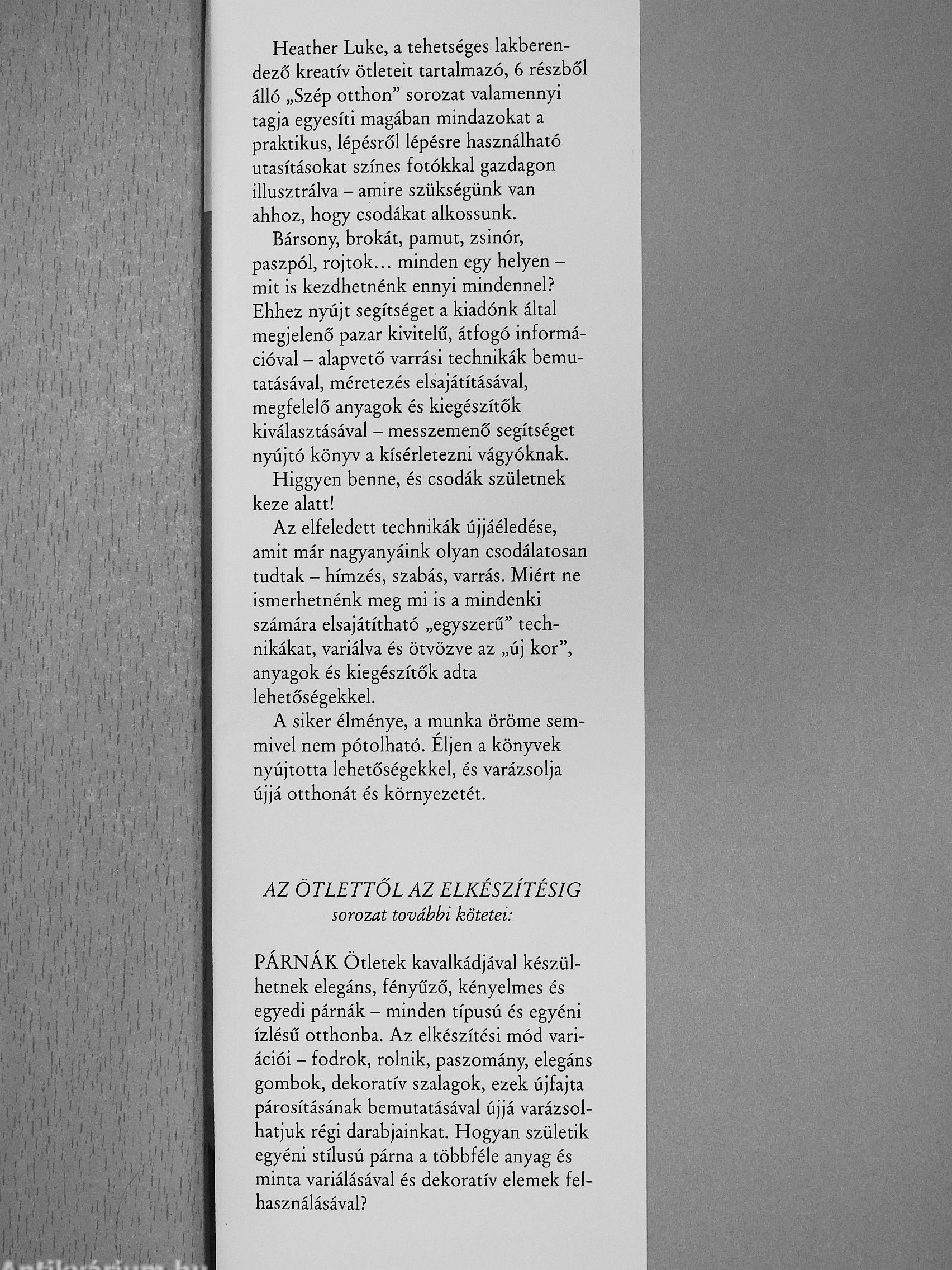 Heather Luké, a tehetséges lakberendező kreatív ötleteit tartalmazó, 6 részből álló „Szép otthon" sorozat valamennyi tagja egyesíti magában mindazokat a praktikus, lépésről lépésre használható utasításokat színes fotókkal gazdagon illusztrálva - amire szükségünk van ahhoz, hogy csodákat alkossunk.
