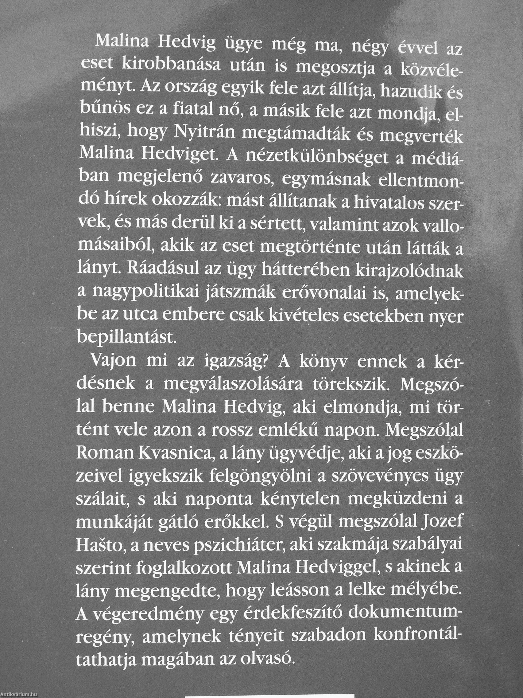 Vajon mi az igazság? A könyv ennek a kérdésnek a megválaszolására törekszik. Megszólal benne Maiina Hedvig, aki elmondja, mi történt vele azon a rossz emlékű napon. Megszólal Román Kvasnica, a lány ügyvédje, aki a jog eszközeivel igyekszik felgöngyölni a szövevényes ügy szálait, s aki naponta kénytelen megküzdeni a munkáját gátló erőkkel. S végül megszólal Jozef Hasto, a neves pszichiáter, aki szakmája szabályai szerint foglalkozott Maiina Hedviggel, s akinek a lány megengedte, hogy leásson a lelke mélyébe. A végeredmény egy érdekfeszítő dokumentumregény, amelynek tényeit szabadon konfrontál-tathatja magában az olvasó. Vissza