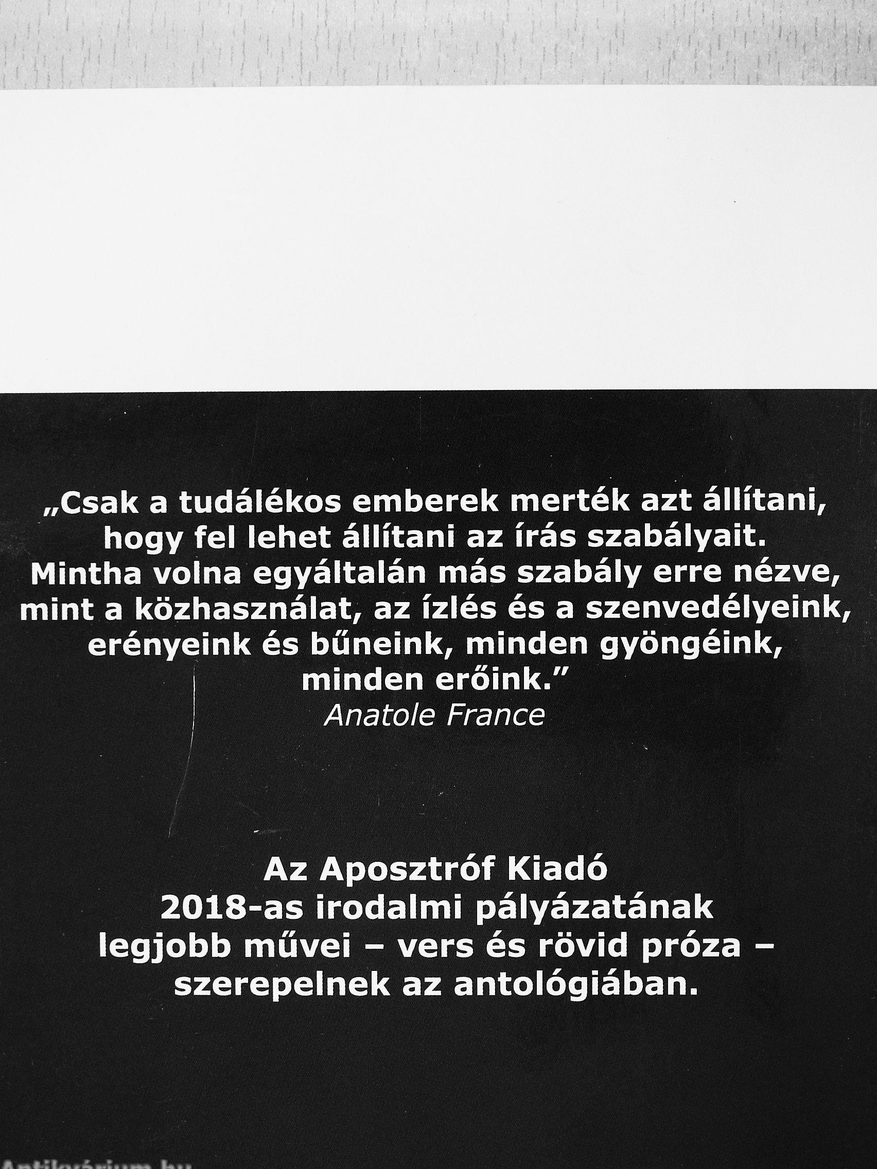 Az Aposztróf Kiadó 2018-as irodalmi pályázatának legjobb művei - vers és rövid próza -szerepelnek az antológiában.