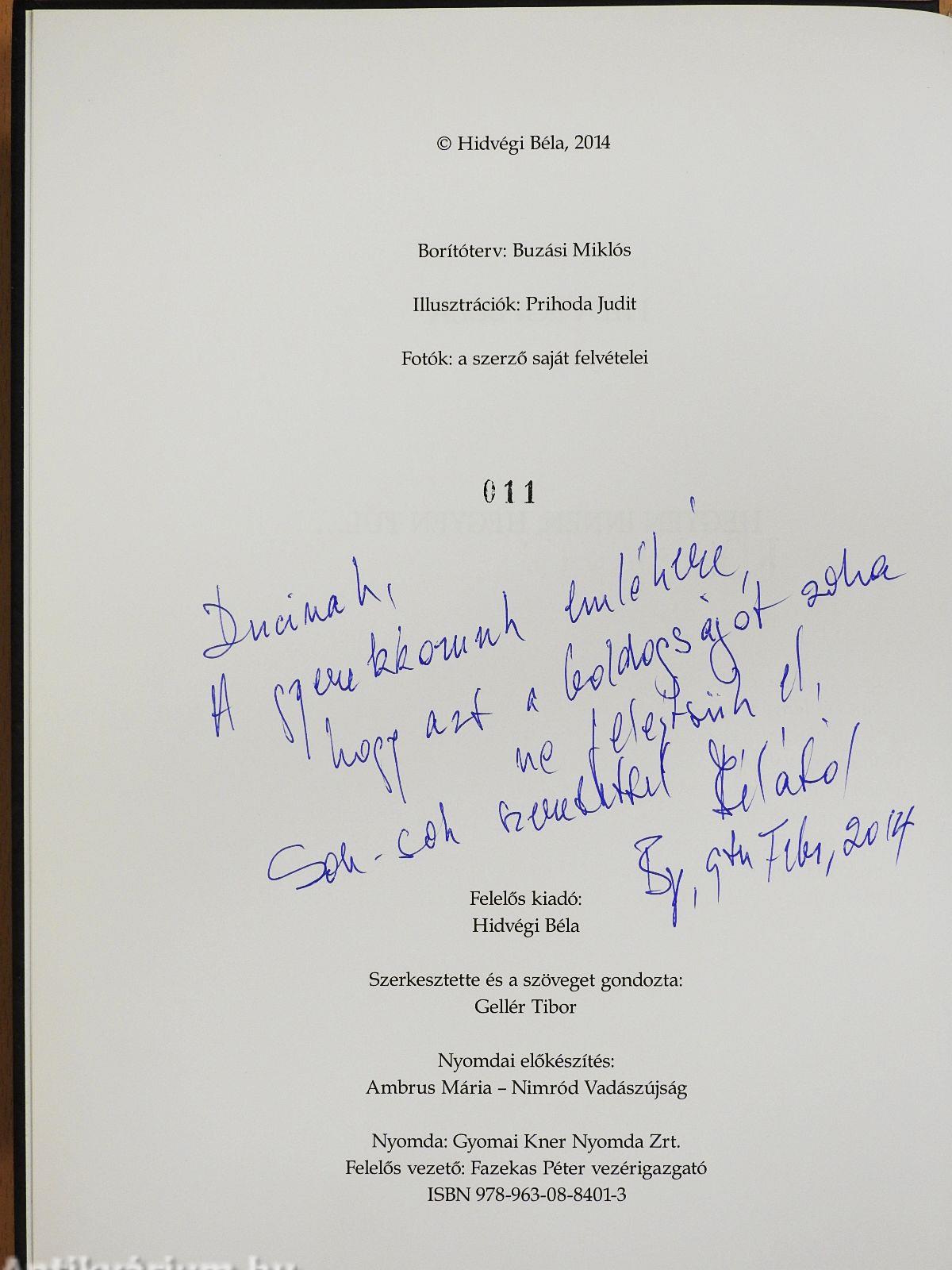 A címlap belső oldalán a szerző és fotós, Hidvégi Béla névre szóló dedikációja látható. Ez a könyv a 011 számú példány. Szép állapotú példány.
