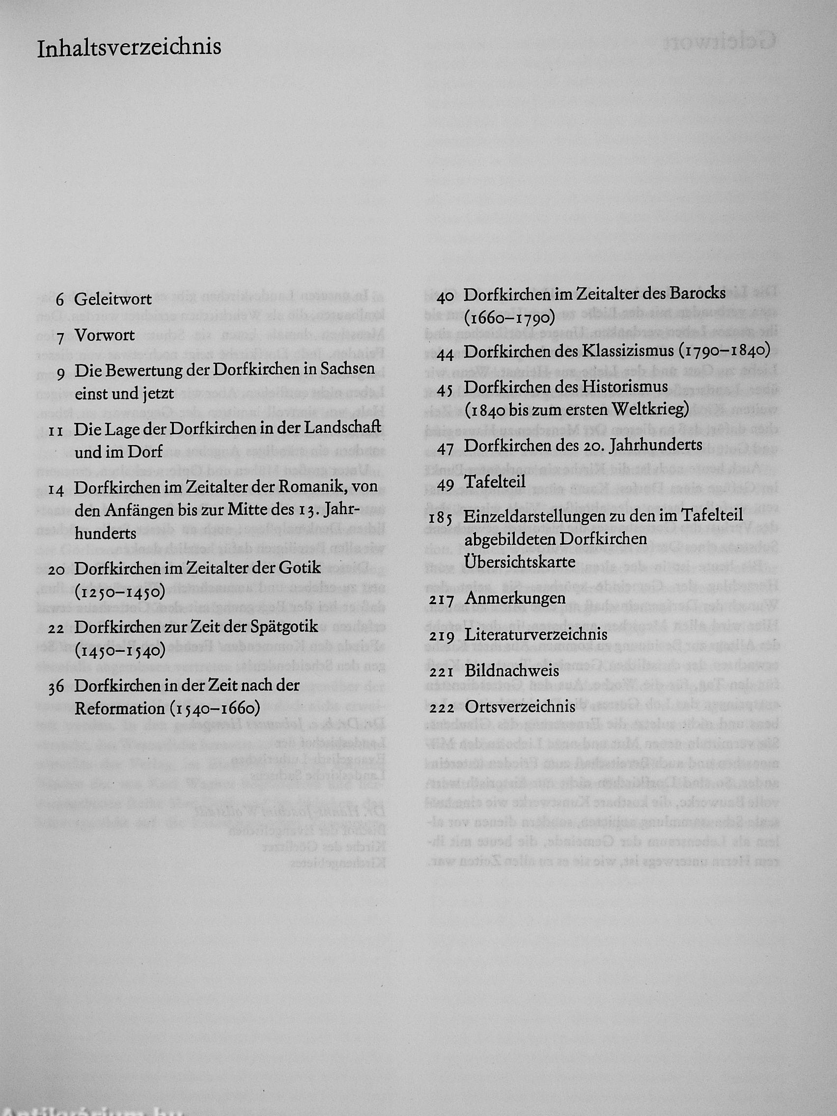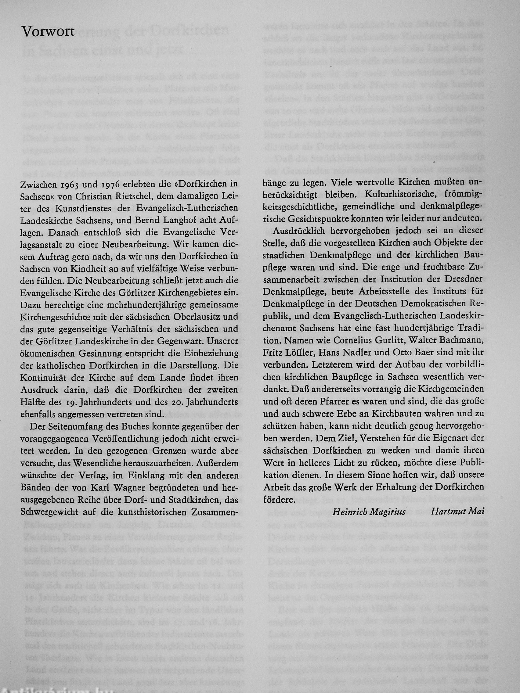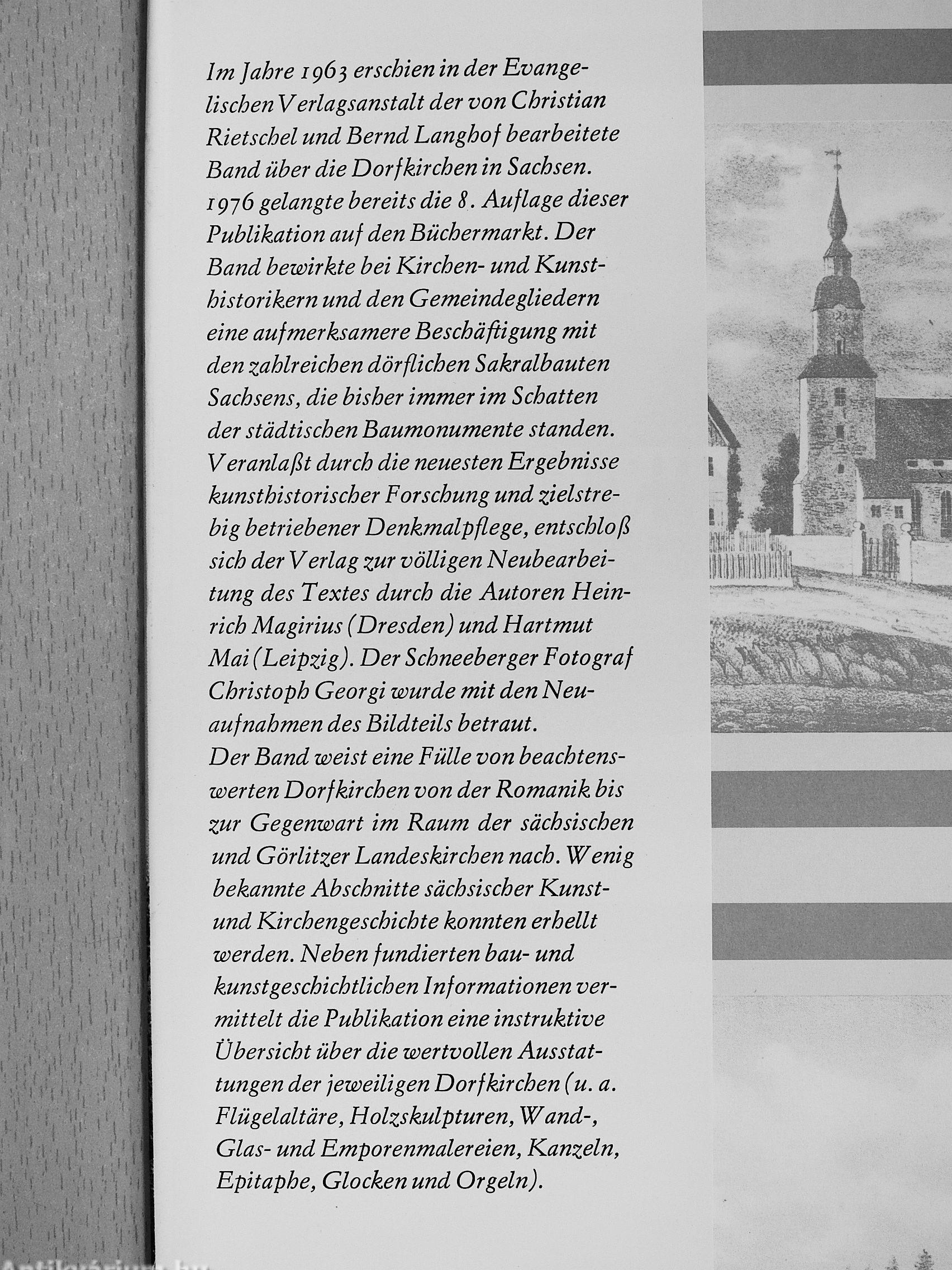 gelangte bereits die 8. Auflage dieser Publikation auf den Büchermarkt. Der Band bewirkte bei Kirchen- und Kunsthistorikern und den Gemeindegliedern eine aufmerksamere Beschäftigung mit den zahlreichen dörflichen Sakralbauten Sachsens, die bisher immer im Schatten der städtischen Baumonumente standen. Veranlaßt durch die neuesten Ergebnisse kunsthistorischer Forschung und zielstrebig betriebener Denkmalpflege, entschloß sich der Verlag zur völligen Neubearbeitung des Textes durch die Autoren Heinrich Magirius (Dresden) und Hartmut Mai (Leipzig). Der Schneeberger Fotograf Christoph Georgi wurde mit den Neuaufnahmen des Bildteils betraut. Der Band weist eine Fülle von beachtenswerten Dorf kirchen von der Romanik bis zur Gegenwart im Raum der sächsischen und Görlitzer Landeskirchen nach. Wenig bekannte Abschnitte sächsischer Kunst-und Kirchengeschichte konnten erhellt werden. Neben fundierten bau- und kunstgeschichtlichen Informationen vermittelt die Publikation eine instruktive Übersicht über die wertvollen Ausstattungen der jeweiligen Dorfkirchen (u. a. Flügelaltäre, Holzskulpturen, Wand-, Glas- und Emporenmalereien, Kanzeln, Epitaphe, Glocken und Orgeln).