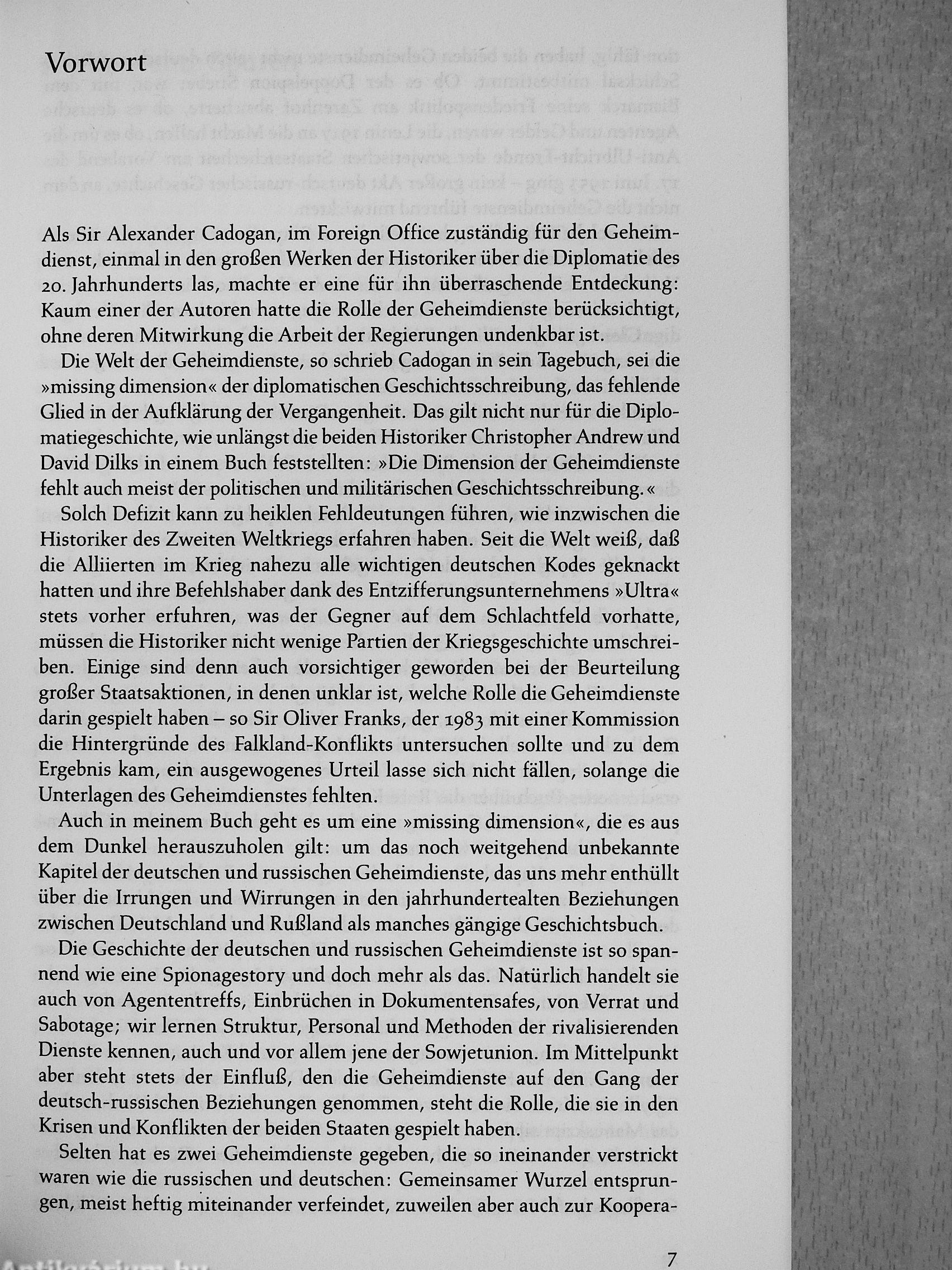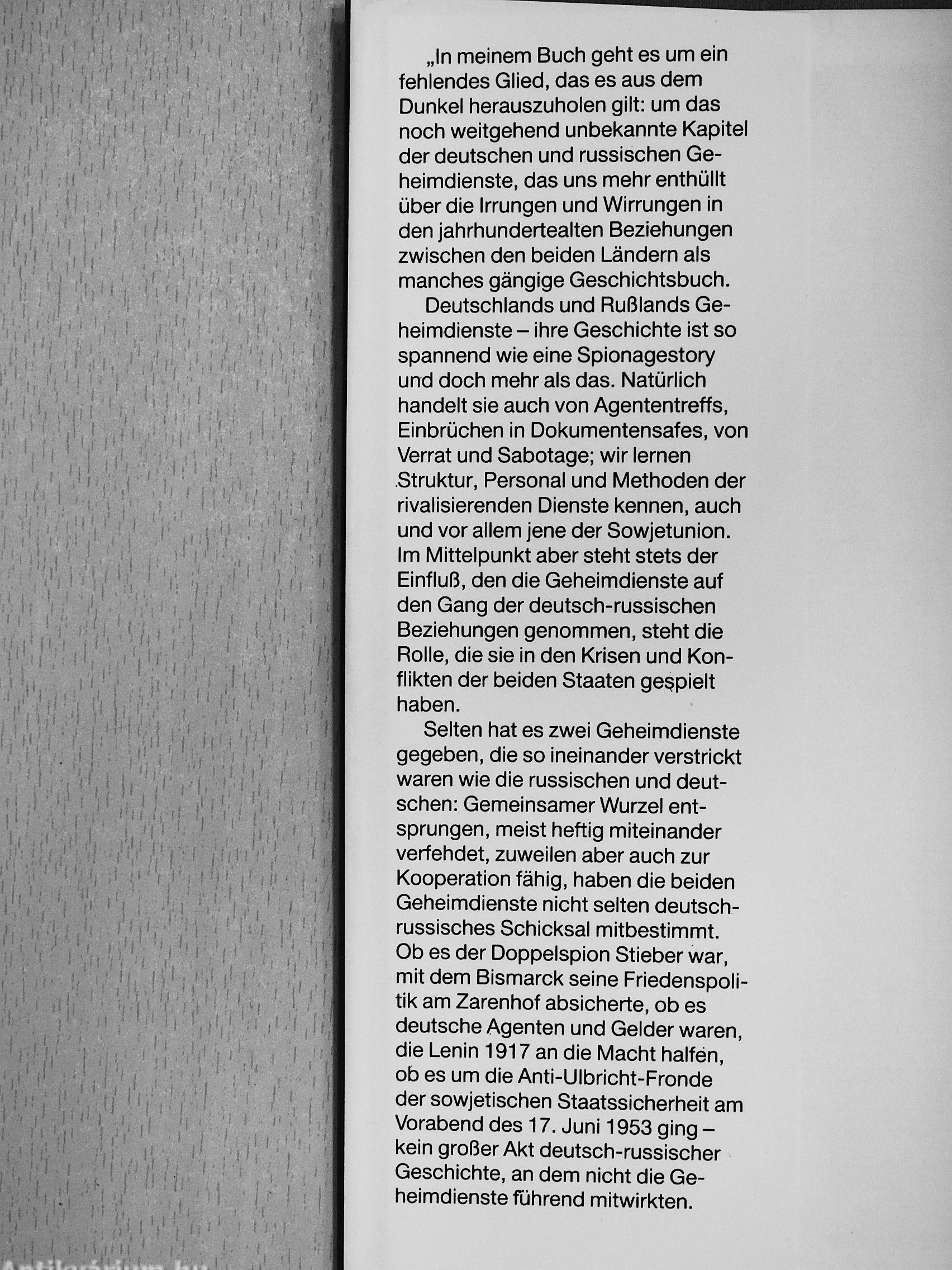 „In meinem Buch geht es um ein fehlendes Glied, das es aus dem Dunkel herauszuholen gilt: um das noch weitgehend unbekannte Kapitel der deutschen und russischen Geheimdienste, das uns mehr enthüllt über die Irrungen und Wirrungen in den jahrhundertealten Beziehungen zwischen den beiden Ländern als manches gängige Geschichtsbuch.