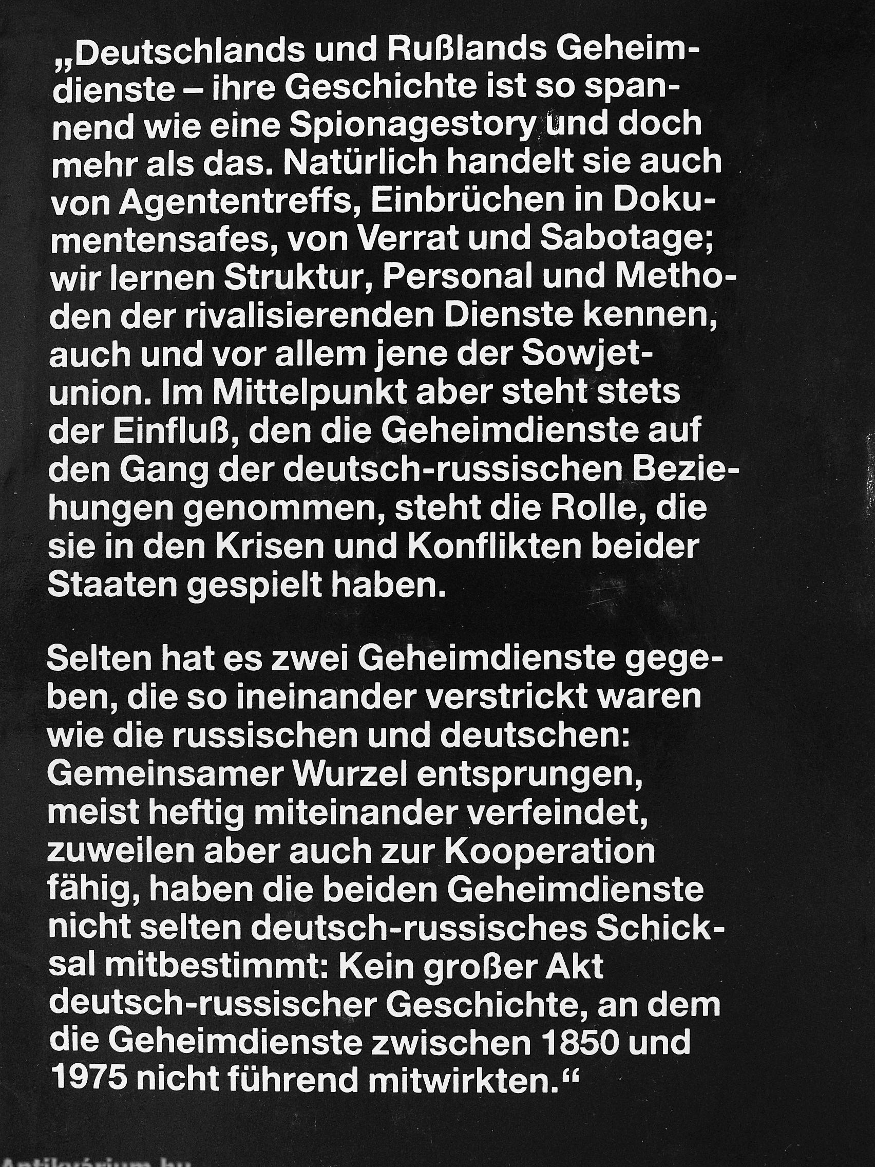 Selten hat es zwei Geheimdienste gegeben, die so ineinander verstrickt waren wie die russischen und deutschen: Gemeinsamer Wurzel entsprungen, meist heftig miteinander verfeindet, zuweilen aber auch zur Kooperation fähig, haben die beiden Geheimdienste nicht selten deutsch-russisches Schicksal mitbestimmt: Kein großer Akt deutsch-russischer Geschichte, an dem die Geheimdienste zwischen 1850 und 1975 nicht führend mitwirkten."