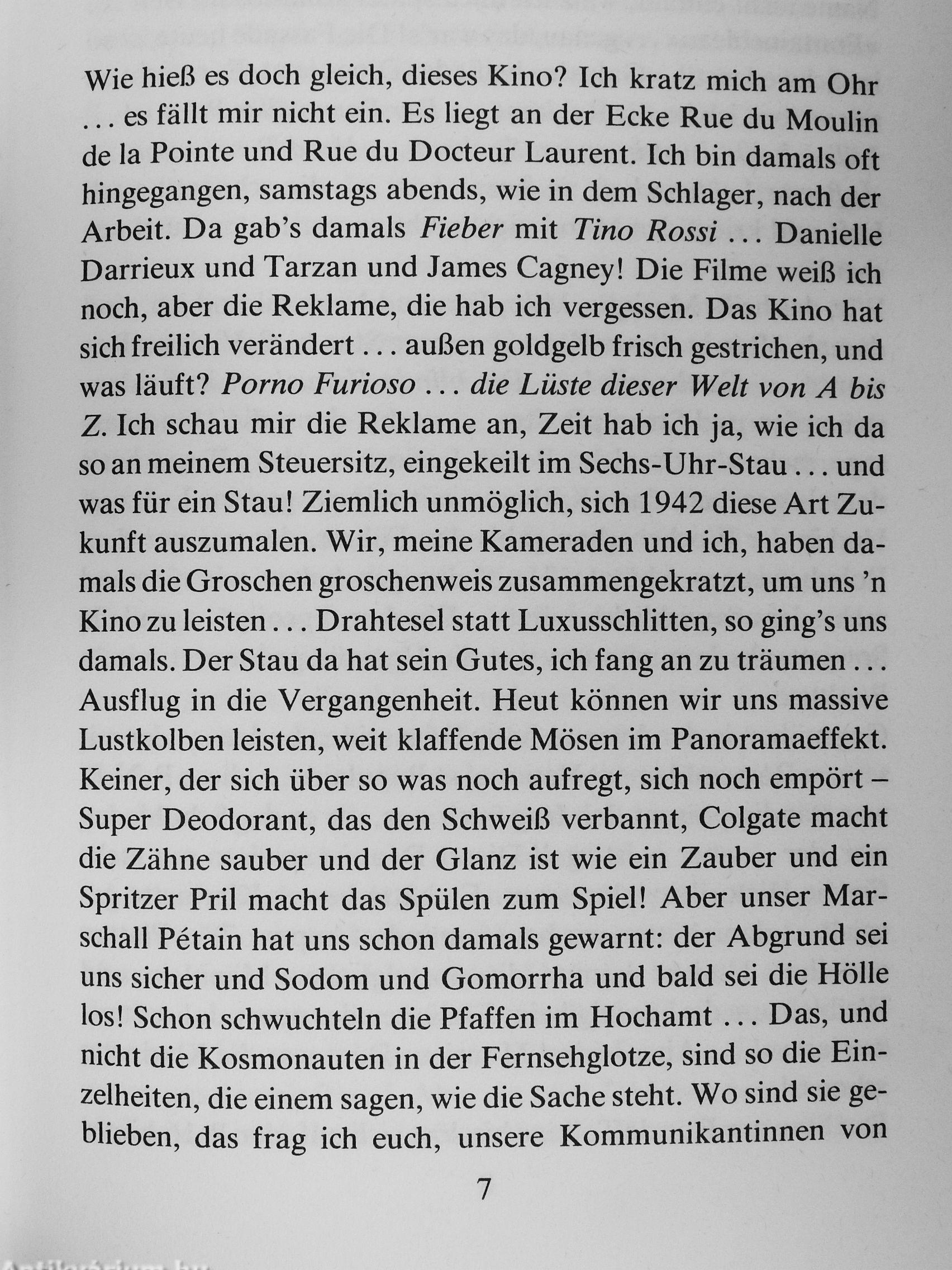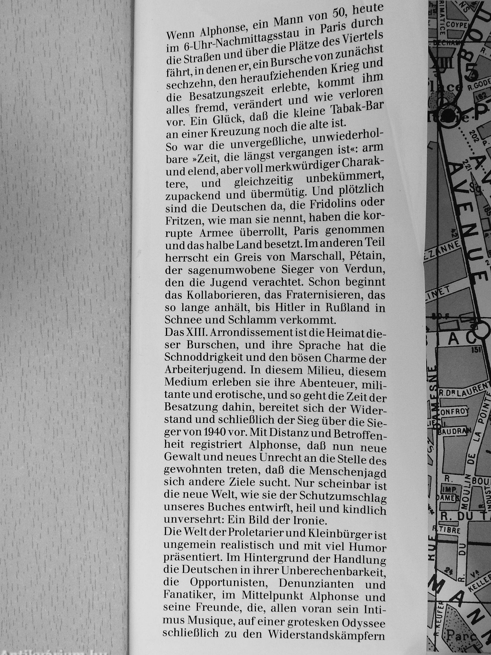 im 6-Uhr-Nachmittagsstau in Paris durch die Straßen und über die Plätze des Viertels fährt, in denen er, ein Bursche von zunächst sechzehn, den heraufziehenden Krieg und die Besatzungszeit erlebte, kommt ihm alles fremd, verändert und wie verloren vor. Ein Glück, daß die kleine Thbak-Bar an einer Kreuzung noch die alte ist. So war die unvergeßliche, unwiederhol-bare »Zeit, die längst vergangen ist«: arm und elend, aber voll merkwürdiger Charaktere, und gleichzeitig unbekümmert, zupackend und übermütig. Und plötzlich sind die Deutschen da, die Fridolins oder Fritzen, wie man sie nennt, haben die korrupte Armee überrollt, Paris genommen und das halbe Land besetzt. Im anderen Teil herrscht ein Greis von Marschall, PStain, der sagenumwobene Sieger von Verdun,' den die Jugend verachtet. Schon beginnt das Rollaborieren, das Fraternisieren, das so lange anhält, bis Hitler in Rußland in Schnee und Schlamm verkommt. Das Xni. Arrondissement ist die Heimat...