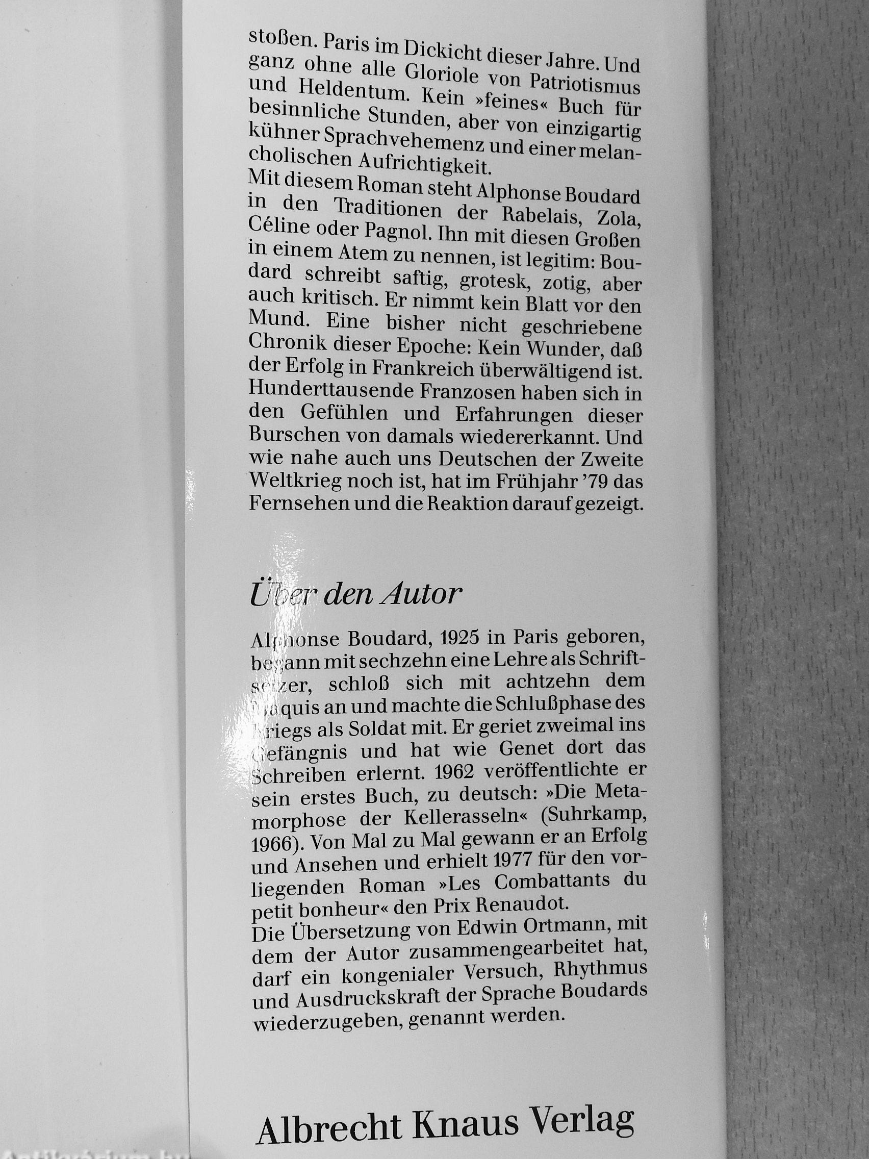Alfiiionse Boudard, 1925 in Paris geboren, begann mit sechzehn eine Lehre als Schrift-s<' zer, schloß sich mit achtzehn dem ' U! quis an und machte die Schlußphase des ' riegs als Soldat mit. Er geriet zweimal ins Gefängnis und hat wie Genet dort das Schreiben eriernt. 1962 veröffentlichte er sein erstes Buch, zu deutsch: »Die Metamorphose der Kellerasseln« (Suhrkamp, 1966). Von Mal zu Mal gewann er an Erfolg und Ansehen und erhielt 1977 für den vorliegenden Roman »Les Combattants du peüt bonheur« den Prix Renaudot. Die Übersetzung von Edwin Ortmann, mit dem der Autor zusammengearbeitet hat, darf ein kongenialer Versuch, Rhythmus und Ausdruckskraft der Sprache Boudards wiederzugeben, genannt werden.