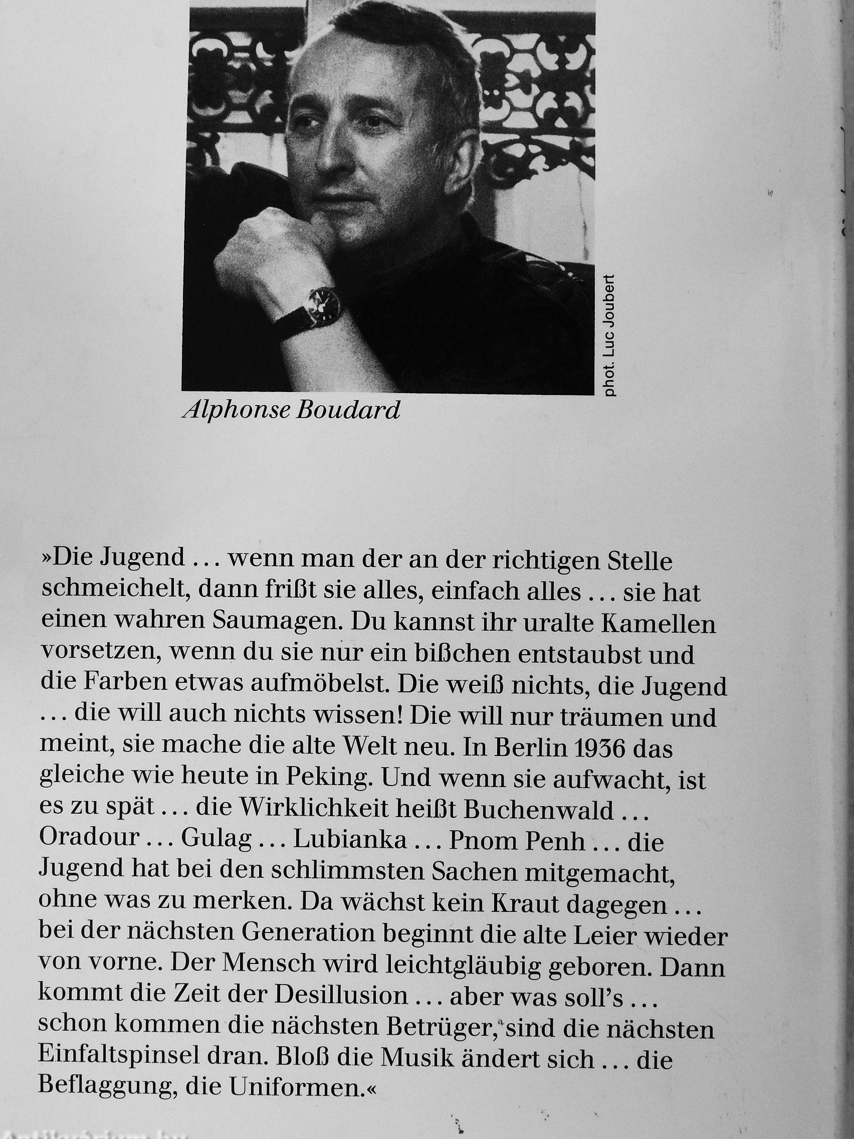 »Die Jugend wenn man der an der richtigen Stelle schmeichelt, dann frißt sie alles, einfach alles sie hat einen wahren Saumagen. Du kannst ihr uralte Ramellen vorsetzen, wenn du sie nur ein bißchen entstaubst und die Farben etwas aufmöbelst. Die weiß nichts, die Jugend die will auch nichts wissen! Die will nur träumen und meint, sie mache die alte Welt neu. In Berlin 1936 das gleiche wie heute in Peking. Und wenn sie aufwacht, ist es zu spät die Wirklichkeit heißt Buchenwald Oradour Gulag Lubianka Fnom Penh die Jugend hat bei den schlimmsten Sachen mitgemacht, ohne was zu merken. Da wächst kein Kraut dagegen bei der nächsten Generation beginnt die alte Leier wieder von vorne. Der Mensch wird leichtgläubig geboren. Dann kommt die Zeit der Desillusion aber was soll's schon kommen die nächsten Betrüger,"sind die nächsten Einfaltspinsel dran. Bloß die Musik ändert sich die Beflaggung, die Uniformen.«