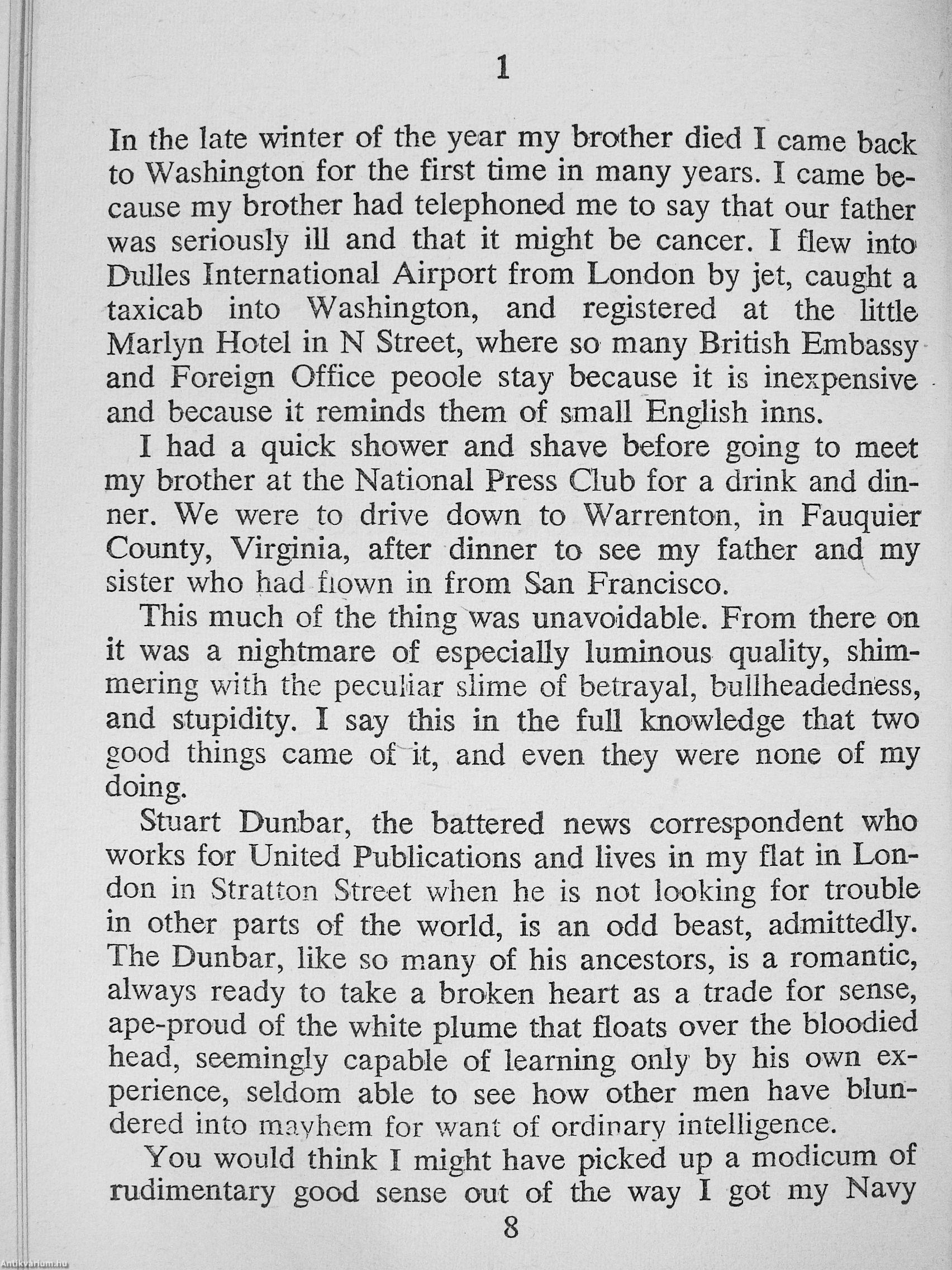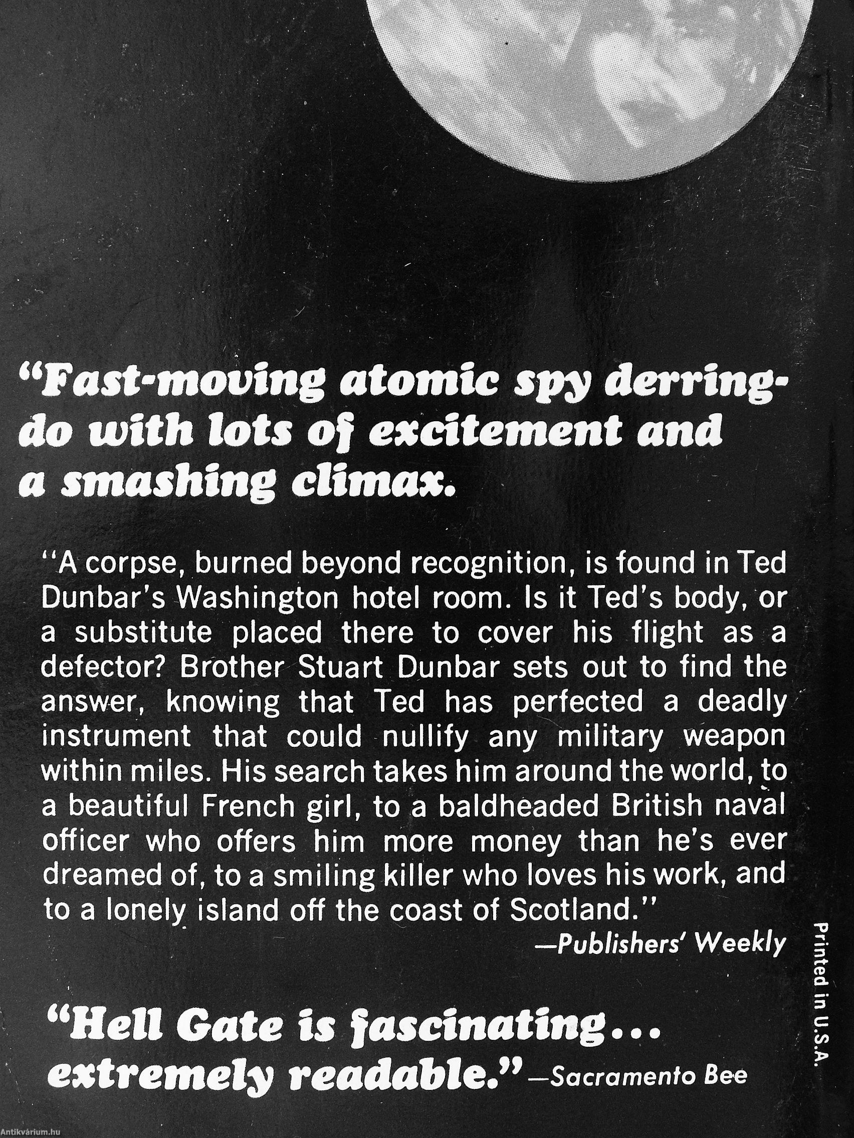 "A corpse, burned beyond recognition, is found in Ted Dunbar's Washington hotel room. Is it Ted's body, or a substitute placed there to cover his flight as a defector? Brother Stuart Dunbar sets out to find the answer, knowing that Ted has perfected a deadly instrument that could nullify any military weapon within miles. His search takes him around the world, to a beautiful French girl, to a baldheaded British naval officer who offers him more money than he's ever dreamed of, to a smiling killer who loves his work, and to a lonely island off the coast of Scotland."
