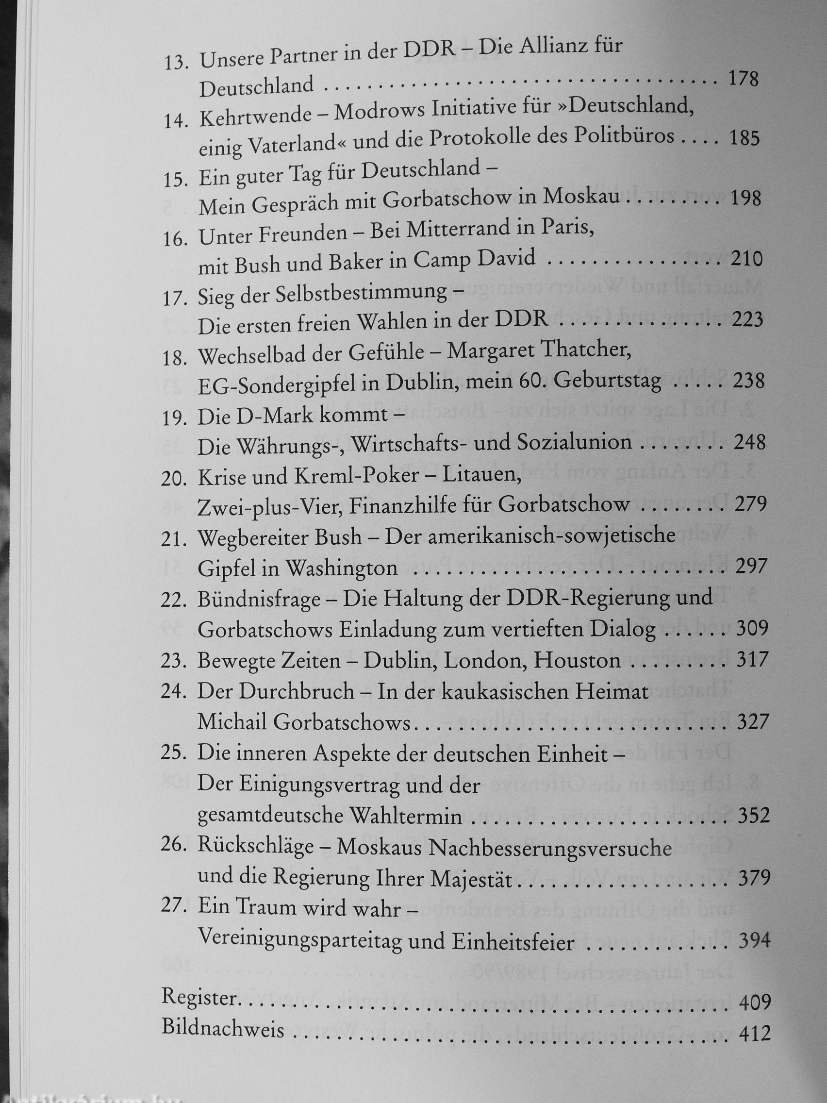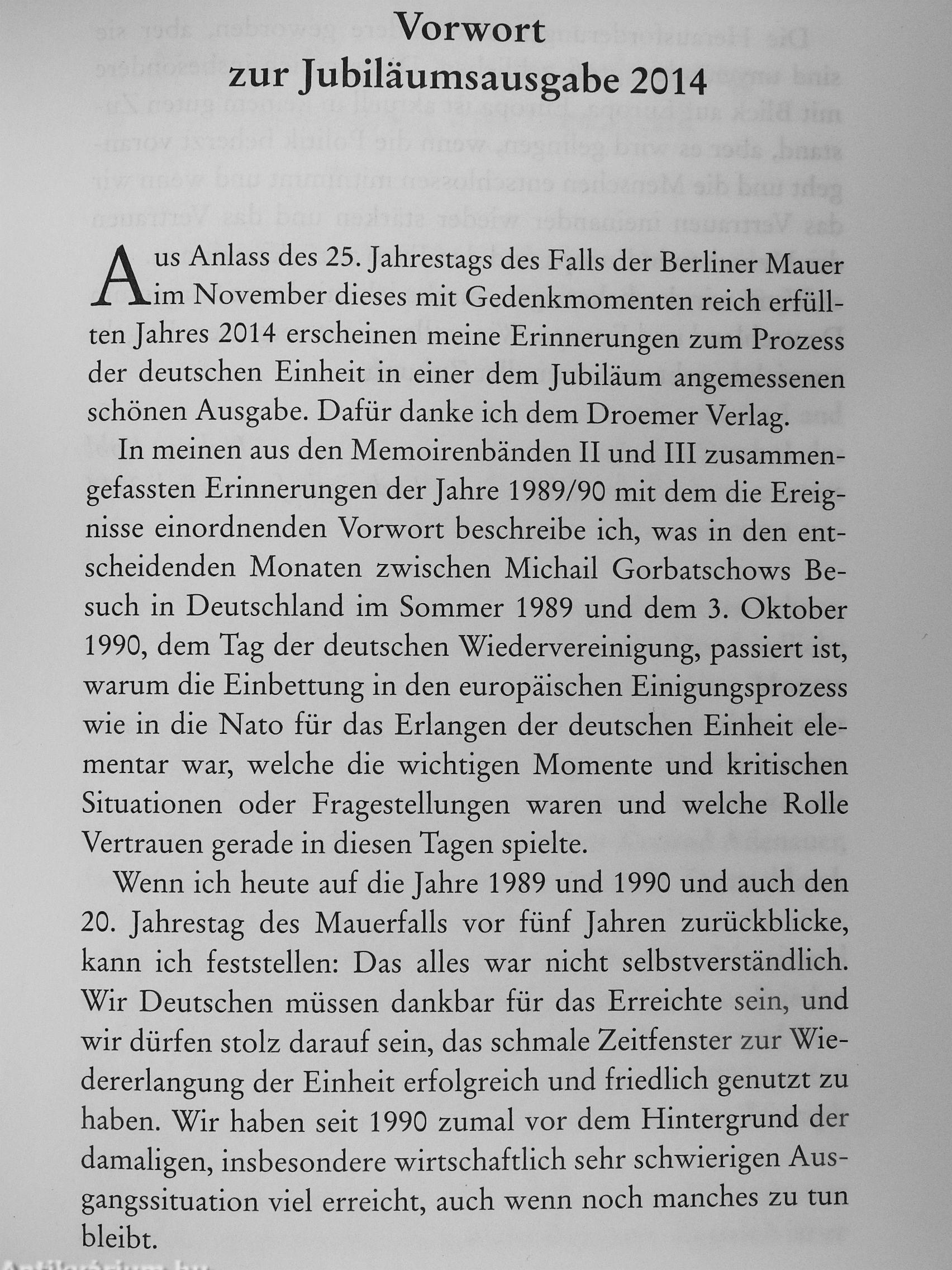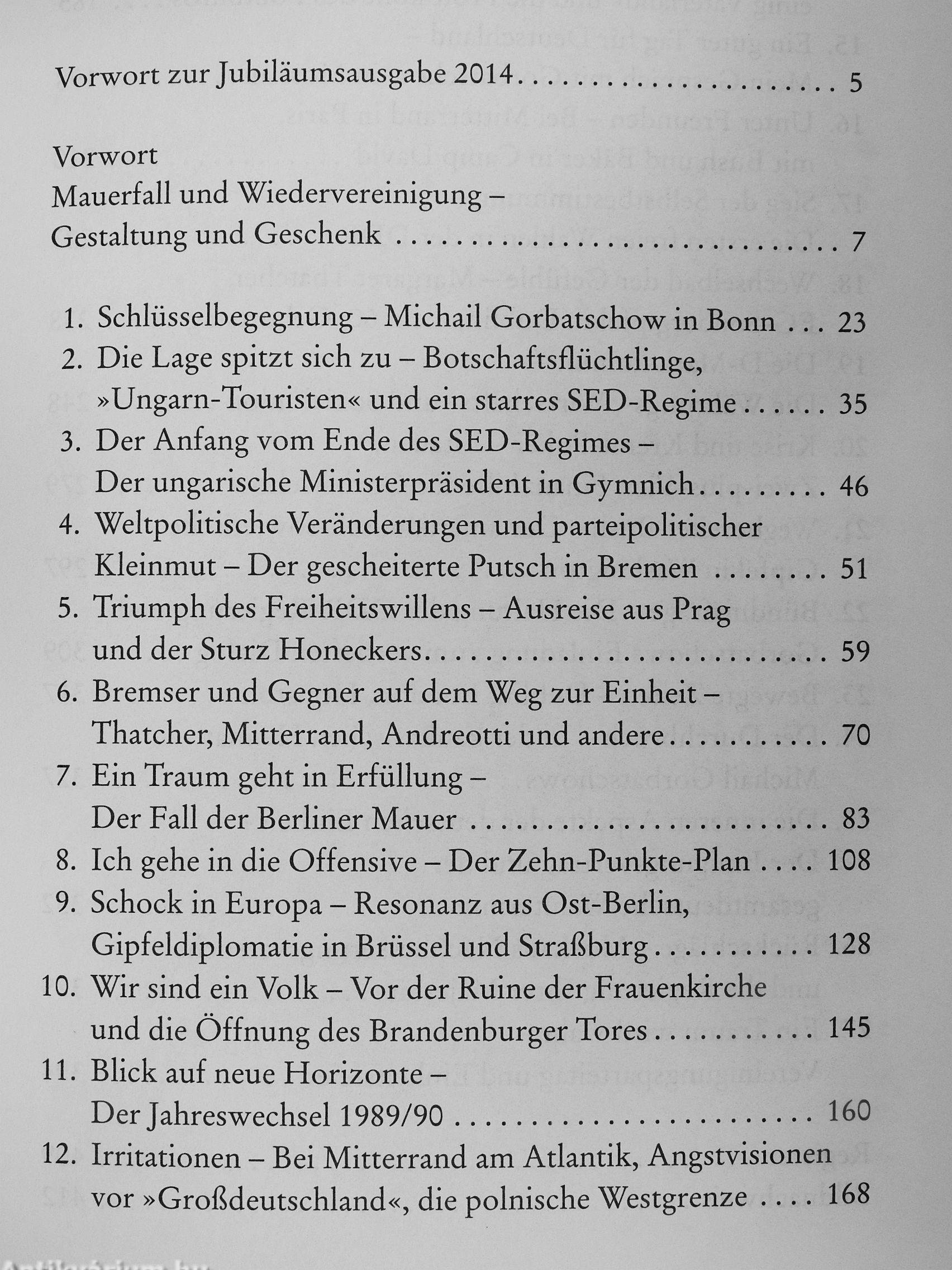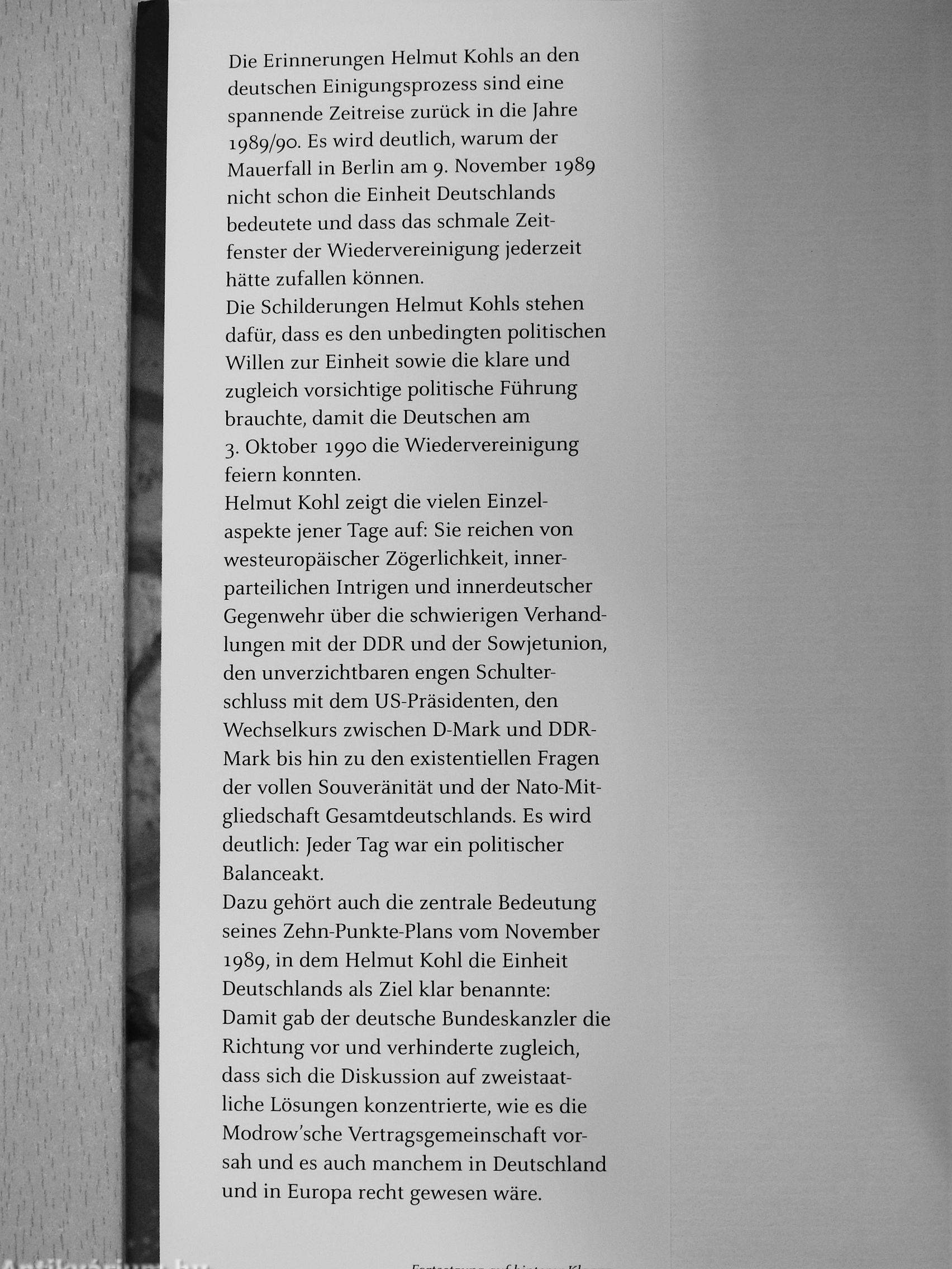 Helmut Kohl zeigt die vielen Einzelaspekte jener Tage auf: Sie reichen von westeuropäischer Zögerlichkeit, innerparteilichen Intrigen und innerdeutscher Gegenwehr über die schwierigen Verhandlungen mit der DDR und der Sowjetunion, den unverzichtbaren engen Schuher-schluss mit dem US-Präsidenten, den Wechselkurs zwischen D-Mark und DDR-Mark bis hin zu den existentiellen Fragen der vollen Souveränität und der Nato-Mit-gliedschaft Gesamtdeutschlands. Es wird deutlich: Jeder Tag war ein politischer Balanceakt.