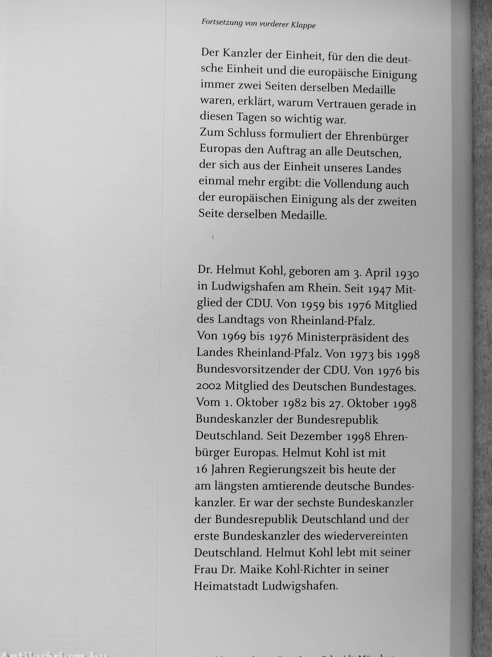 Der Kanzler der Einheit, für den die deutsche Einheit und die europäische Einigung | immer zwei Seiten derselben Medaille waren, erklärt, warum Vertrauen gerade in ^ diesen Tagen so wichtig war. Zum Schluss formuliert der Ehrenbürger Europas den Auftrag an alle Deutschen, der sich aus der Einheit unseres Landes einmal mehr ergibt; die Vollendung auch der europäischen Einigung als der zweiten Seite derselben Medaille.