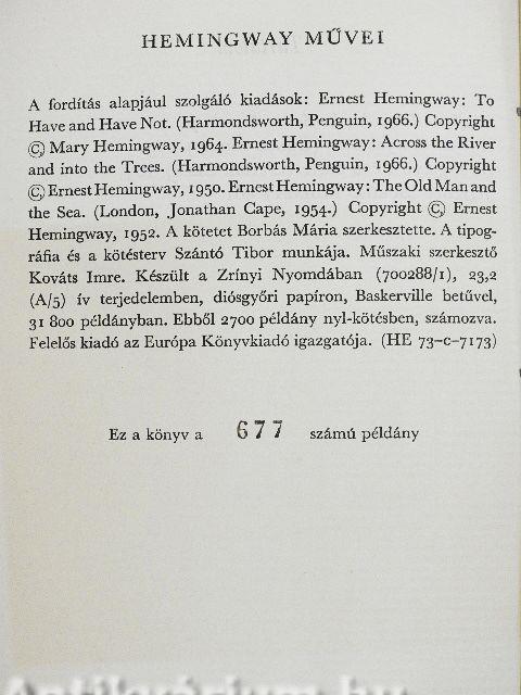 | 5. kötet: Szegények és gazdagok/A folyón át a fák közé/Az öreg halász és a tenger (1971) | 568 p. |