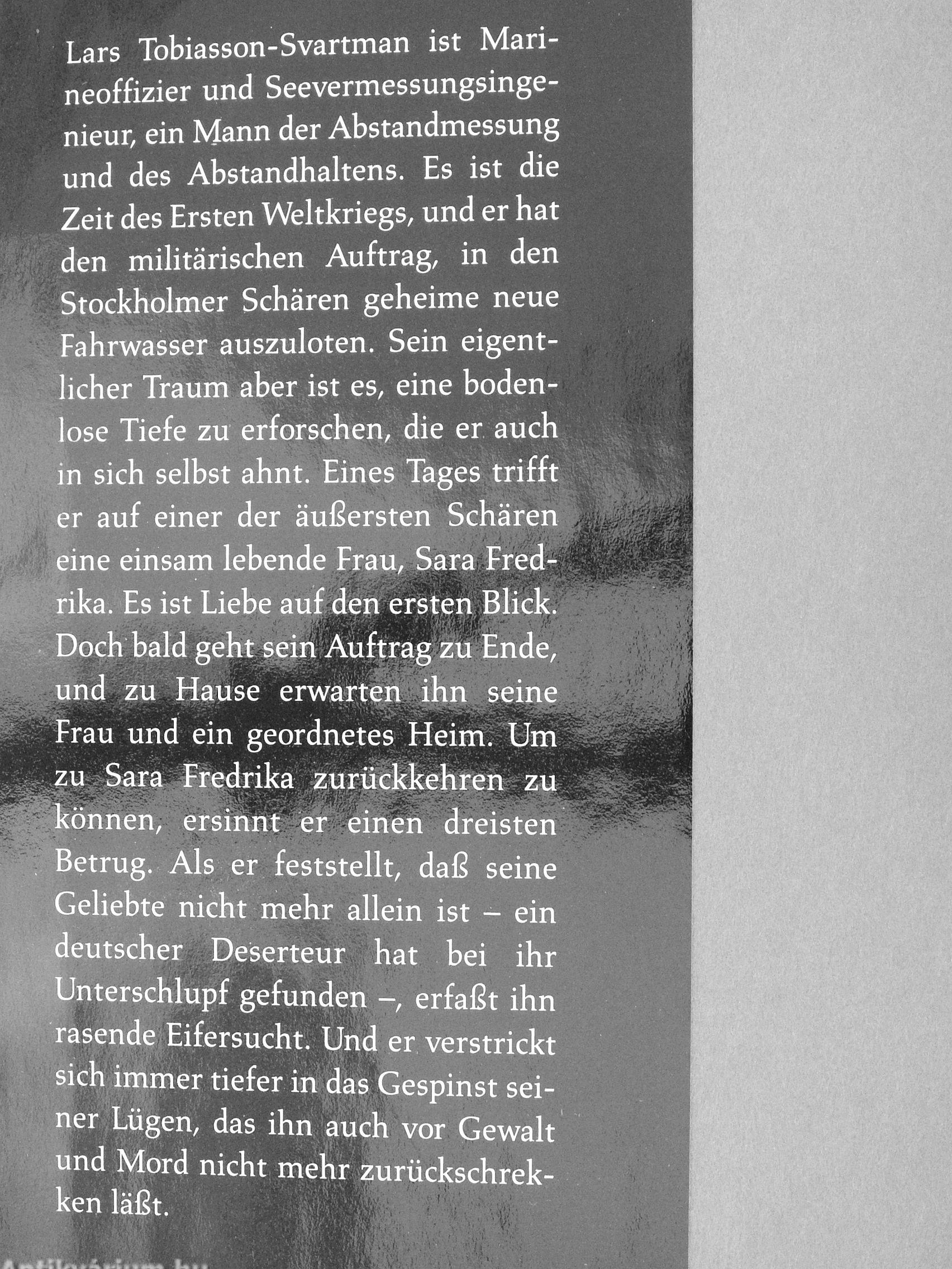 Lars Tobiasson-Svartman ist Marineoffizier und Seevermessungsingenieur, ein Mann der Abstandmessung und des Abstandhaltens. Es ist die Zeit des Ersten Weltkriegs, und er hat den militärischen Auftrag, in den Stockholmer Schären geheime neue Fahrwasser auszuloten. Sein eigent-hcher Traum aber ist es, eine bodenlose Tiefe zu erforschen, die er auch in sich selbst ahnt. Eines Tages trifft er auf einer der äußersten Schären eine einsam lebende Frau, Sara Fred-rika. Es ist Liebe au^ den ersinn Blick. Doch bald geht seiniAuftrag ^Ende, und zu Hause erwarten ihn seine Frau und ein geordnetes Hein^Um'^^f;^'^^ ,zu_^Sara Fredrika zurückkehren zul können, ersinrif'-^er einen dreisten ¦ Betrug. Als er feststellt, daß seine Geliebte nicht mehr allein ist - ein deutscher Deserteur hat bei ihr Unterschlupf gefunden -, erfaßt ihn rasende Eifersucht. Und er verstrickt sich immer tiefer in das Gespinst seiner Lügen, das ihn auch vor Gewalt und Mord nicht mehr zurückschrek-ken läßt