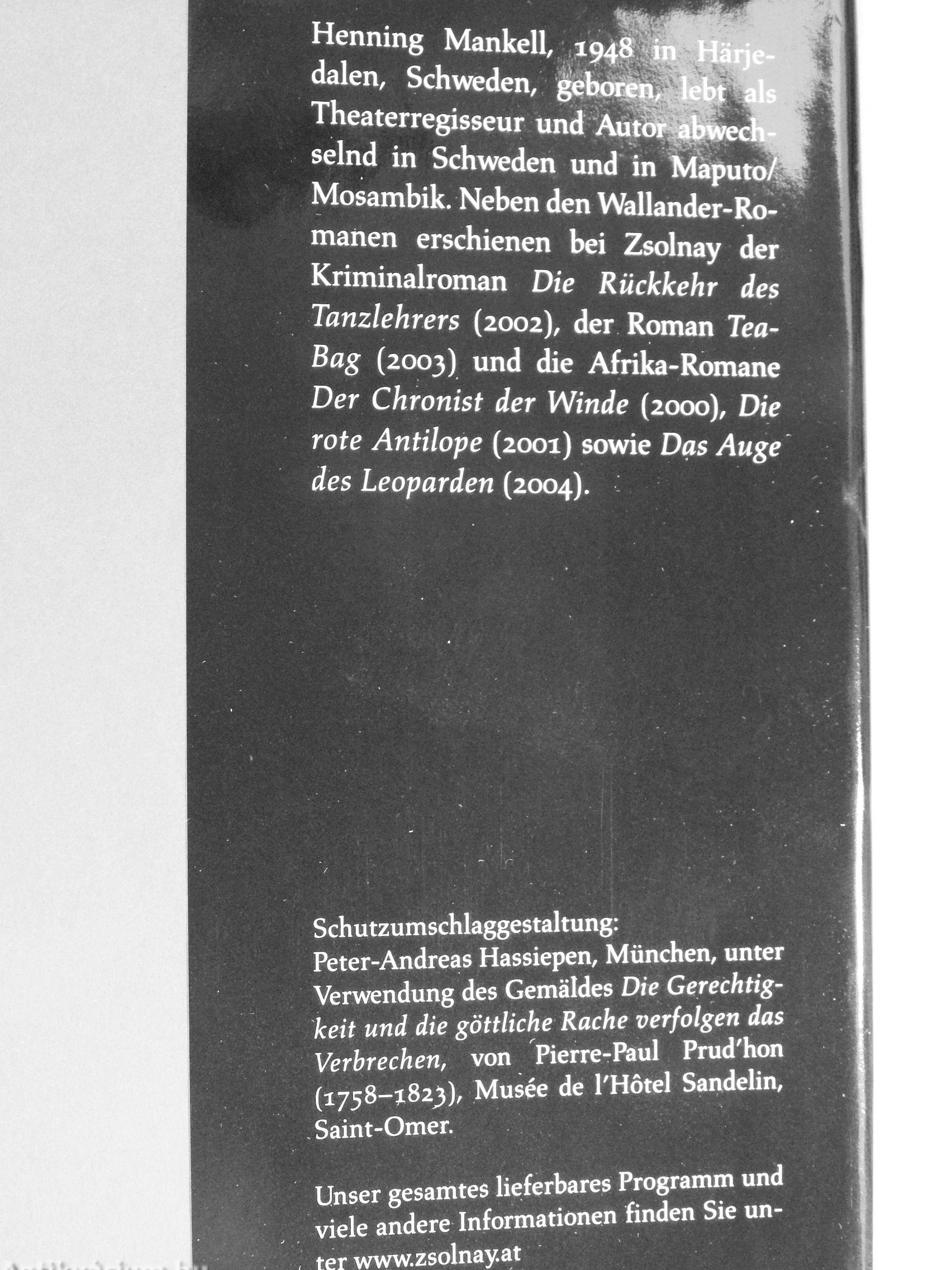 Henning Mankell, 1948 m dalen, Schweden, ?eborcn^ Theaterregisseur und Autor wechselnd in Schweden und in Maputo/ Mosambik. Neben den Wallander-Romanen erschienen bei Zsolnay der Kriminalroman Die Rückkehr des Tanzlehrers (2002), der Roman Tea-Bag (2003) und die Afrika-Romane Der Chronist der Winde (2000), Die rote Antilope (2001) sowie Das Auge des Leoparden (2004). ¦