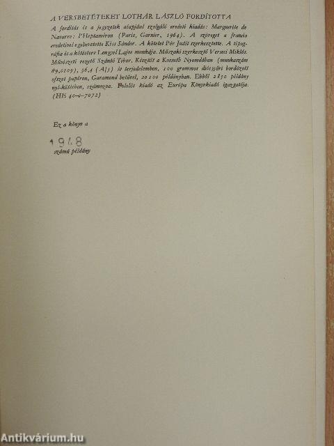 A nagy esőzés veszteglésre kényszerít egy francia nemes urakból és úri hölgyekből álló társaságot egy dél-franciaországi apátságban. Hogy unalmukat elűzzék, elhatározzák: amíg el nem készül a megáradt folyón átvezető híd, igaz történetekkel mulattatják majd önmagukat s egymást. - A tíz napra tervezett pihenő napi tíz történetében megelevenedik a színes francia reneszánsz, I. Ferenc király uralkodásának mozgalmas kora. Erőszakos és kegyetlen hercegek, jámbor és bölcs fejedelmek, sima szavú udvaroncok, csalafinta udvarhölgyek, felszarvazott férjek és kikapós menyecskék, kéjre és pénzre sóvárgó csuhás barátok, furfangos kereskedők, ármányos ügyvédek, együgyű parasztok mulatságos vagy drámai alakját kelti életre Margit királyasszony tolla. S ami különös pikantériával fűszerezi a történeteket: a szereplők többnyire valóságos személyek, a királyi család és közvetlen környezete. - Mese és valóság, szelídség és kegyetlenség, bosszú és megbocsátás, vidám érzékiség és komor önsanyargatás, derűs istentagadás és mély vallásosság keveredik a Heptameron lapjain, a szerző szándékosan naiv, elbájolóan suta, meg-megtorpanó, neki-nekiiramodó előadásában. - Margit navarrai királyasszony korának egyik legműveltebb, legokosabb asszonya volt: a mai olvasót is elbűvöli szellemével és bájával, üde érzelmességével és szenvedélyes igazságszeretetével. Vissza