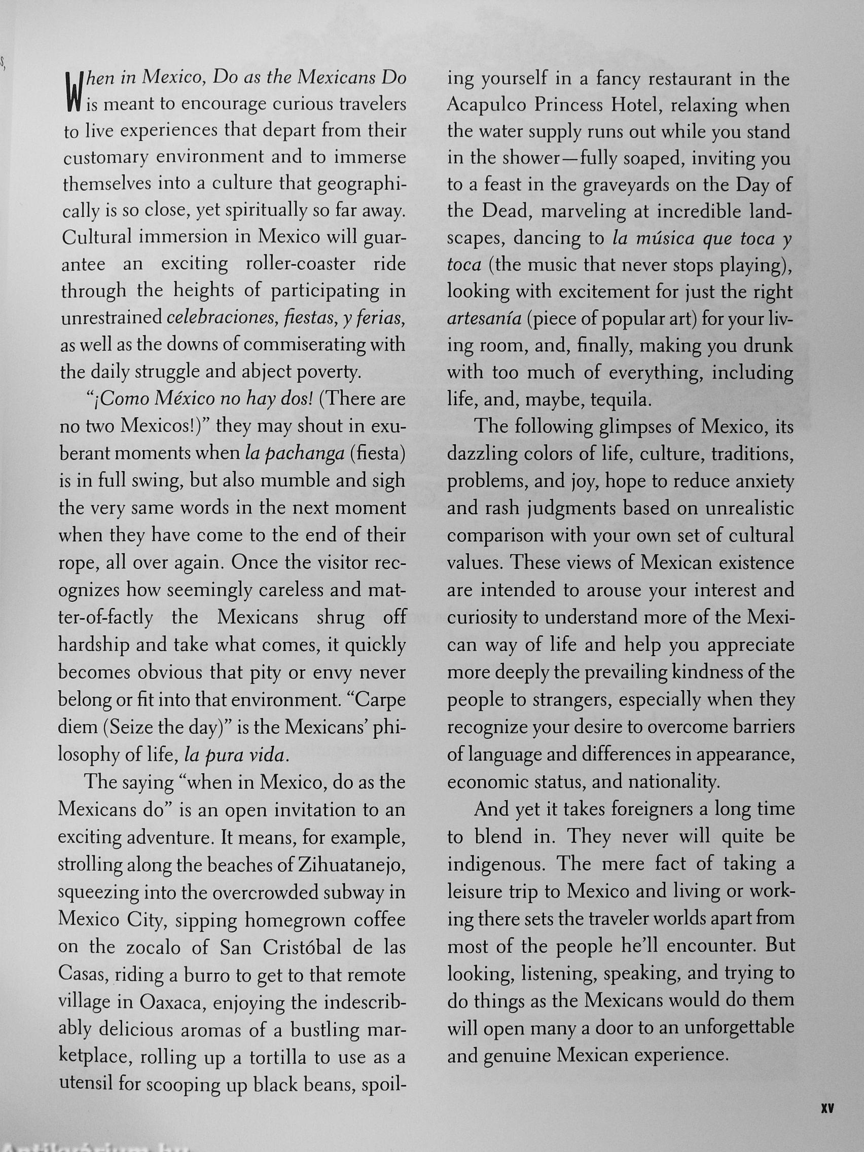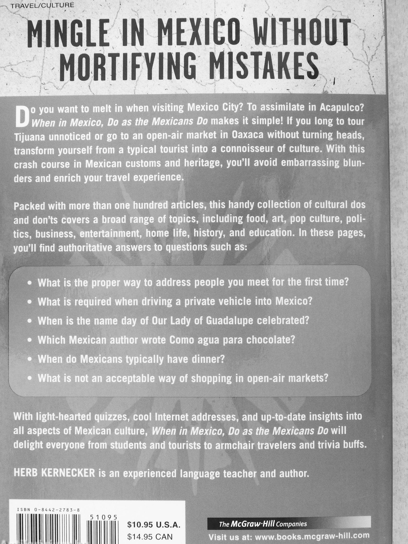 With light-hearted quizzes, cool Internet addresses, and up-to-date insights into all aspects of Mexican culture. When in Mexico, Do as the Mexicans Do will delight everyone from students and tourists to armchair travelers and trivia buffs.