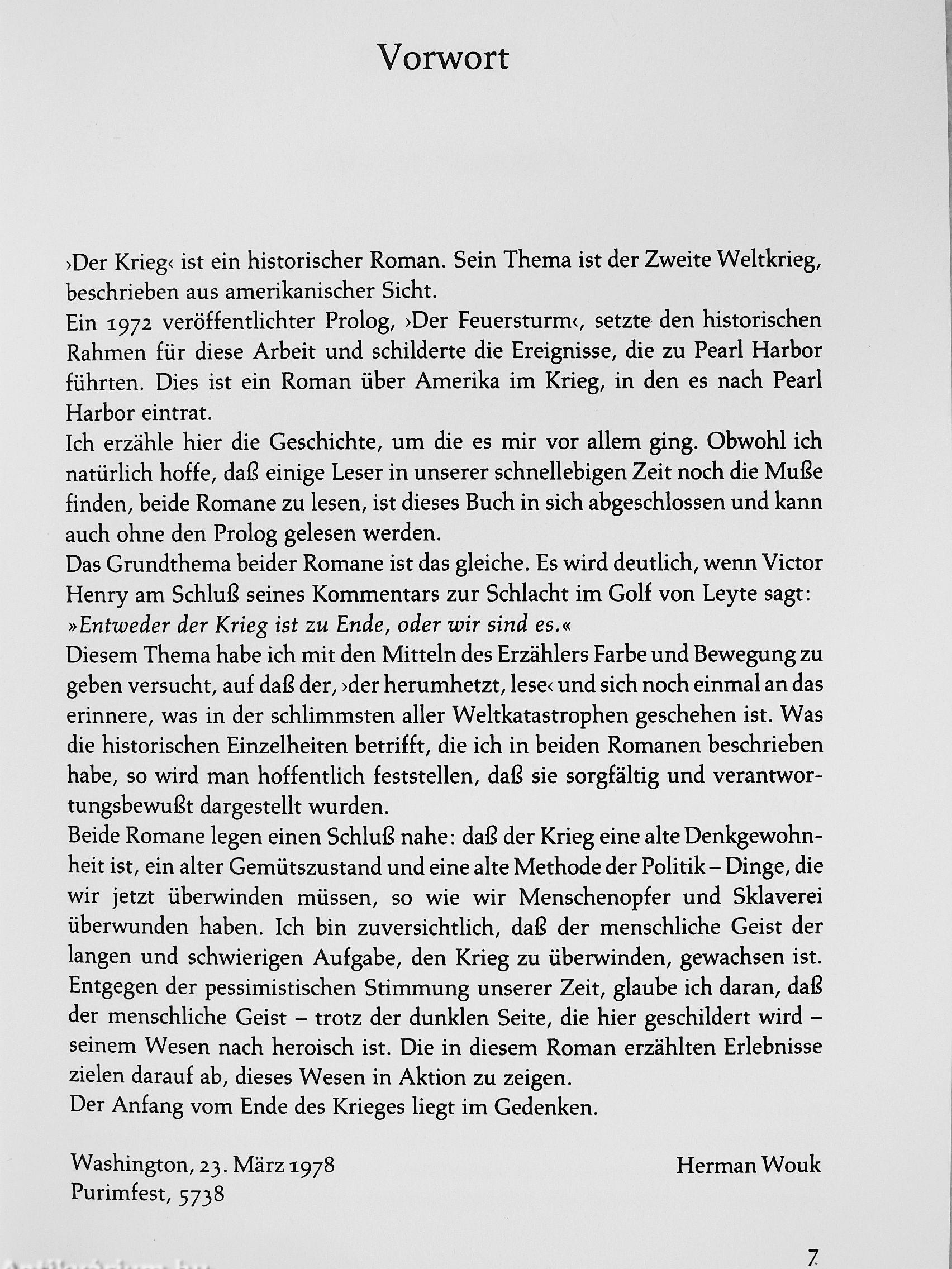 Vor diesem Hintergrund verbindet Herman Wouk in faszinierender Erzählweise die Geschichte des Krieges mit einer Famihengeschichte. Die Hauptfiguren seines Romans »Der Feuersturm« treten von neuem auf: Captain Victor Henry, Kommandant eines Kreuzers der US-Flotte, seine Frau Rhoda, seine Söhne Byron und Warren; Byrons jüdische Frau Natalie und ihr Onkel, der Schriftsteller Aaron Jastrow, in Europa vom Krieg überrascht; der englische Rundfunkkommentator Ahstair Tudsbury und seine Tochter Pamela, deren Romanze mit Victor Henry in Moskau begann;