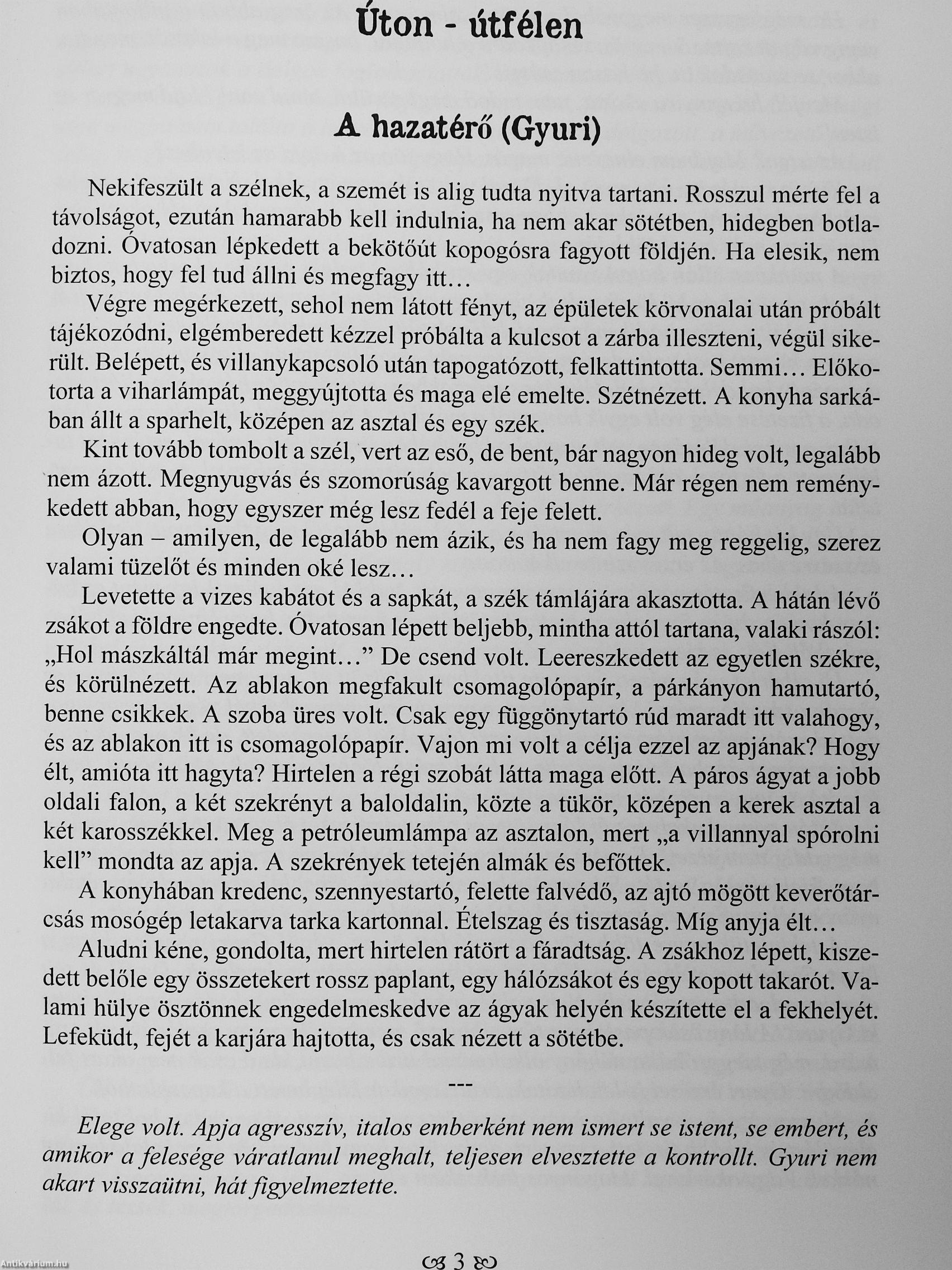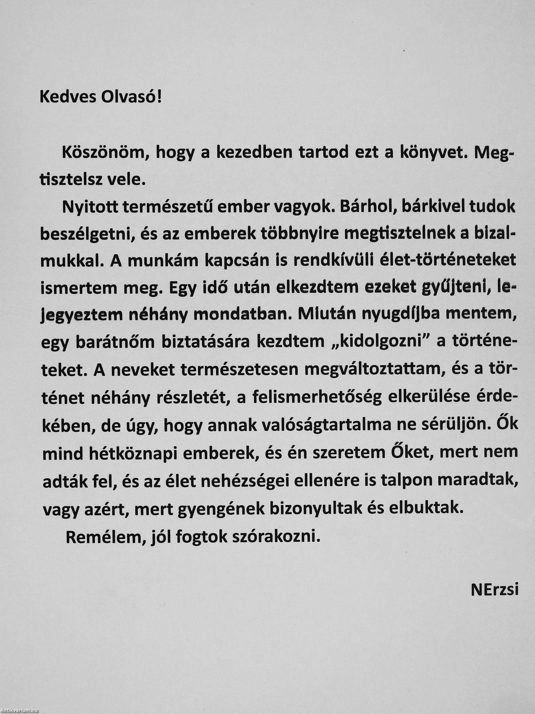 Nyitott természetű ember vagyok. Bárhol, bárkivel tudok beszélgetni, és az emberek többnyire megtisztelnek a bizalmukkal. A munkám kapcsán is rendkívüli élet-történeteket ismertem meg. Egy idő után elkezdtem ezeket gyűjteni, lejegyeztem néhány mondatban. Miután nyugdíjba mentem, egy barátnőm biztatására kezdtem „kidolgozni" a történeteket. A neveket természetesen megváltoztattam, és a történet néhány részletét, a felismerhetőség elkerülése érdekében, de úgy, hogy annak valóságtartalma ne sérüljön. Ők mind hétköznapi emberek, és én szeretem Őket, mert nem adták fel, és az élet nehézségei ellenére is talpon maradtak, vagy azért, mert gyengének bizonyultak és elbuktak.