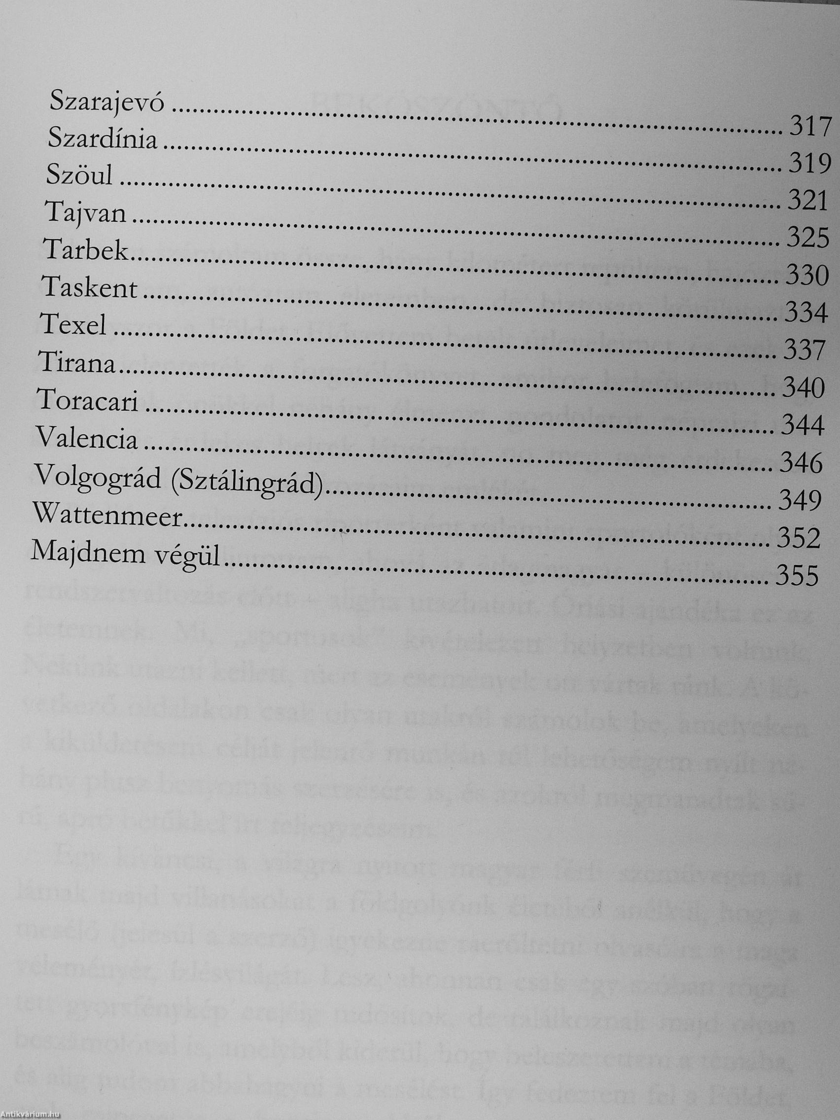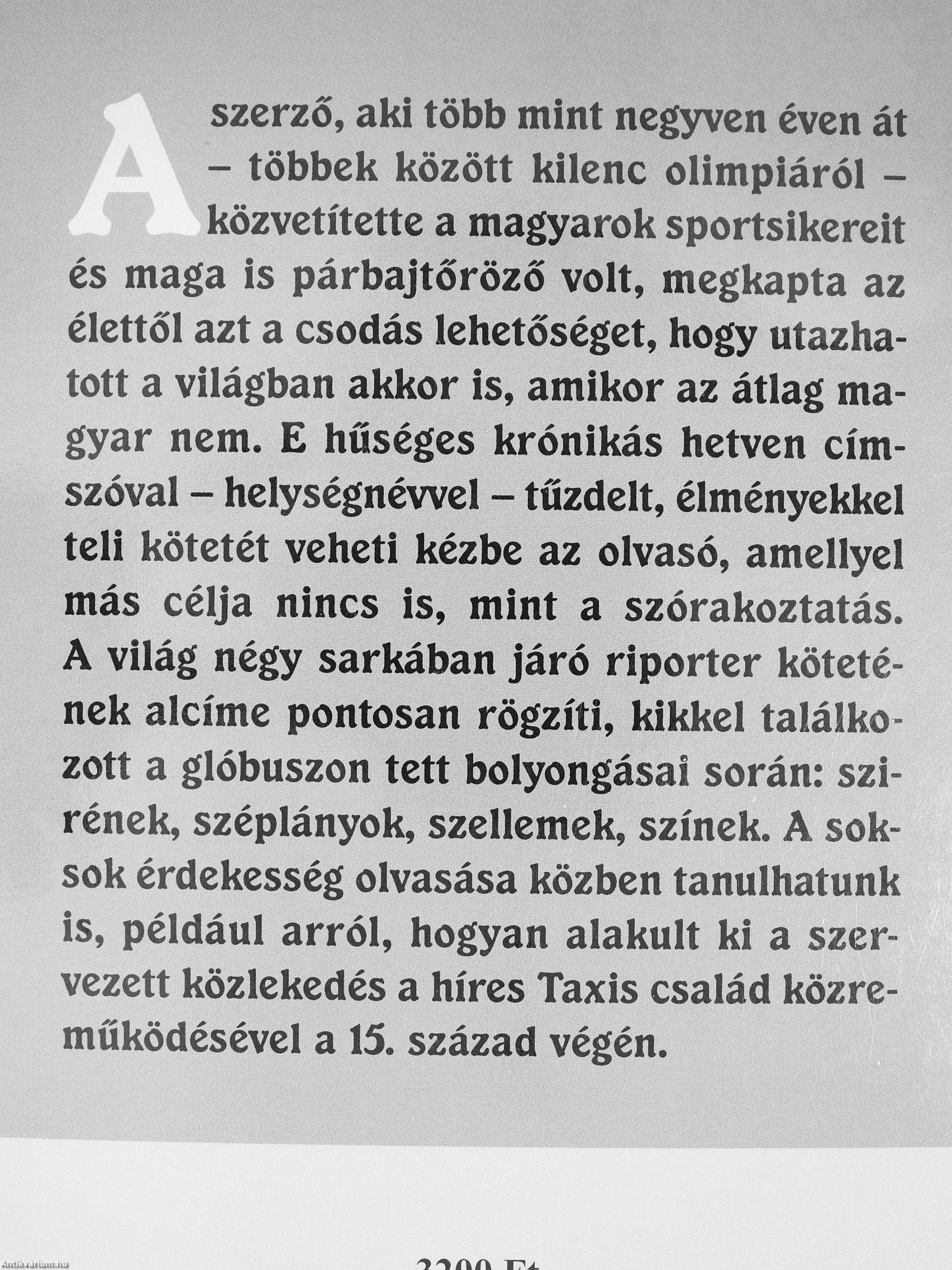 szerző, aki több mint negyven éven át - többek között kilenc olimpiáról -közvetítette a magyarok sportsikereit és maga is párbajtőröző volt, megkapta az élettől azt a csodás lehetőséget, hogy utazhatott a világban akkor is, amikor az átlag magyar nem. E hűséges krónikás hetven címszóval - helységnévvel - tűzdelt, élményekkel teli kötetét veheti kézbe az olvasó, amellyel más célja nincs is, mint a szórakoztatás. A világ négy sarkában járó riporter kötetének alcíme pontosan rögzíti, kikkel találkozott a glóbuszon tett bolyongásai során: szirének, széplányok, szellemek, színek. A soksok érdekesség olvasása közben tanulhatunk is, például arról, hogyan alakult ki a szervezett közlekedés a híres Taxis család közreműködésével a 15. század végén.