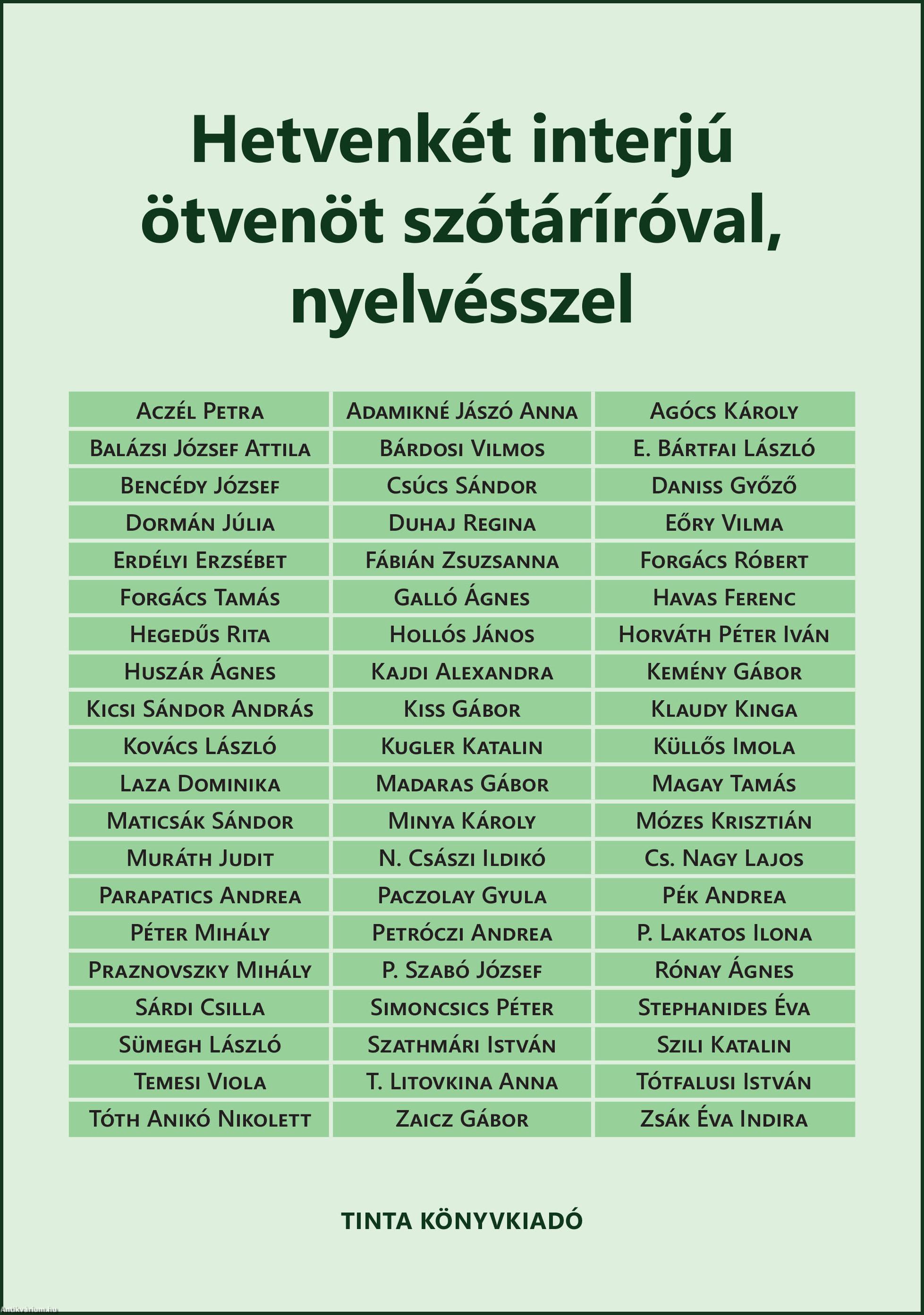 A TINTA Könyvkiadóban az elmúlt két évtizedben gyakran előfordult, hogy egy-egy éppen megjelent könyv szerzőjével interjú készült, majd ezek különböző nyomtatott folyóiratokban (Édes Anyanyelvünk, Magyar Krónika, Magyar Nemzet, Modern Nyelvoktatás, KönyvHét, PrintInfo) vagy elektronikus portálokon (olvassbele.hu, librarius.hu, anyanyelvcsavar.blog.hu, cultura.hu, papiruszportal.hu, RoyalMagazin.hu) napvilágot láttak. Ezekből a beszélgetésekből válogatva most 72 darabot adunk közre ebben a kötetben. Vannak, akikkel egyetlen beszélgetés készült, de jó néhányukkal - mivel az évek folyamán több publikációjuk is megjelent a TINTA Könyvkiadóban - egynél több beszélgetést is tartalmaz a kötet. Az interjúkészítés másik apropóját gyakran az adta, hogy a nyelvész-szótárírót magas színvonalú tudományos, tudománynépszerűsítő munkájának elismeréséül, köszönetképpen Arany Penna díjjal tüntette ki a TINTA Könyvkiadó.Az 55 interjúalany egytől egyig nyelvészeti területének neves szakembere, többen egyetemeken (budapesti Eötvös Loránd Tudományegyetem, Szegedi Tudományegyetem, Debreceni Tudományegyetem, Pannon Egyetem) oktatnak vagy az MTA Nyelvtudományi Intézetének (MTA Nyelvtudományi Kutatóközpont) munkatársai, ill. különböző tudományos testületek és társaságok (MTA Szótári Munkabizottsága, Magyar Alkalmazott Nyelvészek és Nyelvtanárok Egyesülete) tagjai. Az interjúk témája a nyelvészet széles területét öleli fel. Mivel a beszélgetőalanyok közül igen sok egyetemi oktató, számos esetben szóba kerül a nyelvészet oktatásának a helyzete, sőt változása is az elmúlt évtizedekben, és az interjúalanyok több esetben is kitérnek hajdani szeretett középiskolai tanáraikra, megemlítve, milyen sokat köszönhetnek nekik. Mindegyik beszélgetésben szó esik a TINTA Könyvkiadóban épp akkor újonnan megjelent műről, a magyar nyelvtudományi irodalomban a kiadvány előzményeiről, a készítés folyamatáról, a szerkesztés buktatóiról. Mivel a TINTA Könyvkiadó székhelye Albertfalván található, ezért több helytörténeti kiadvány is megjelent a kiadó műhelyében az évek során. Ezek lokálpatrióta szerzőivel is található két beszélgetés a kötetben. A gyűjteményes kötetben nem lehet meghatódottság nélkül olvasni azokat az interjúkat, melyeknek beszélgetőalanyai már nincsenek közöttünk (Balázsi József Attila, Bencédy József, Kemény Gábor, Péter Mihály, Szathmári István, Tótfalusi István). Az interjúkötet beszélgetéseiből kiviláglik, hogy a nyelvészek, a szótárírók mind "megszállott" emberek, a nyelv elhivatott kutatói, érzékeny vizsgálói, a nyelv rejtett kincseinek féltő őrzői.Ajánljuk mindazoknak ezt az interjúkötetet, akik érdeklődnek a modern nyelvészet iránt, és kíváncsiak azokra a "műhelytitkokra", amelyek egy-egy szótár vagy szakkönyv készítésének a hátterében rejtőznek.