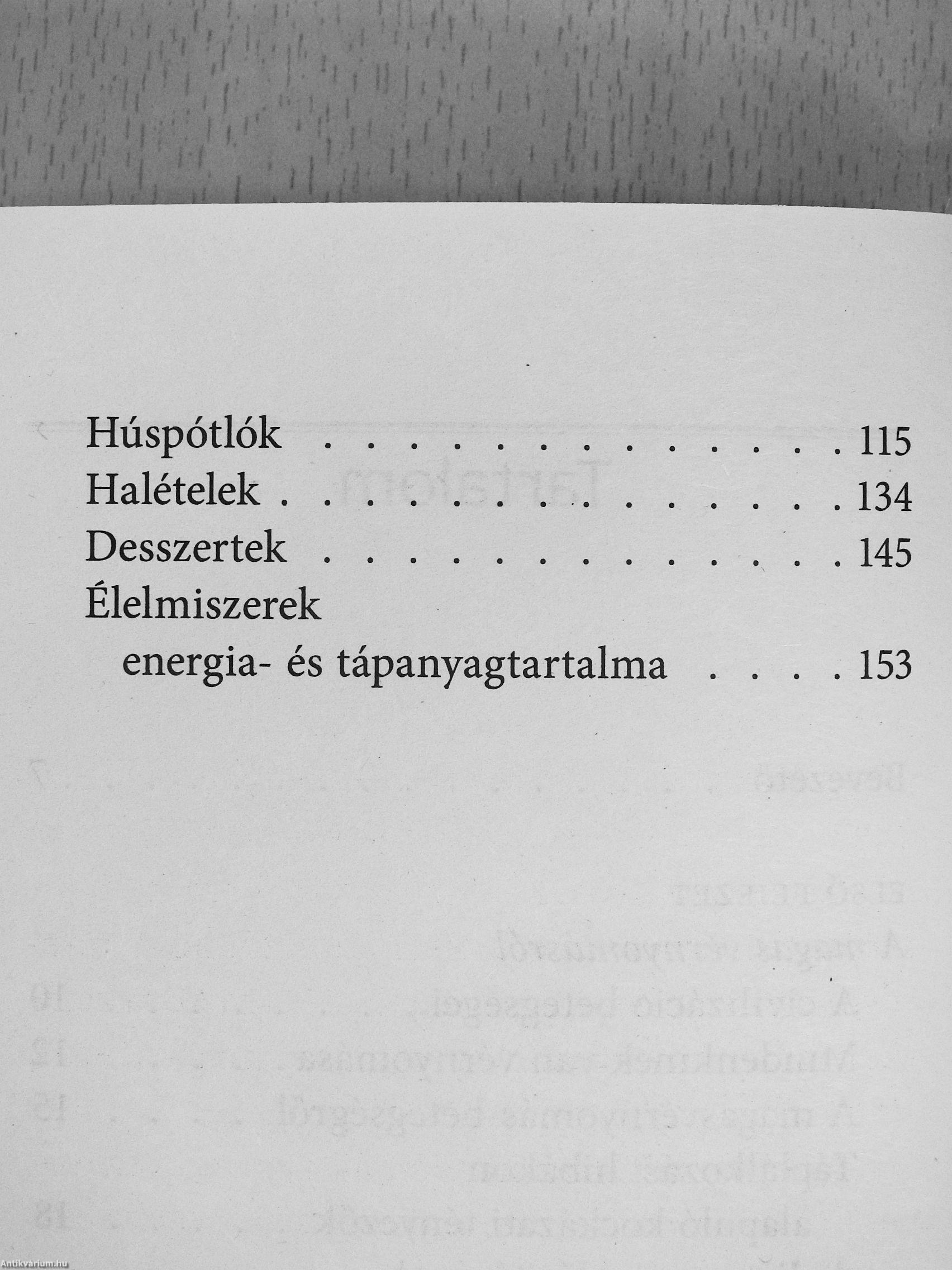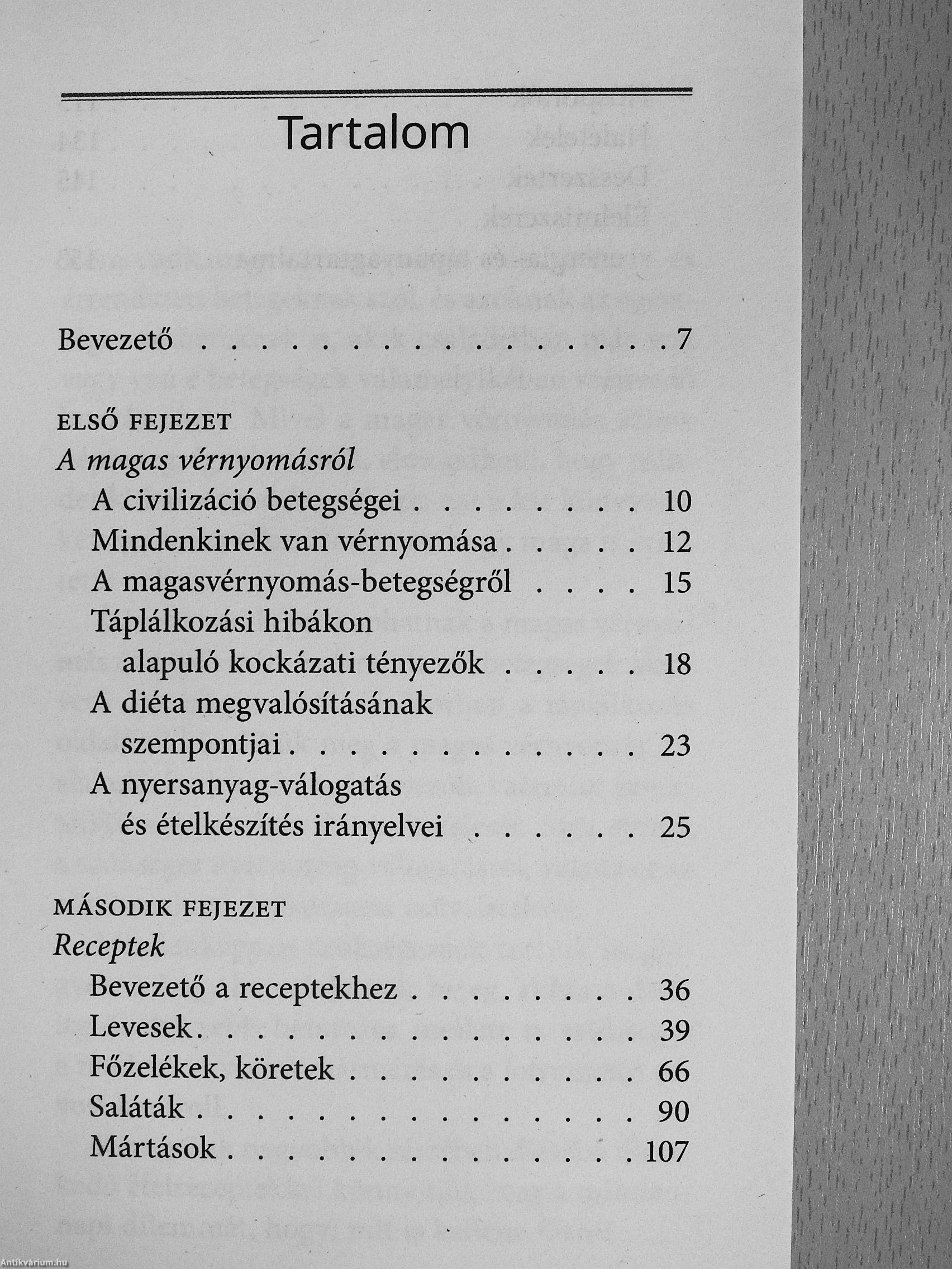 Fókuszban a magas vérnyomás/Egészséges táplálkozással a hipertónia ellen/Metabolikus X-szindróma, avagy az ijesztő négyesfogat/Táplálkozási hibák, kockázati tényezők/Jó megoldás a szimpatikus, sószegény diéta/Ízletes, könnyű receptek, alkalmazott konyhatechnika/Élelmiszerek energia- és tápanyagtartalma