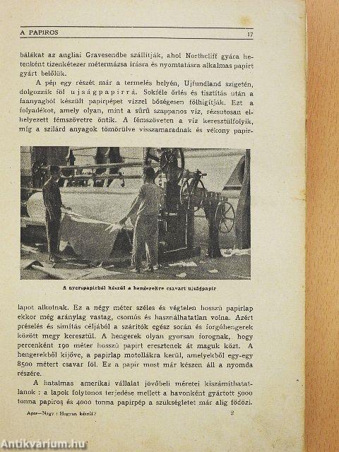 Az emberi találékonyságnak egyik legnagyobb sikere a papirgyártás feltalálása volt. Az ember szava csak oda juthat el a maga tudásával, közölni valójával, hírével, ahová maga is elmegy és ahol maga adja tovább. A papiron azonban egyszerre ezer meg ezer helyen, milliónyi ember előtt jelenhetik meg nemcsak az esemény közlése, hanem a látható képe is. A papiros tehát az az eszköz, amely nélkül semmi sem lehet igazán, teljesen ismertté, népszerűvé. Amíg a tanítás, a tudomány terjesztése csak az élőszóra szorítkozott, nem is volt általános a műveltség. De amióta papirra vethetjük és tömérdek mennyiségben kinyomtatva terjeszthetjük a hasznos tudnivalókat, azóta minden olvasni tudó ember könnyen megismerheti nemcsak a világ folyását, nemcsak az újabb meg újabb találmányokat és felfedezéseket, hanem megismerheti a gyakorlati életet, kihámozhatja belőle a maga javát és kikerülheti azt, ami kárára lehet. A papir tehát a gondolatok közlésének és az általános tájékoztatás módjának legfőbb eszköze és nagyon kevés ember élvezhetné a világ meg az élet megismerésének az előnyeit, ha ez az igazán legolcsóbb eszköz nem állna rendelkezésünkre. A régi időkben is voltak szerszámok, amelyekkel a nevezetesebb dolgokat megörökítették. A babiloni ásatások cseréptáblákra égetett feljegyzéseket hoztak napvilágra. Vissza