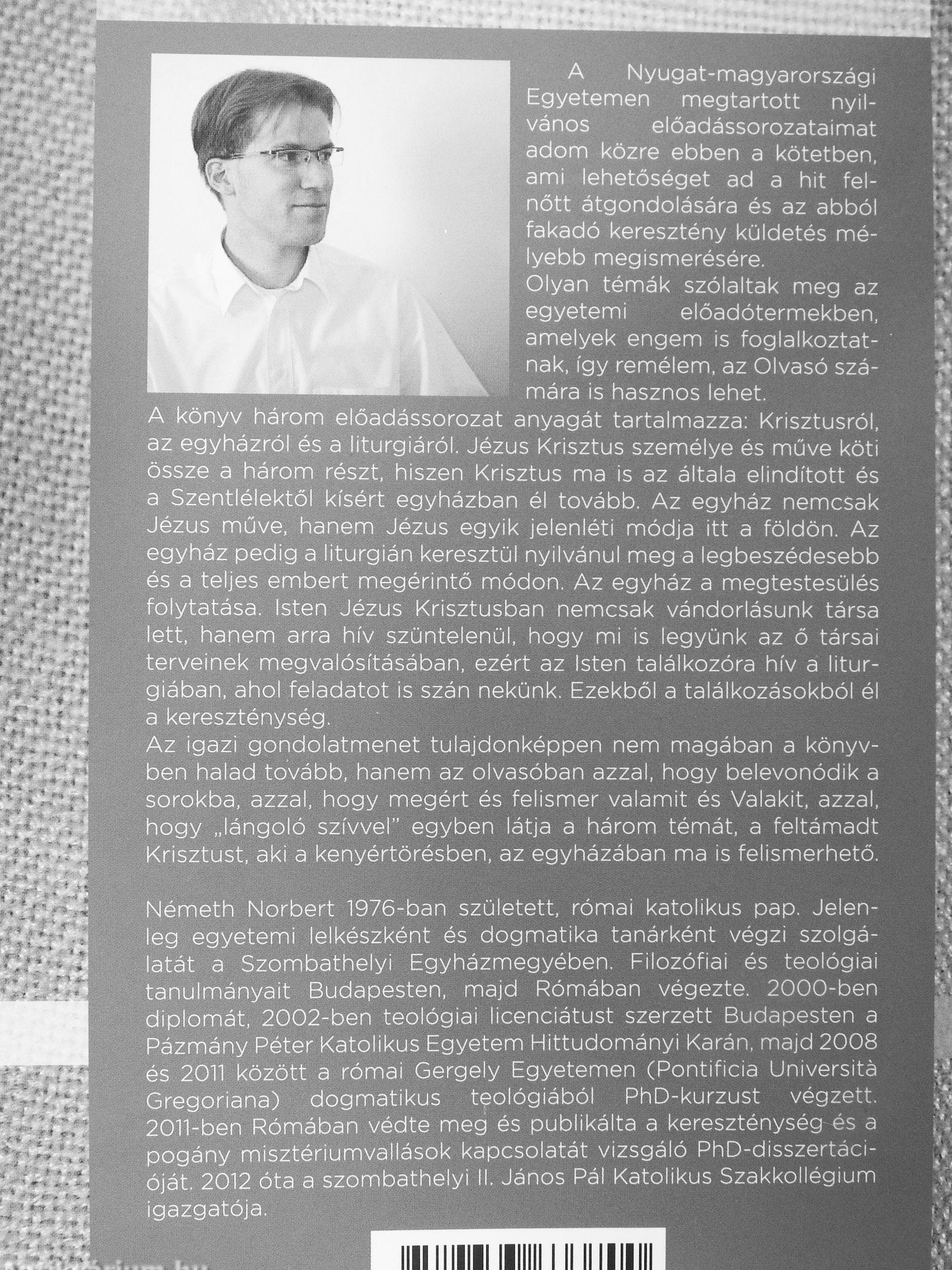 Németh Norbert 1976-ban született, római katolikus pap. Jelenleg egyetemi lelkészként és dogmatika tanárként végzi szolgálatát a Szombathelyi Egyházmegyében. Filozófiai és teológiai tanulmányait Budapesten, majd Rómában végezte. 2000-ben diplomát, 2002-ben teológiai licenciátust szerzett Budapesten a Pázmány Péter Katolikus Egyetem Hittudományi Karán, majd 2008 és 2011 között a római Gergely Egyetemen (Pontificia Universitá Gregoriana) dogmatikus teológiából PhD-kurzust végzett. 2011-ben Rómában védte meg és publikálta a kereszténység és a pogány misztériumvallások kapcsolatát vizsgáló PhD-disszertáci-óját. 2012 óta a szombathelyi II. János Pal Katolikus Szakkollégium igazgatója. ¦ - - .