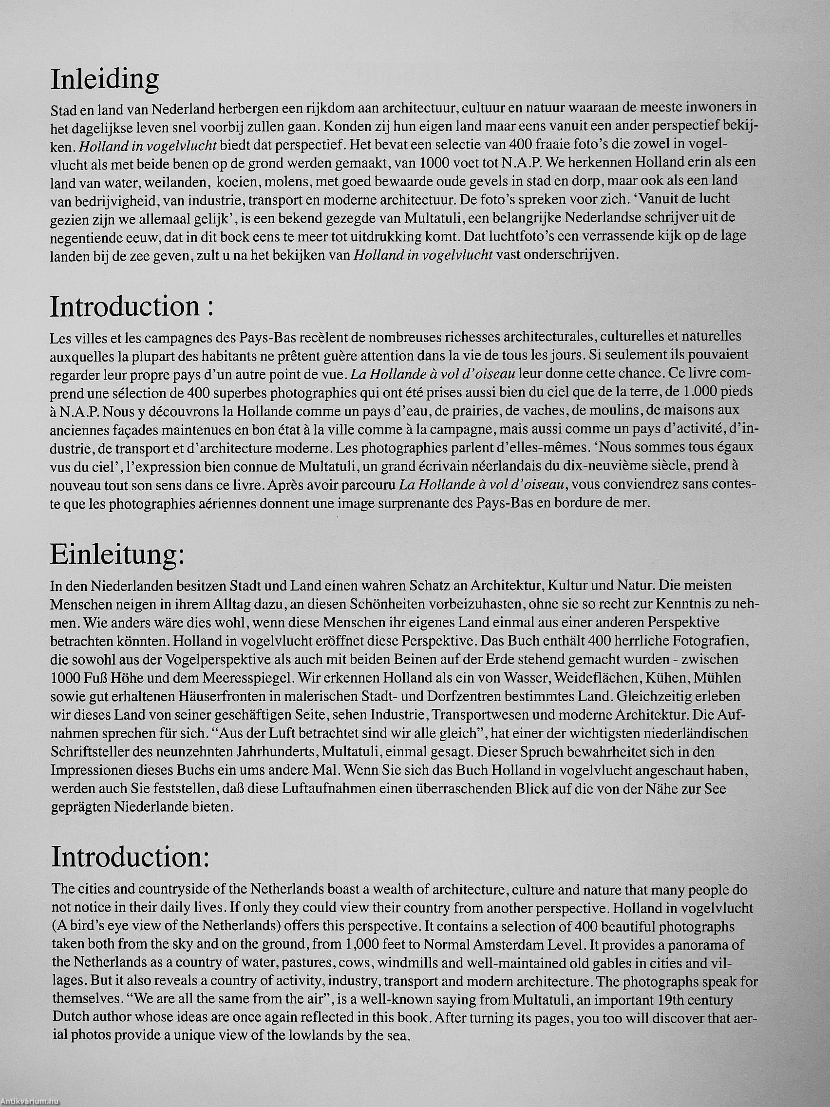 Holland in vogelvlucht im^xm^ une sélection de 400 belles photographies qui ont été prises aussi bien du ciel que de la terre, de 1.000 pieds a N.A.P. Nous y découvrons la Hollande comme un poys d'eau, de prairies, de moulins, de maisons aux anciennes façades maintenues en bon état a la ville comme a la campagne, mais aussi comme un pays d'activité, d'industrie, de transport et d'architecture moderne.