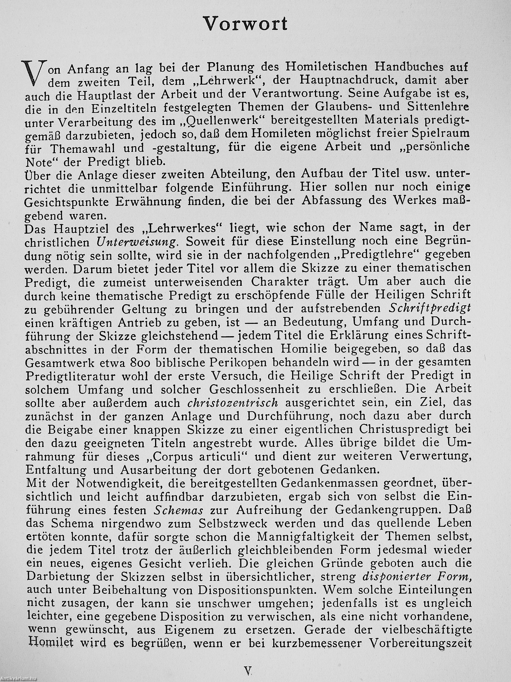 Das »Lehrwerk« zielt in erster Linie auf die christliche Unterweisung ab. Deshalb erscheint bei jedem Titel die Skizze zu einer thematischen Predigt. Außerdem ist besonders auf die Schriftpredigt abgehoben. Darum gibt es unter jedem Titel eine Homilie — insgesamt etwa 800I — über einen Schriftabschnitt. Die christozentrische Haltung offenbart sich in der gesamten Anlage, Ordnung und Durchführung, besonders noch in den bei geeigneten Titeln angefügten Skizzen zu einer Christus-Predigt.