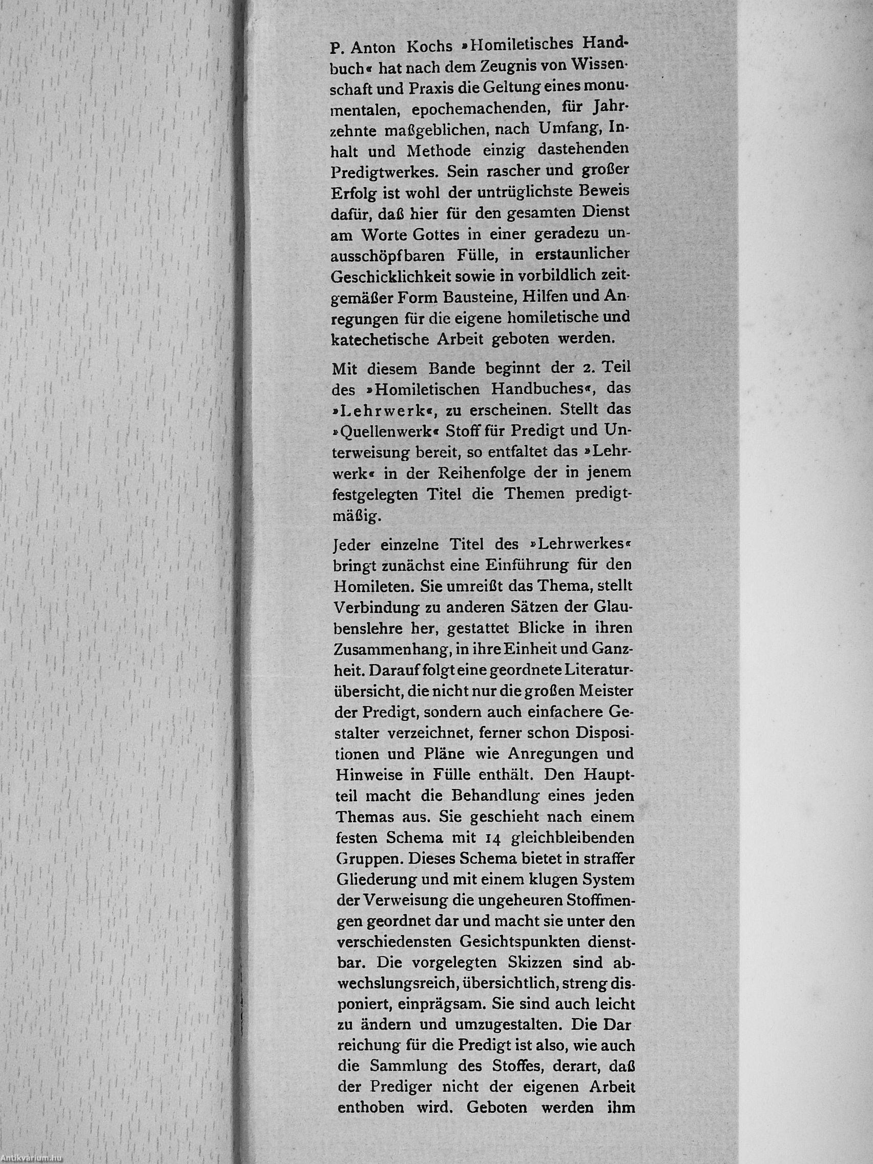P. Anton Kochs »Homiletisches Handbuch« hat nach dem Zeugnis von Wissenschaft und Praxis die Geltung eines monumentalen, epochemachenden, für Jahrzehnte maßgeblichen, nach Umfang, Inhalt und Methode einzig dastehenden Predigtwerkes. Sein rascher und großer Erfolg ist wohl der untrüglichste Beweis dafür, daß hier für den gesamten Dienst am Worte Gottes in einer geradezu un-ausschöpfbaren Fülle, in erstaunlicher Geschicklichkeit sowie in vorbildlich zeitgemäßer Form Bausteine, Hilfen und Anregungen für die eigene homiletische und katechetische Arbeit geboten werden.