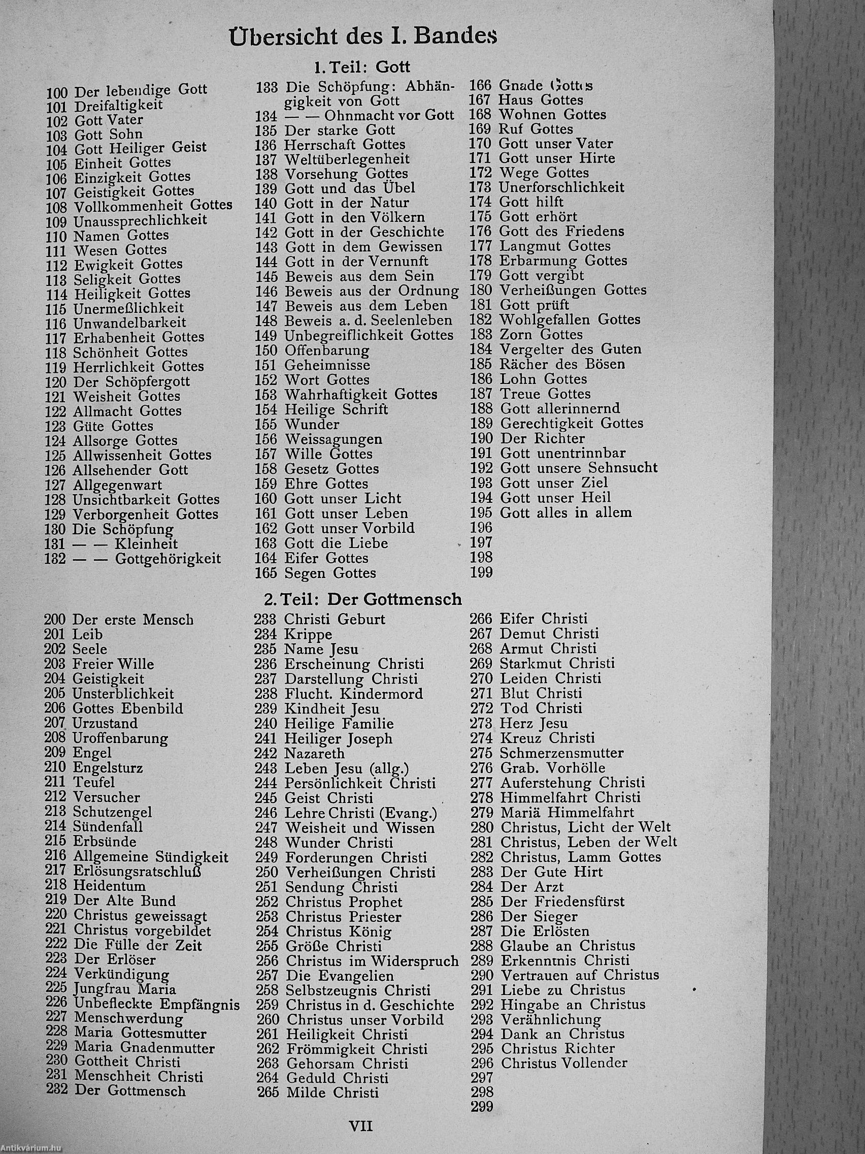 Der ganze Inhalt katholischer Glaubens- und Lebenslehre ist im Quellenwerk wie im Lehrwerk in acht organisch gegliederte Teile zerlegt: Gott, Christus, Kirche, Gnade, Leben aus Gott, Gemeinschaftsleben, eigenpersönliches Leben, Vollkommenheitsleben. Jeder dieser Teile, von denen je zwei zu einem Bande zusammengefaßt sind, entfaltet sein Grundthema in rund loo systematisch geordneten Titeln. Das Quellenwerk bietet zu diesen Titeln in sinnvoller, übersichtlicher Anordnung den Stoff aus der Heiligen Schrift, aus den Äußerungen des kirchlichen Lehramtes, aus den Schriften der Kirchenväter und der Heiligen, aus den Werken von Dichtern, Denkern und Forschern. Im Anschluß daran wird eine Fülle von Bildern und Beispielen aus der Heiligen Schrift, aus dem Leben der Heiligen, aus Welt- und Kirchenge-schichte, aus der Kunst und der Dichtung gegeben.