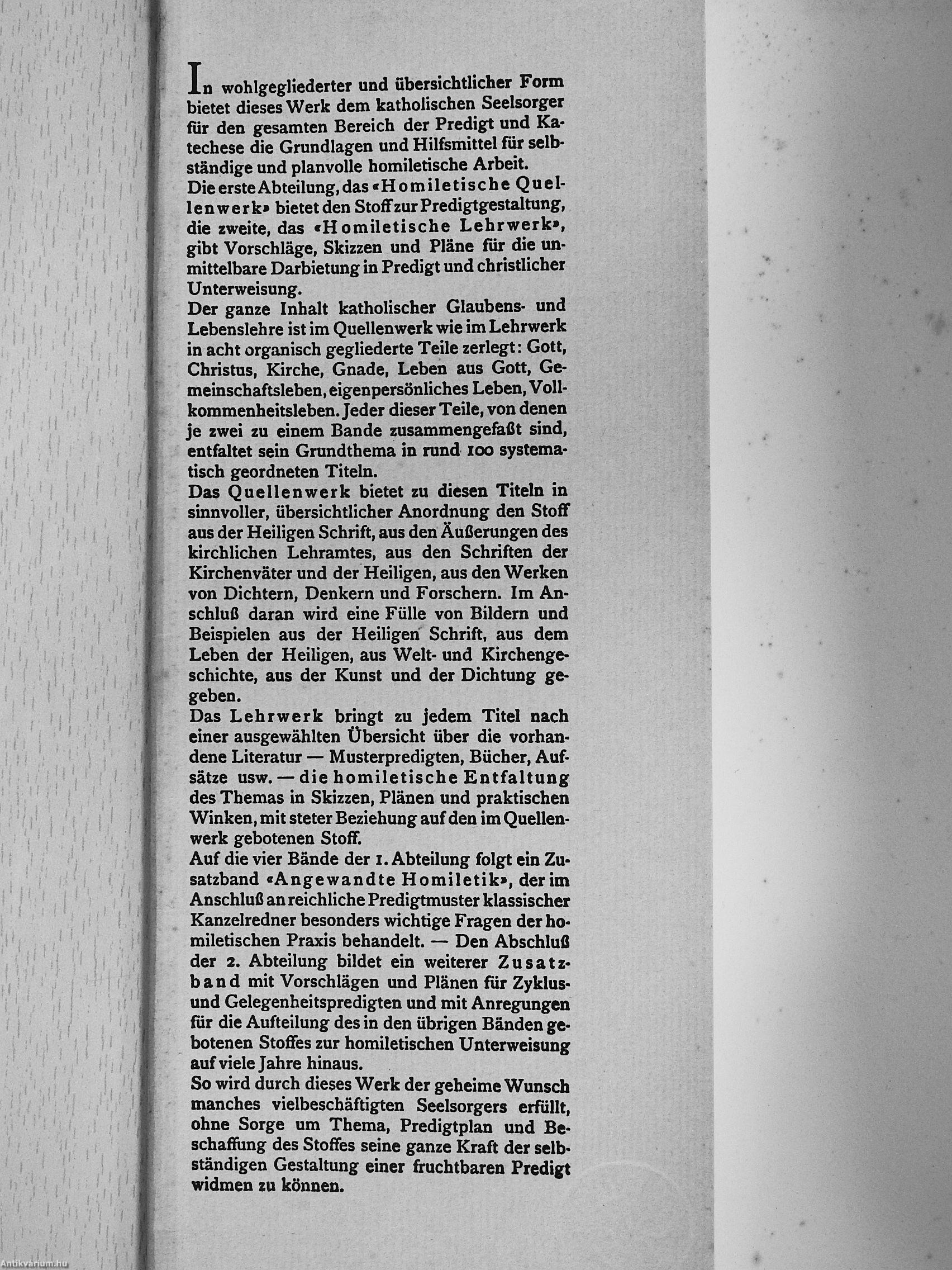 So wird durch dieses Werk der geheime Wunsch manches vielbeschäftigten Seelsorgers erfüllt, ohne Sorge um Thema, Predigtplan und Beschaffung des Stoffes seine ganze Kraft der selbständigen Gestaltung einer fruchtbaren Predigt widmen zu können.