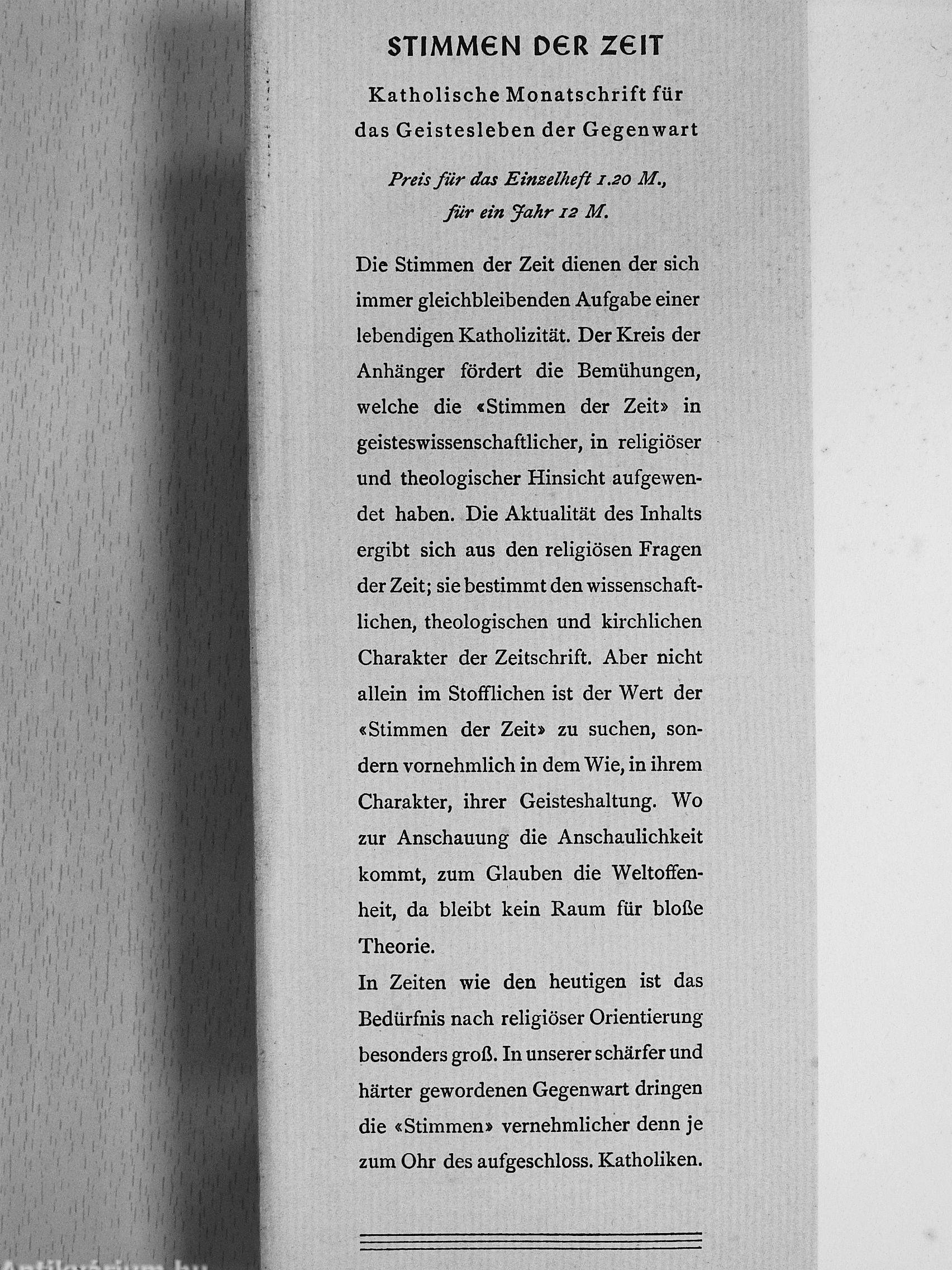 Die Stimmen der Zeit dienen der sich immer gleichbleibenden Aufgabe einer lebendigen Katholizität. Der Kreis der Anhänger fördert die Bemühungen, welche die «Stimmen der Zeit» in geisteswissenschaftlicher, in religiöser und theologischer Hinsicht aufgewendet haben. Die Aktualität des Inhalts ergibt sich aus den religiösen Fragen der Zeit; sie bestimmt den wissenschaftlichen, theologischen und kirchlichen Charakter der Zeitschrift. Aber nicht allein im Stofflichen ist der Wert der «Stimmen der Zeit» zu suchen, sondern vornehmlich in dem Wie, in ihrem Charakter, ihrer Geisteshaltung. Wo zur Anschauung die Anschaulichkeit kommt, zum Glauben die Weltoffen-heit, da bleibt kein Raum für bloße Theorie.