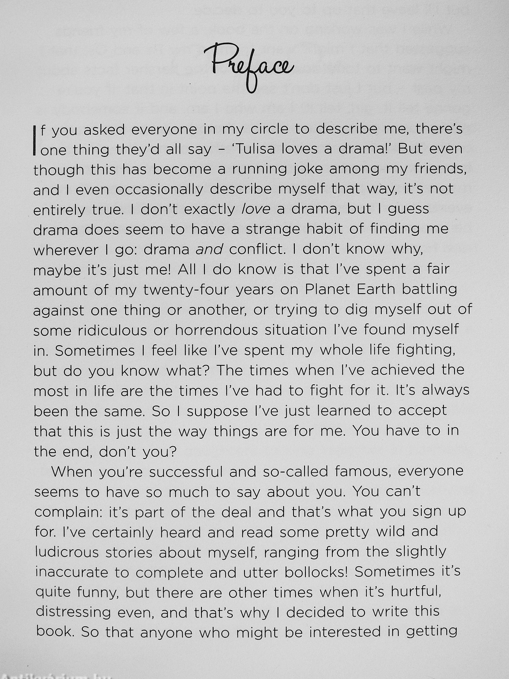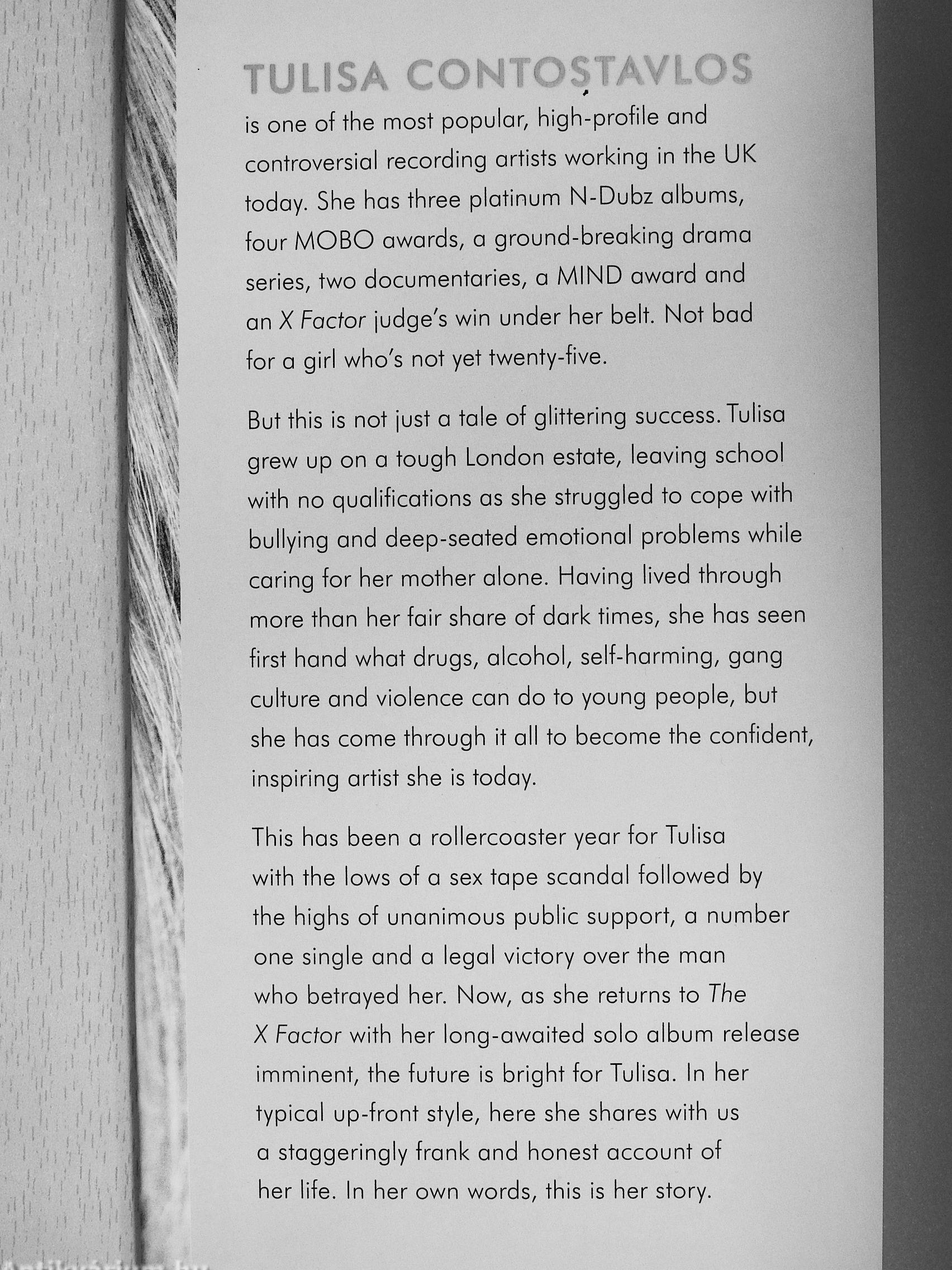 This has been a rollercoaster year for Tulisa with the lows of a sex tape scandal followed by the highs of unanimous public support, a number one single and a legal victory over the man who betrayed her. Now, as she returns to The X Factor with her long-awaited solo album release imminent, the future is bright for Tulisa. In her typical up-front style, here she shares with us a staggeringly frank and honest account of her life. In her own words, this is her story.