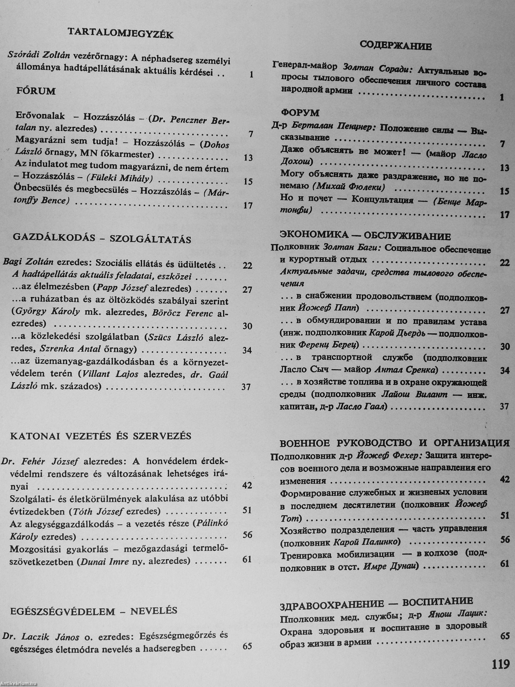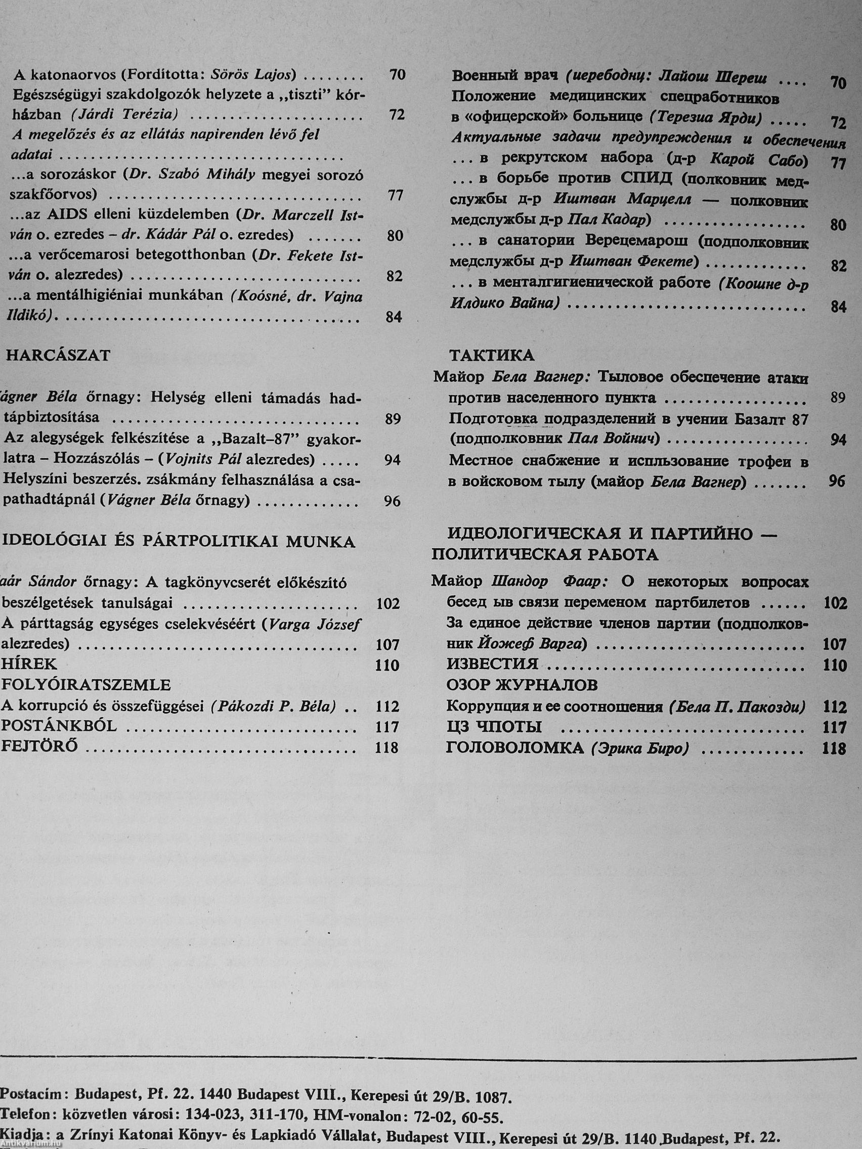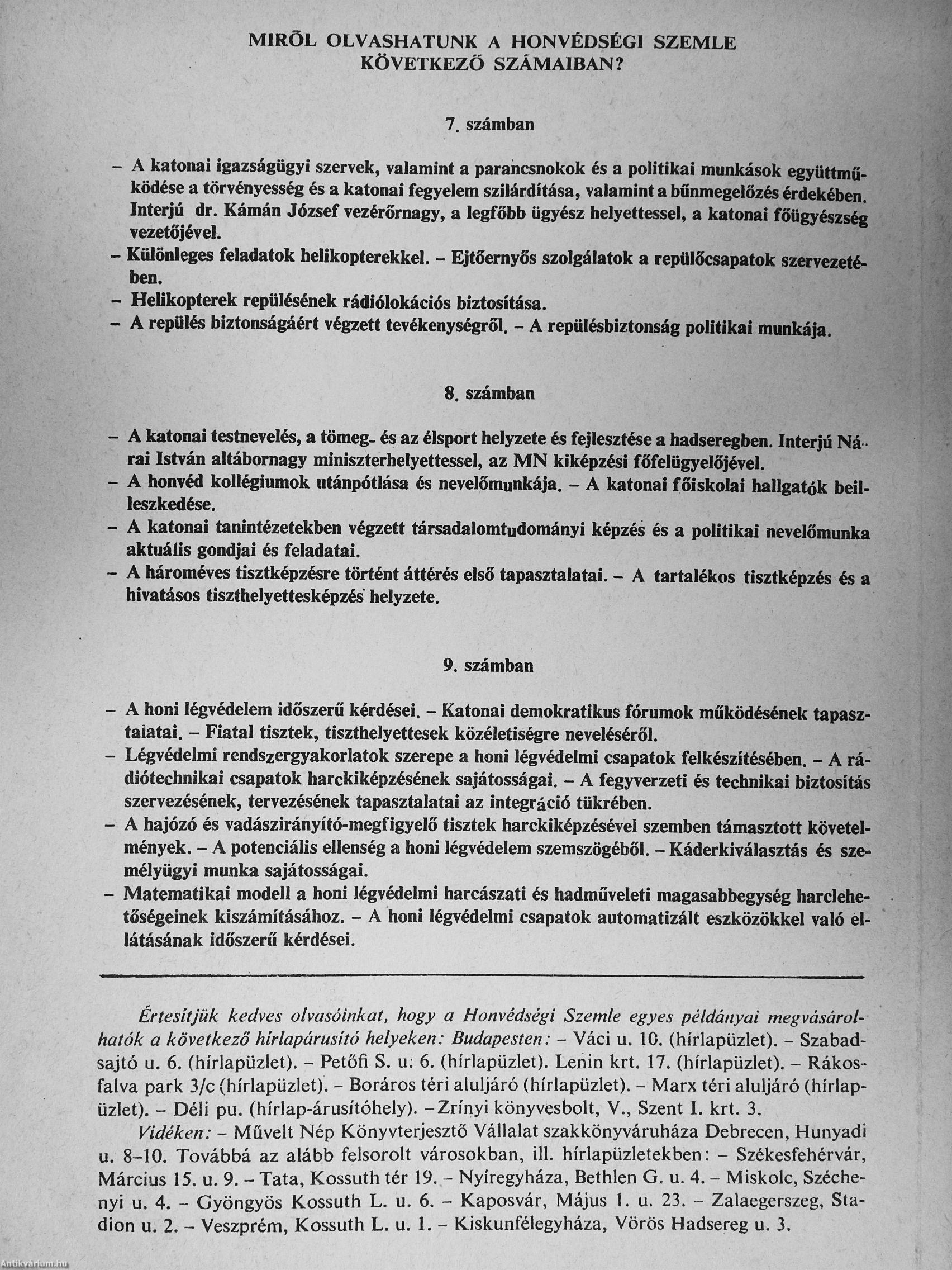 Értesítjük kedves olvasóinkat, hogy a Honvédségi Szemle egyes példányai megvásárolhatók a következő hírlapárusító helyeken: Budapesten: - Váci u. 10. (hírlapüzlet). - Szabadsajtó u. 6. (hírlapüzlet). - Petőfi S. u: 6. (hírlapüzlet). Lenin krt. 17. (hírlapüzlet). - Rákosfalva park 3/c (hírlapüzlet). - Boráros téri aluljáró (hírlapüzlet). - Marx téri aluljáró (hírlapüzlet). - Déli pu. (hírlap-árusítóhely). -Zrínyi könyvesbolt, V., Szent 1. krt. 3.